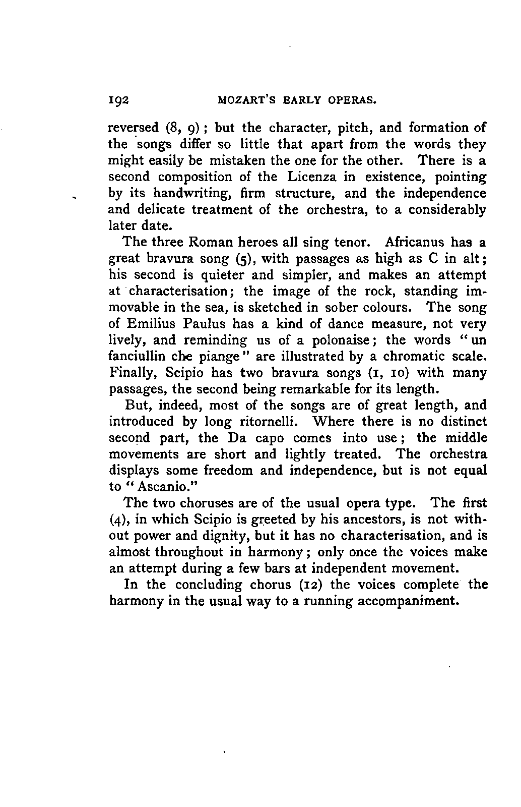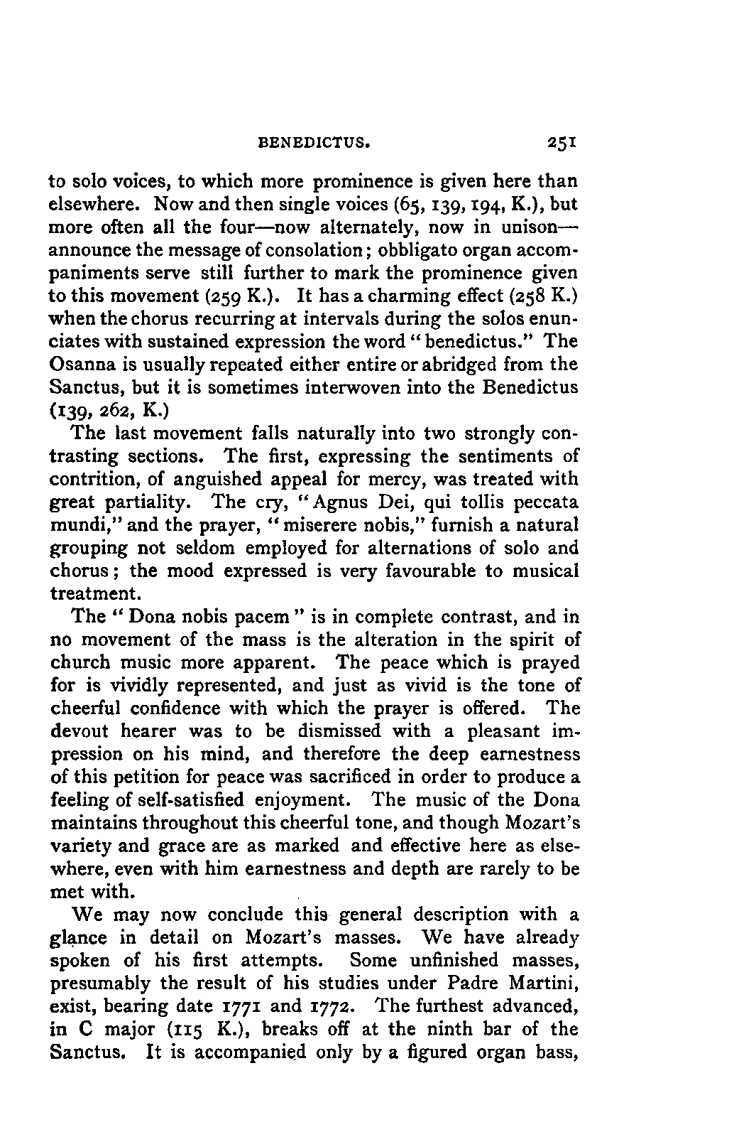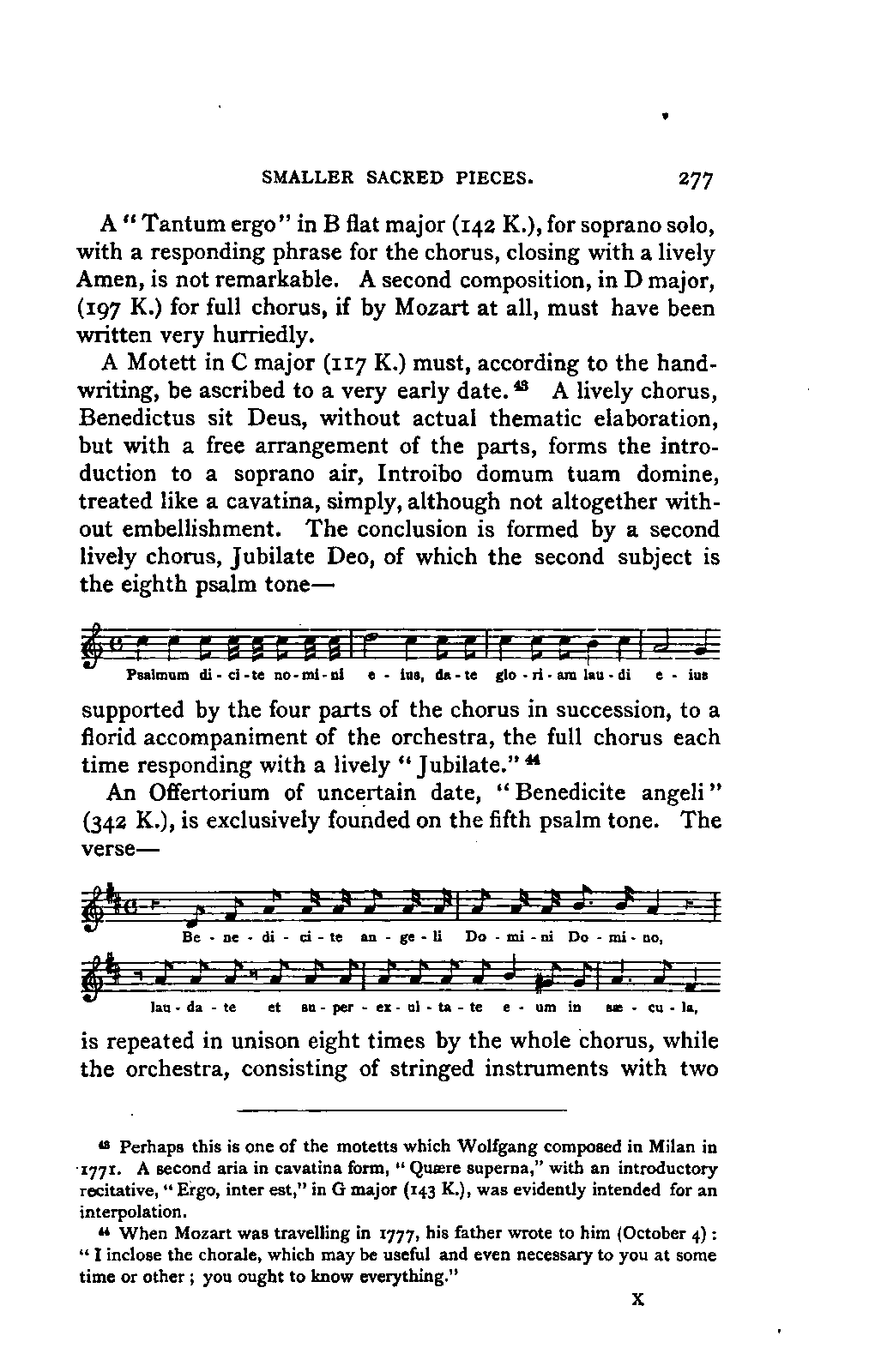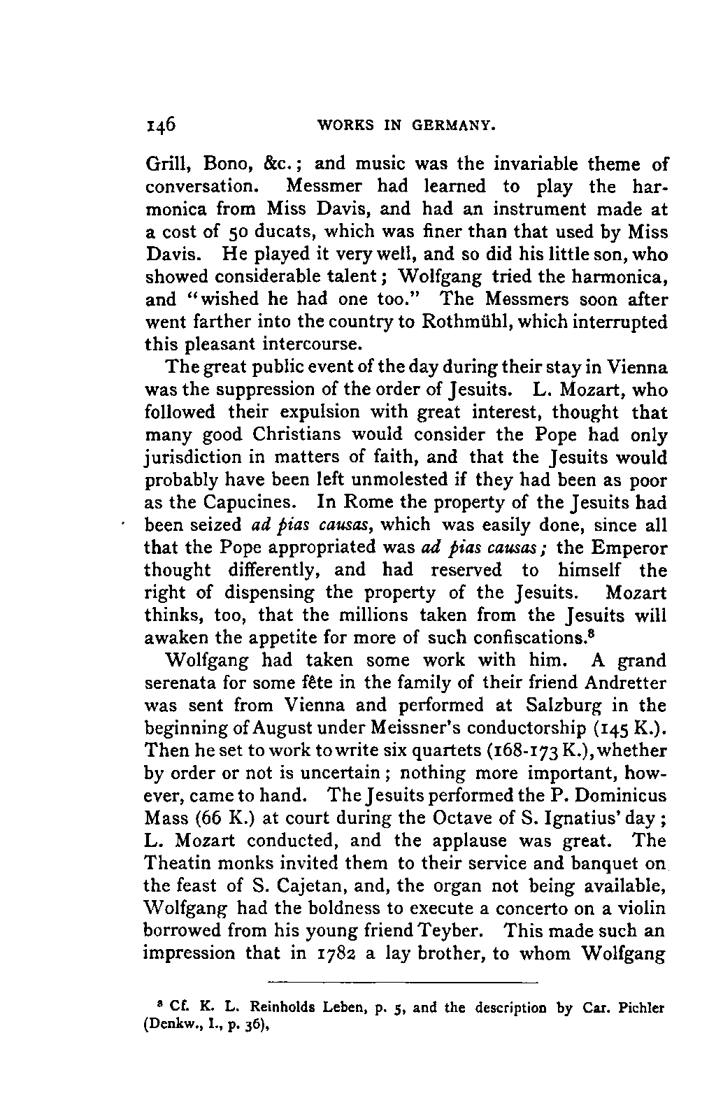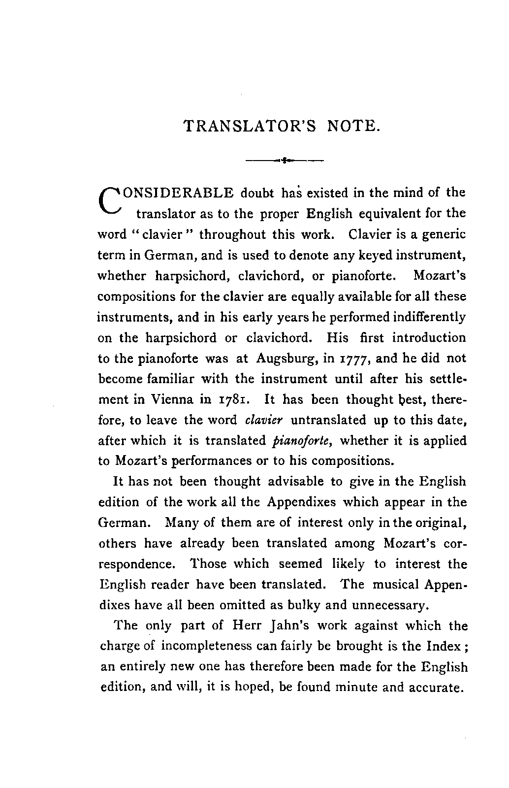 Such a work may well be called an Encyclopaedia; and to have steered through this ocean of material as Jahn has PREFACE. [p6] done, never losing the thread of the narrative, and maintaining the interest in the hero throughout, implies no ordinary tact and skill; for the book is remarkably readable, and there are few pages which are not enlivened by some anecdote or lifelike touch. Nor is it less remarkable for accuracy than for the other qualities already mentioned. The writer has used it constantly for many years, and has never yet discovered a mistake of any moment. Perhaps it would have been better if the secondary treatises of which we have spoken had been relegated to Appendixes; but this is directly opposed to the German method, and we must accept the work as we have it. There are indeed already nineteen Appendixes to the original work, as follows i. Family documents. 2. Marianne Mozart. 3. Testimonials, eulogistic poems, articles, &c. 4. Dedications. 5. Mozart's letters on his journeys. 6. Text of his church music. 7. Arrangements and adaptations of ditto. 8. His cousins. 9. Mozart as a comic poet. 10. Mozart and Vogler. 11. A letter of Leopold Mozart's. 12. Mozart's letters on the death of his mother. 13. The choruses for "King Thamos." 14. The text of "Idomeneo." 15. Alterations in that opera. 16. Mozart's letters to his wife. 17. The Requiem. 18. Mozart's residences in Vienna. 19. Portraits. Of these it has been considered necessary to retain only Nos. 2, 7, and 19, which form Appendixes 1, 2, and 3 of the present edition. Another has been added: namely, a classified list of the whole of his works, according to the complete edition now in course of publication, with the references to the invaluable Catalogue of Köchel. With these exceptions the English translation is exactly in accordance with the German original.