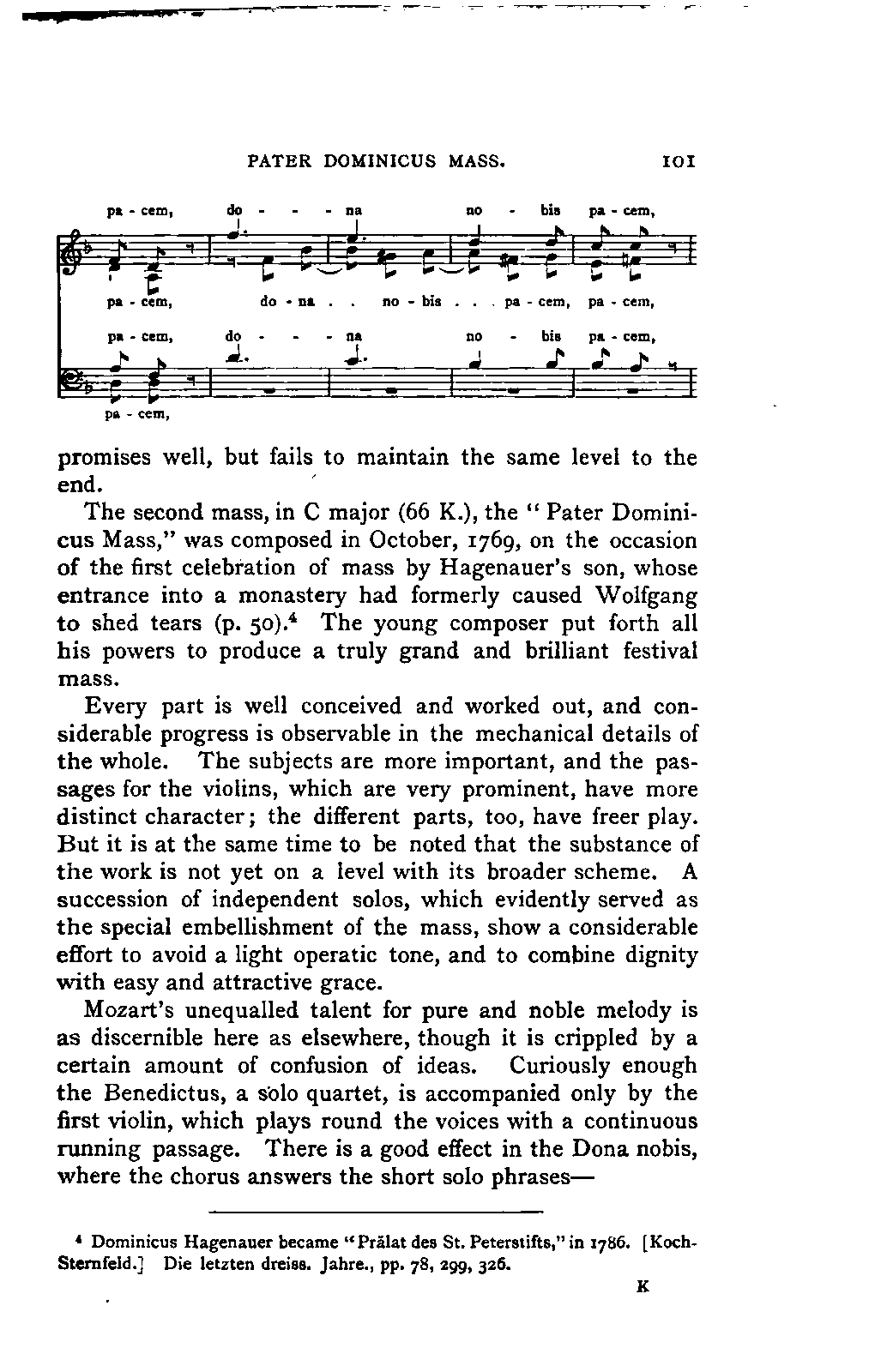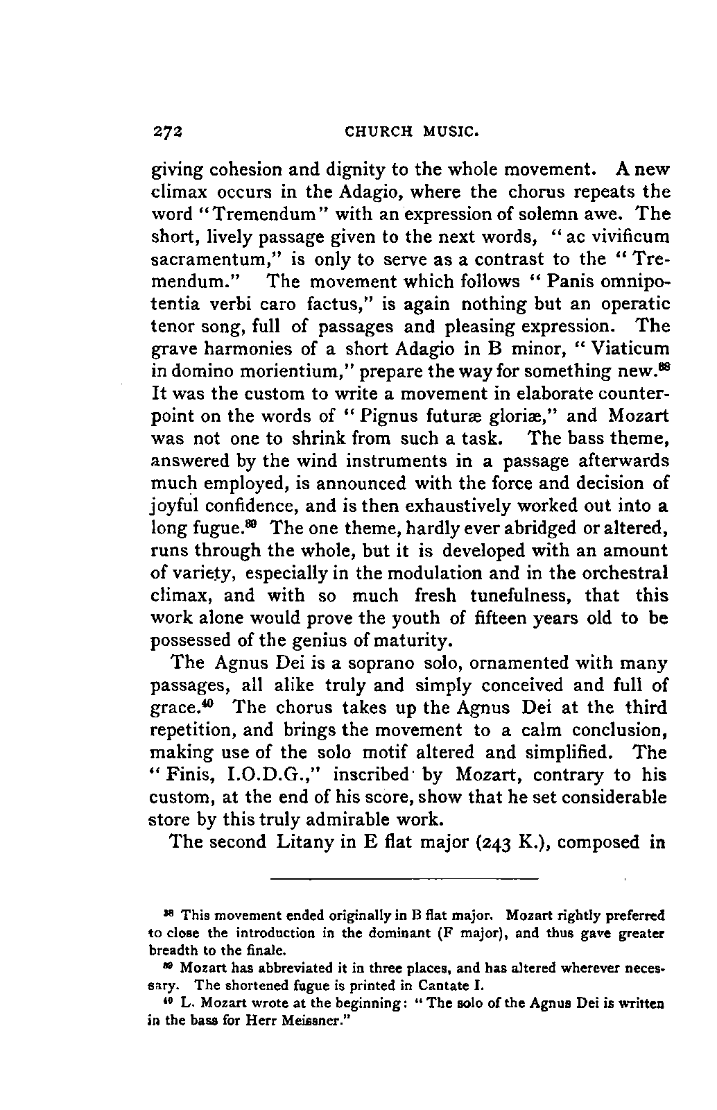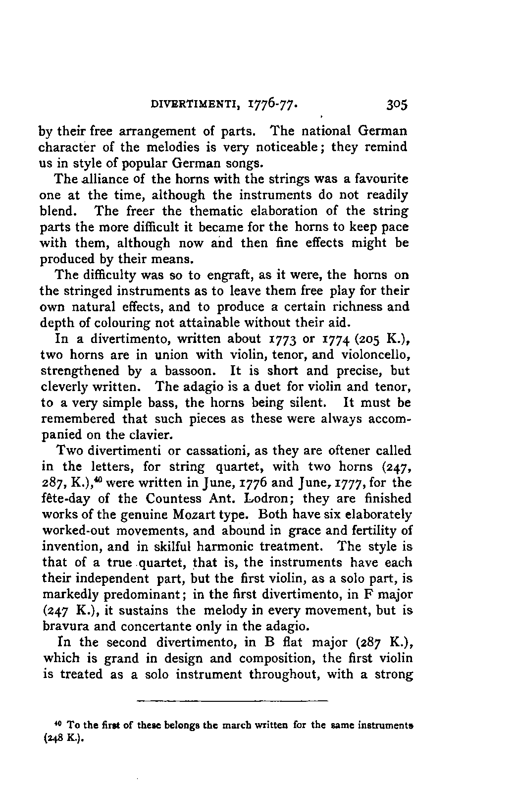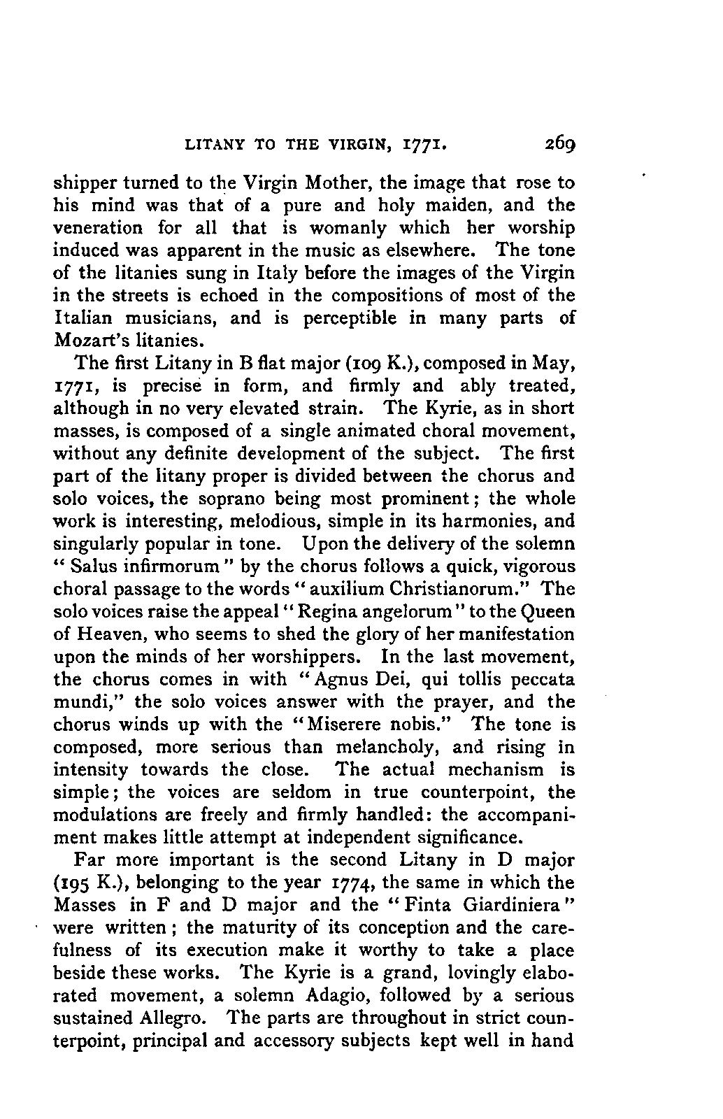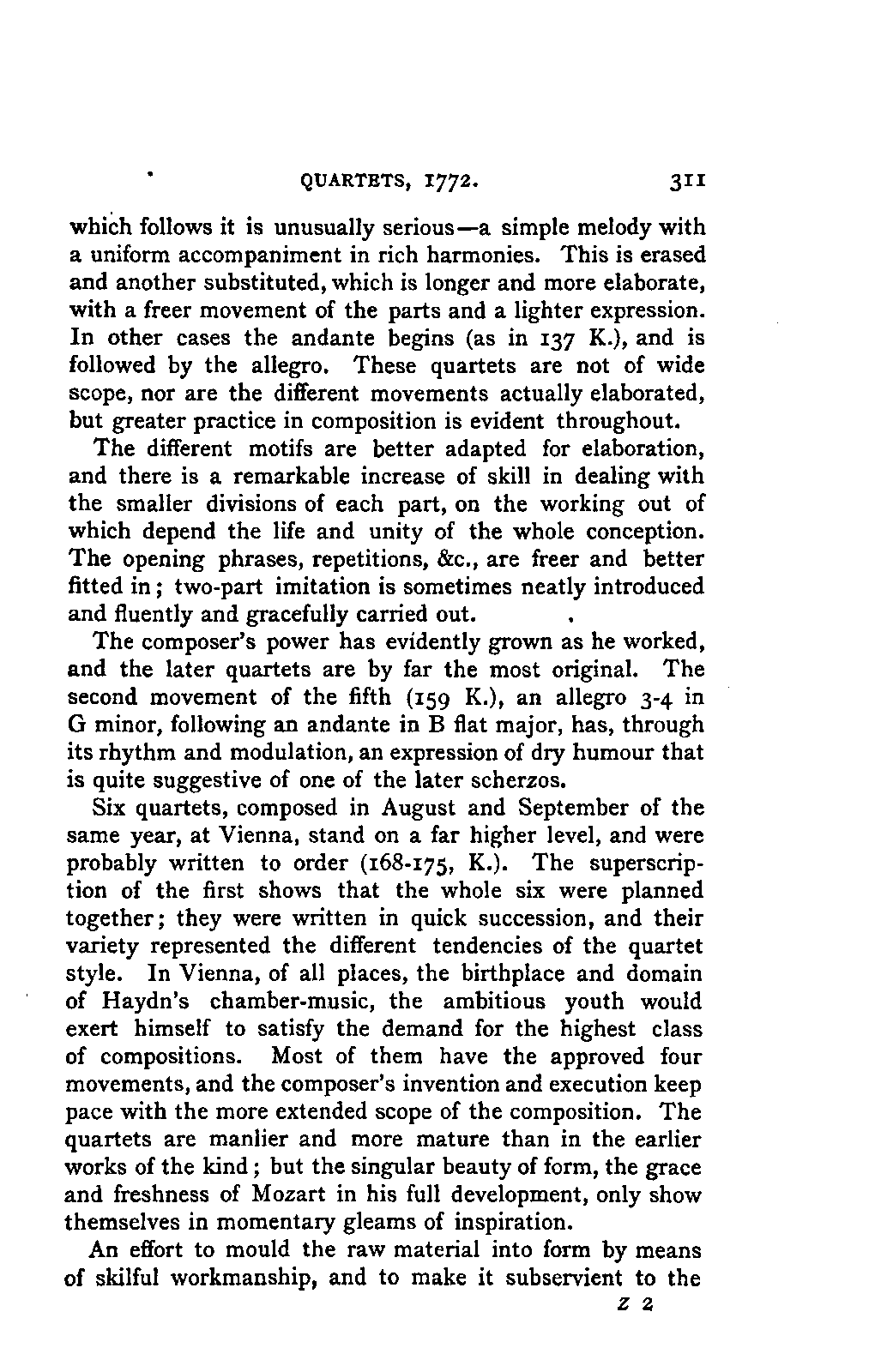 Such a work may well be called an Encyclopaedia; and to have steered through this ocean of material as Jahn has PREFACE. [p6] done, never losing the thread of the narrative, and maintaining the interest in the hero throughout, implies no ordinary tact and skill; for the book is remarkably readable, and there are few pages which are not enlivened by some anecdote or lifelike touch. Nor is it less remarkable for accuracy than for the other qualities already mentioned. The writer has used it constantly for many years, and has never yet discovered a mistake of any moment. Perhaps it would have been better if the secondary treatises of which we have spoken had been relegated to Appendixes; but this is directly opposed to the German method, and we must accept the work as we have it. There are indeed already nineteen Appendixes to the original work, as follows i. Family documents. 2. Marianne Mozart. 3. Testimonials, eulogistic poems, articles, &c. 4. Dedications. 5. Mozart's letters on his journeys. 6. Text of his church music. 7. Arrangements and adaptations of ditto. 8. His cousins. 9. Mozart as a comic poet. 10. Mozart and Vogler. 11. A letter of Leopold Mozart's. 12. Mozart's letters on the death of his mother. 13. The choruses for "King Thamos." 14. The text of "Idomeneo." 15. Alterations in that opera. 16. Mozart's letters to his wife. 17. The Requiem. 18. Mozart's residences in Vienna. 19. Portraits. Of these it has been considered necessary to retain only Nos. 2, 7, and 19, which form Appendixes 1, 2, and 3 of the present edition. Another has been added: namely, a classified list of the whole of his works, according to the complete edition now in course of publication, with the references to the invaluable Catalogue of Köchel. With these exceptions the English translation is exactly in accordance with the German original.
