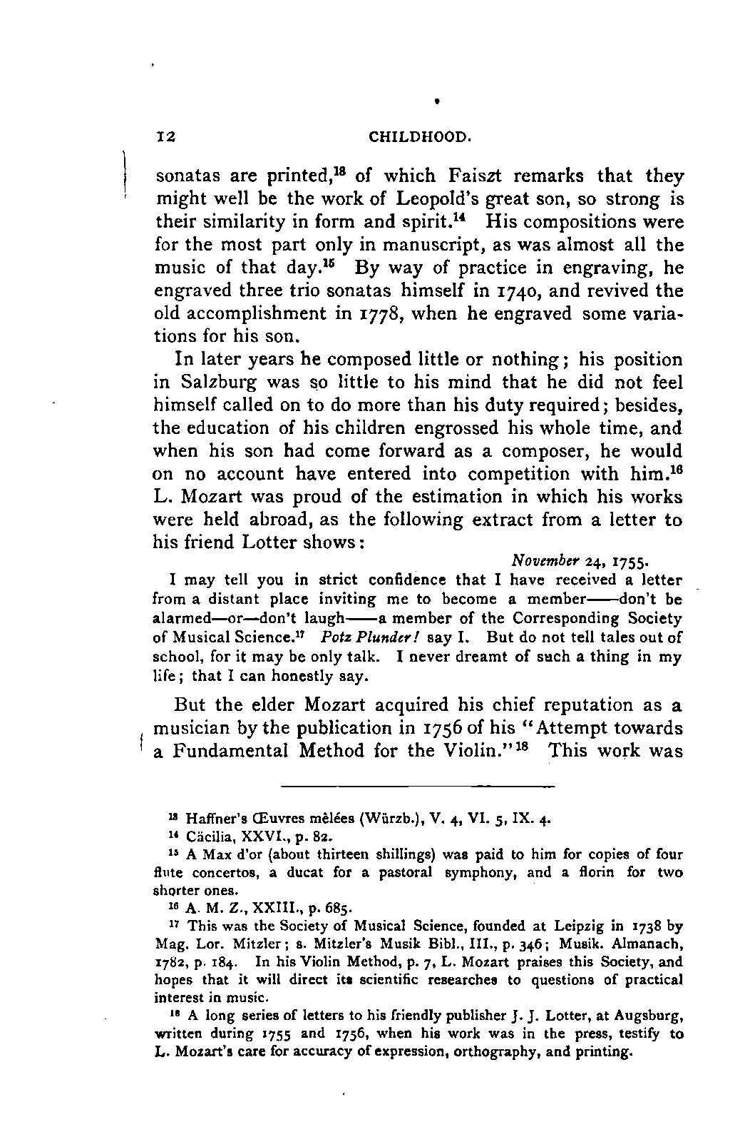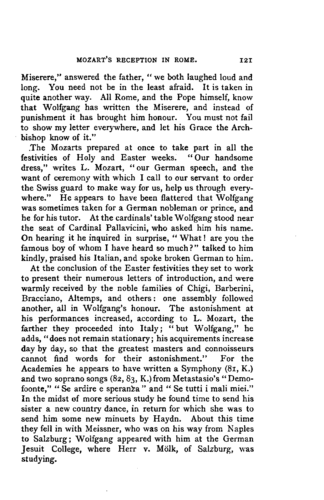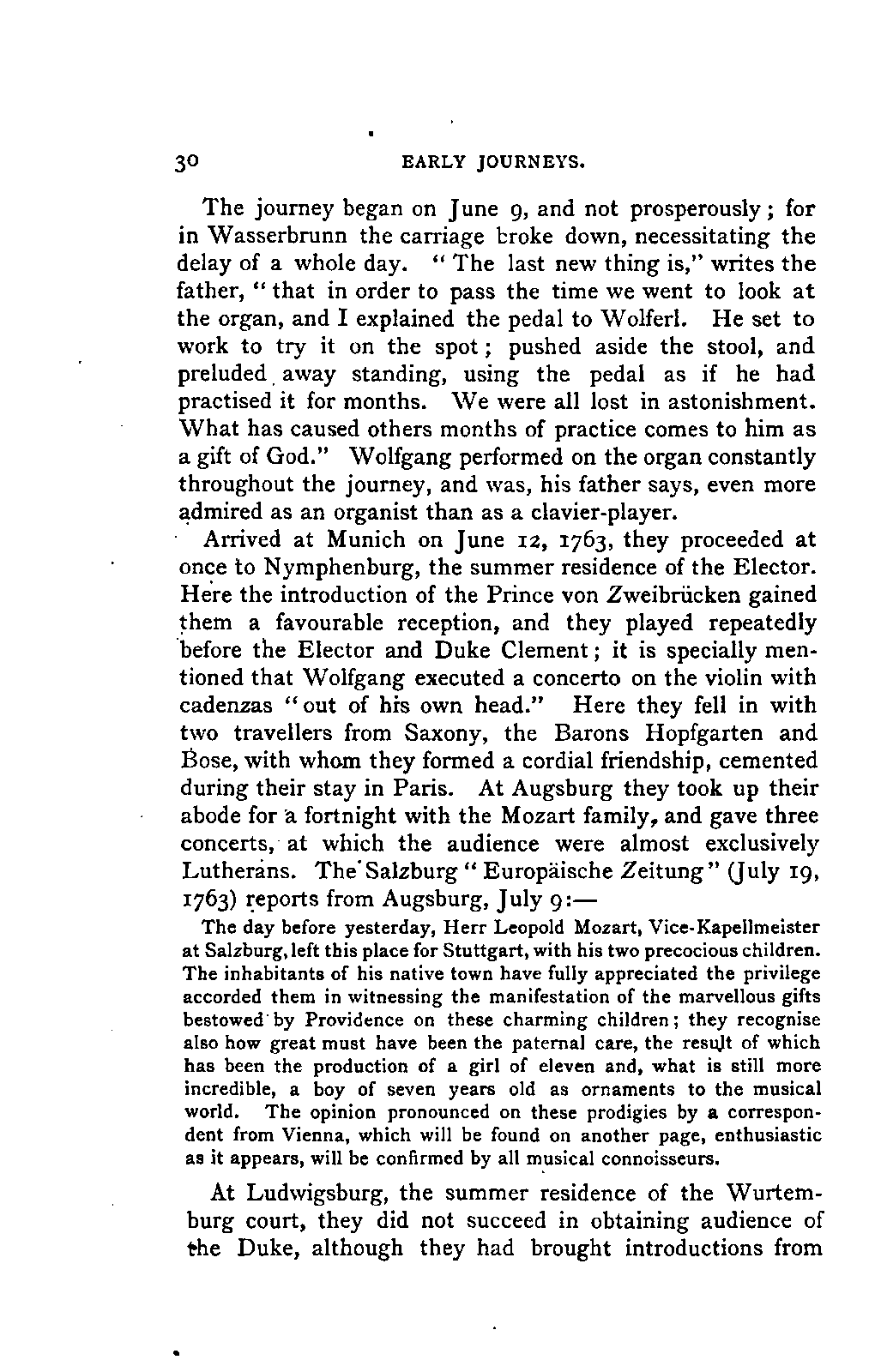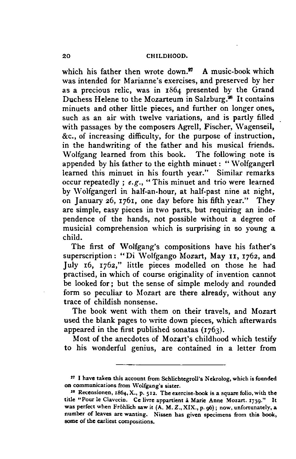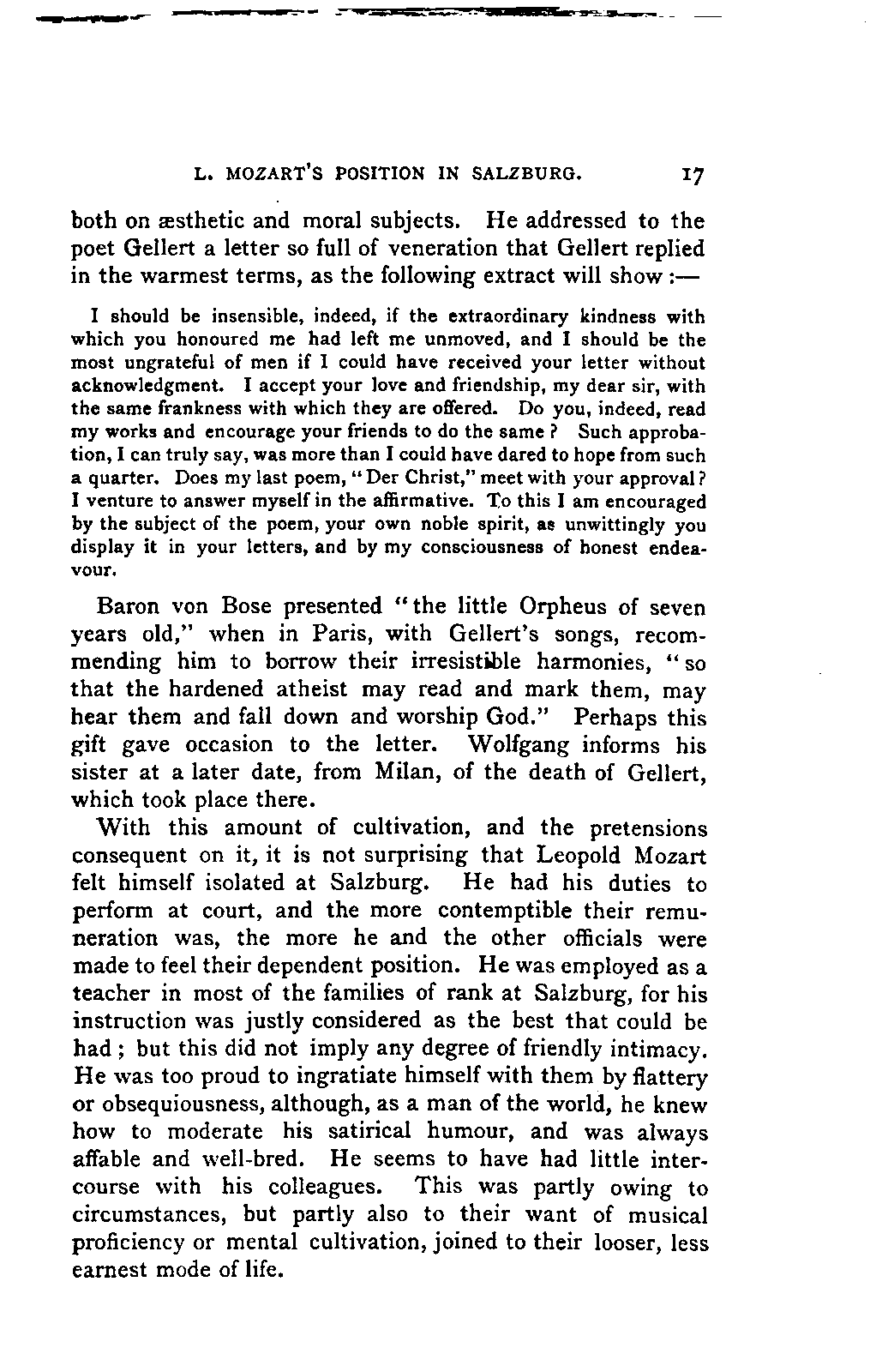 My first aim, then, was the verification and authentication of facts, and their unbiassed statement, so far as this was of interest. The written or authentic verbal traditions of Mozart and his family were here my chief dependence, and, except where some special authority is adduced, Nissen's correspondence forms the basis of my narrative. But since it was my wish to bring together all that appeared of lasting interest, and to dispense with Nissen's collection, for all readers who do not desire to search and prove for themselves, I have, therefore, quoted verbally from the letters wherever it was feasible, and have not hesitated to displace them where it answered my purpose in the narrative. I have in every case indicated the letters by their date, without mentioning whether they have been printed by Nissen or not. (They may be readily referred to in the careful collection of L. Nohl, "Mozarts Briefe": Salzburg, 1865.)