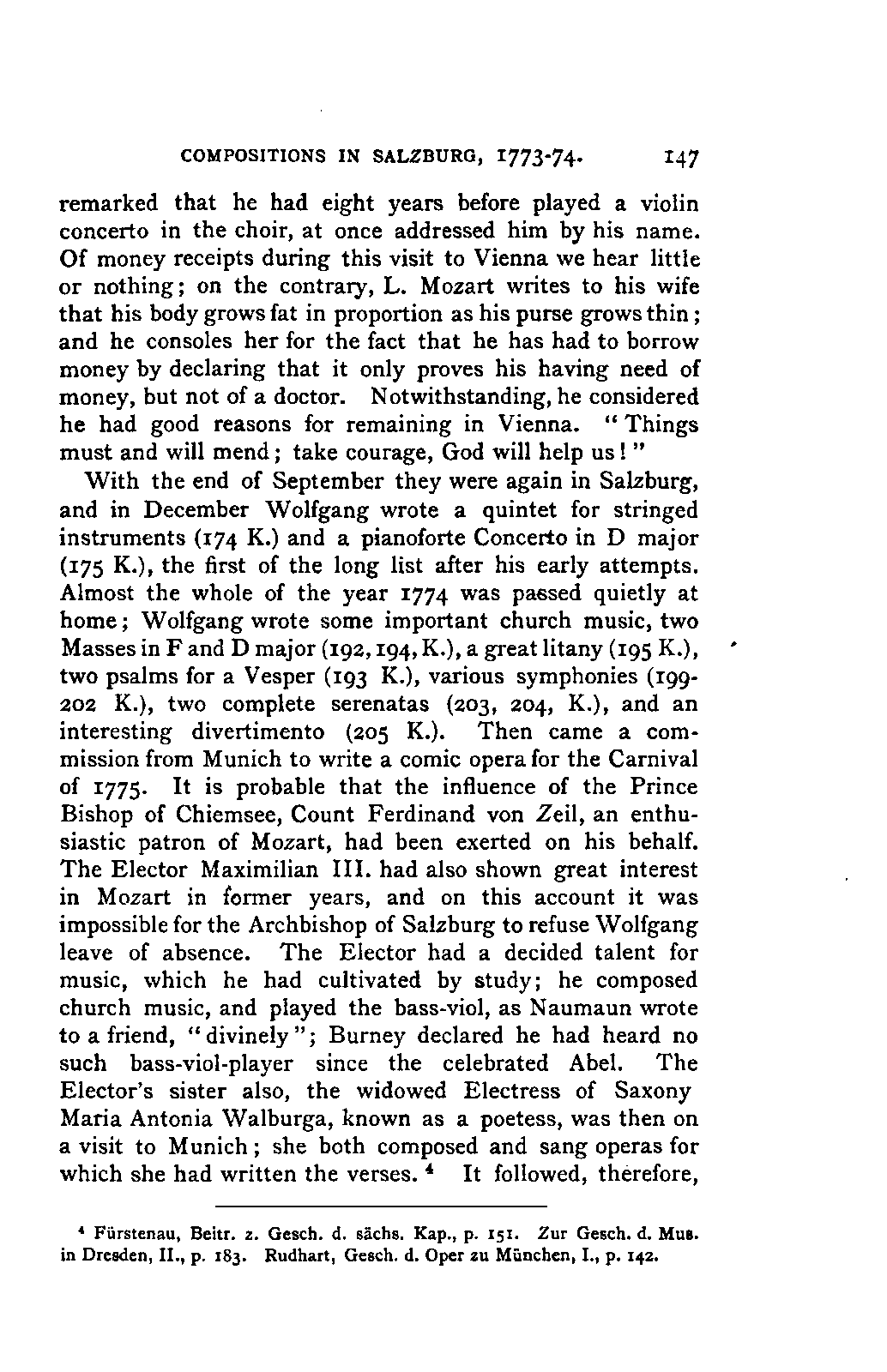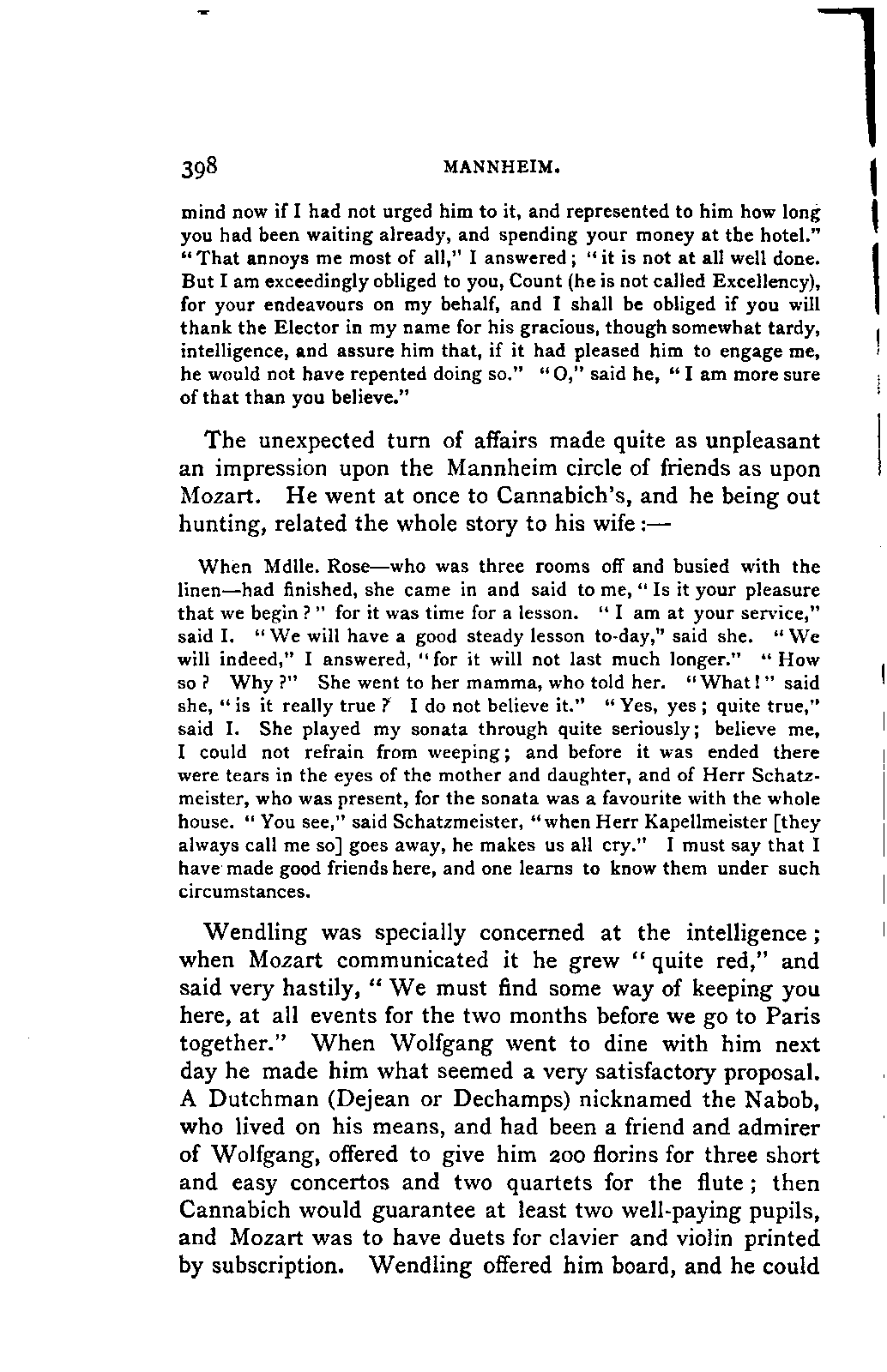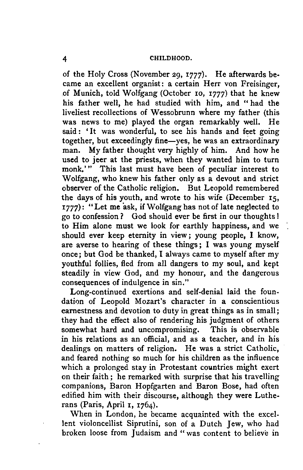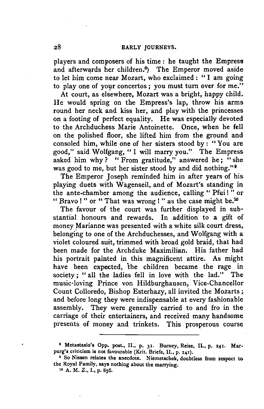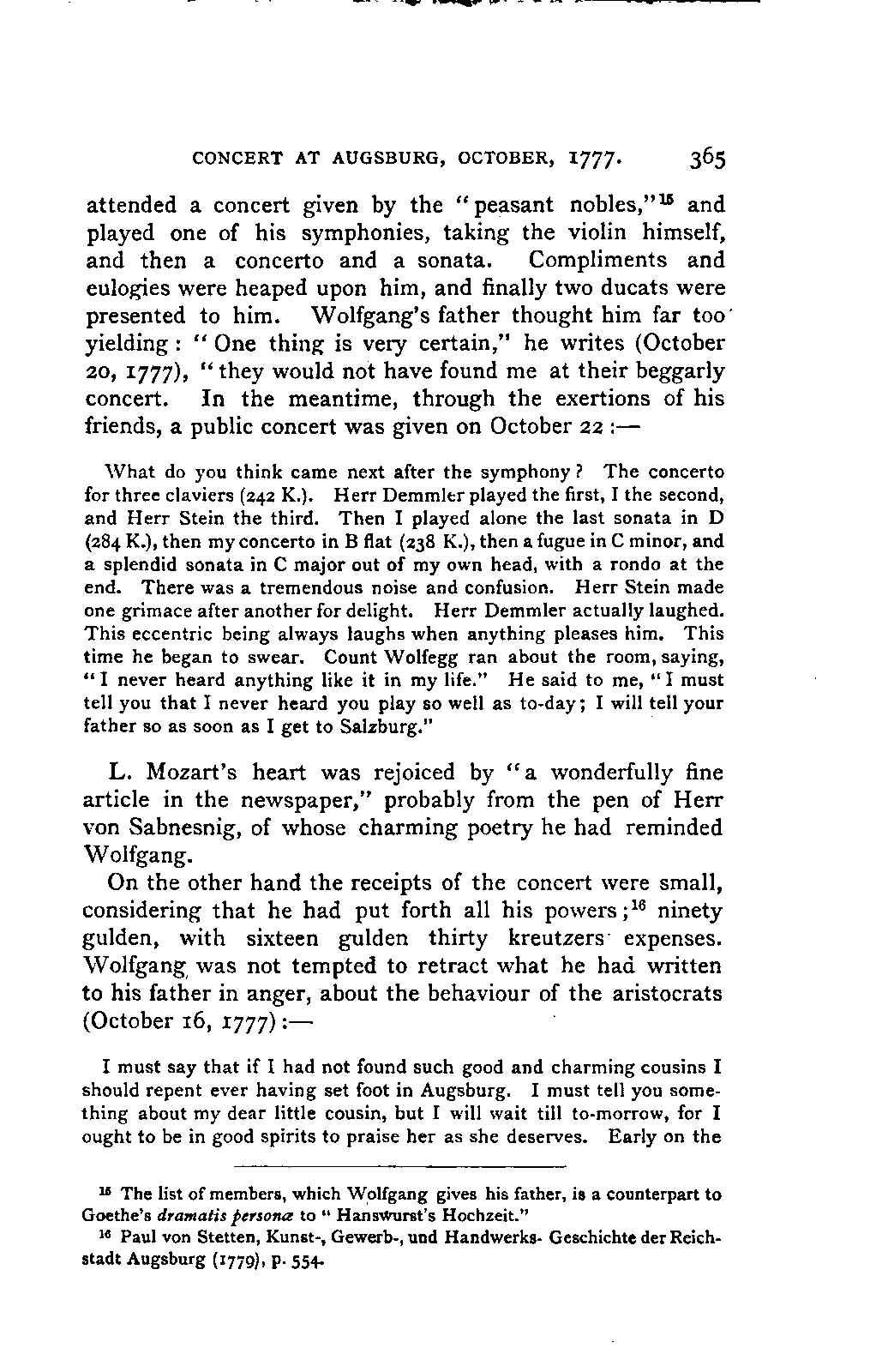 My first aim, then, was the verification and authentication of facts, and their unbiassed statement, so far as this was of interest. The written or authentic verbal traditions of Mozart and his family were here my chief dependence, and, except where some special authority is adduced, Nissen's correspondence forms the basis of my narrative. But since it was my wish to bring together all that appeared of lasting interest, and to dispense with Nissen's collection, for all readers who do not desire to search and prove for themselves, I have, therefore, quoted verbally from the letters wherever it was feasible, and have not hesitated to displace them where it answered my purpose in the narrative. I have in every case indicated the letters by their date, without mentioning whether they have been printed by Nissen or not. (They may be readily referred to in the careful collection of L. Nohl, "Mozarts Briefe": Salzburg, 1865.)
