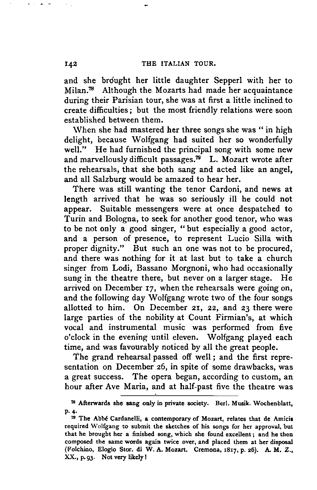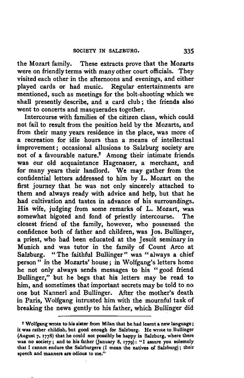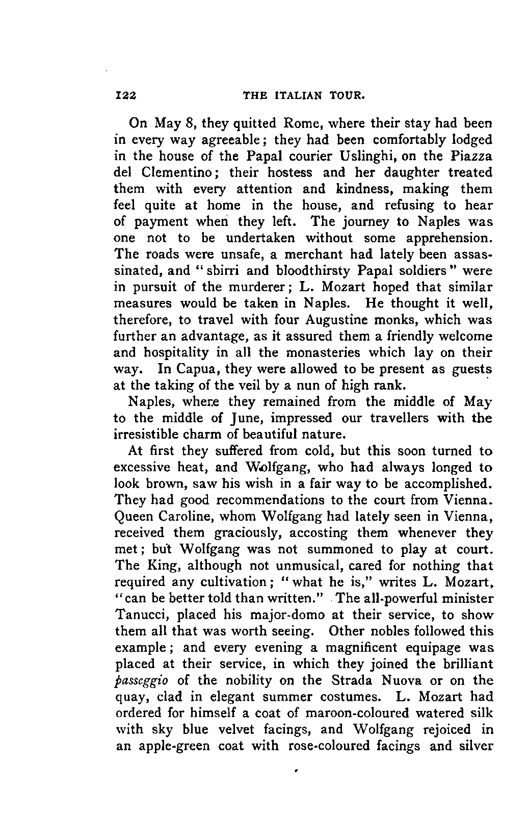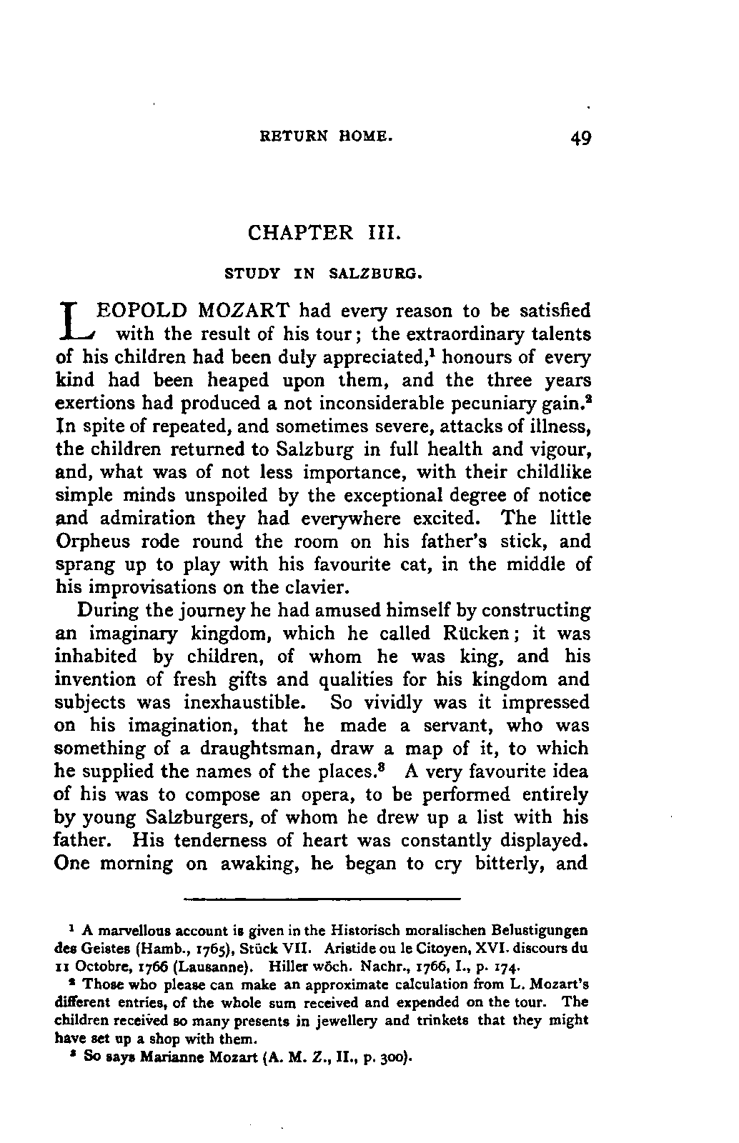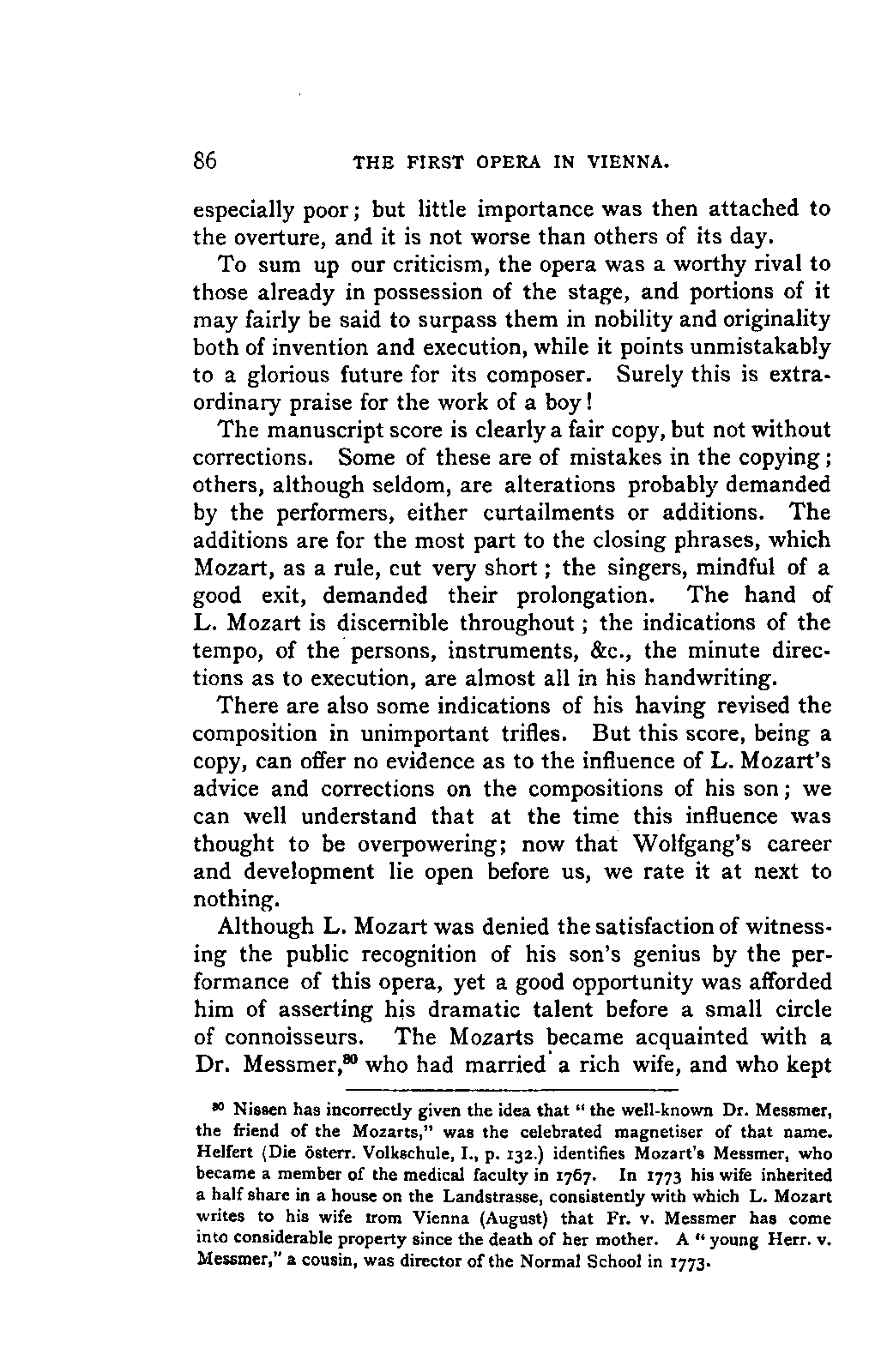 My first aim, then, was the verification and authentication of facts, and their unbiassed statement, so far as this was of interest. The written or authentic verbal traditions of Mozart and his family were here my chief dependence, and, except where some special authority is adduced, Nissen's correspondence forms the basis of my narrative. But since it was my wish to bring together all that appeared of lasting interest, and to dispense with Nissen's collection, for all readers who do not desire to search and prove for themselves, I have, therefore, quoted verbally from the letters wherever it was feasible, and have not hesitated to displace them where it answered my purpose in the narrative. I have in every case indicated the letters by their date, without mentioning whether they have been printed by Nissen or not. (They may be readily referred to in the careful collection of L. Nohl, "Mozarts Briefe": Salzburg, 1865.)