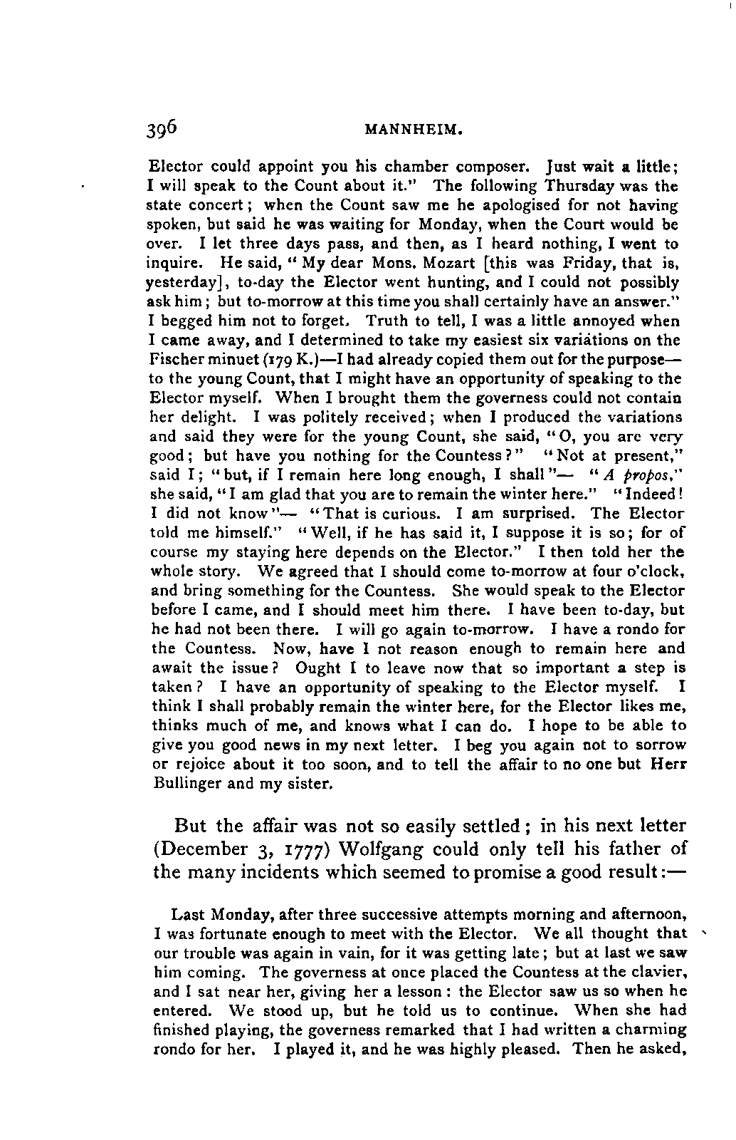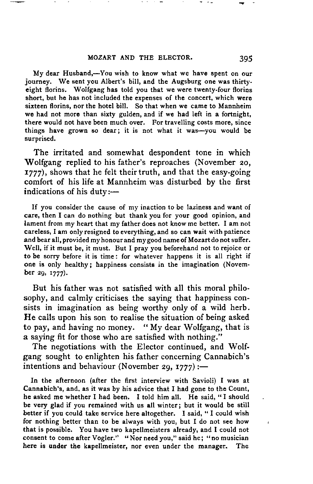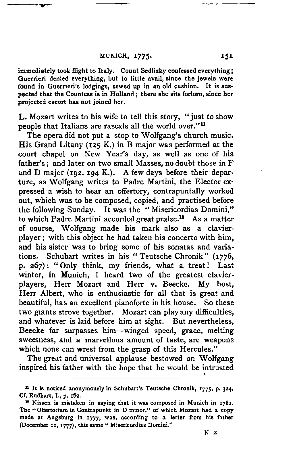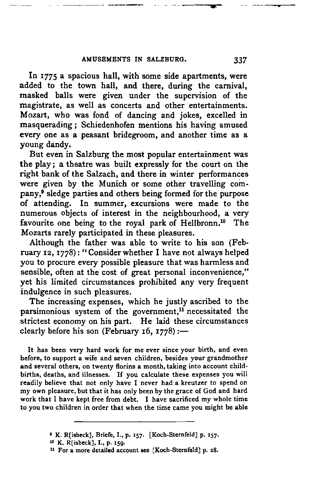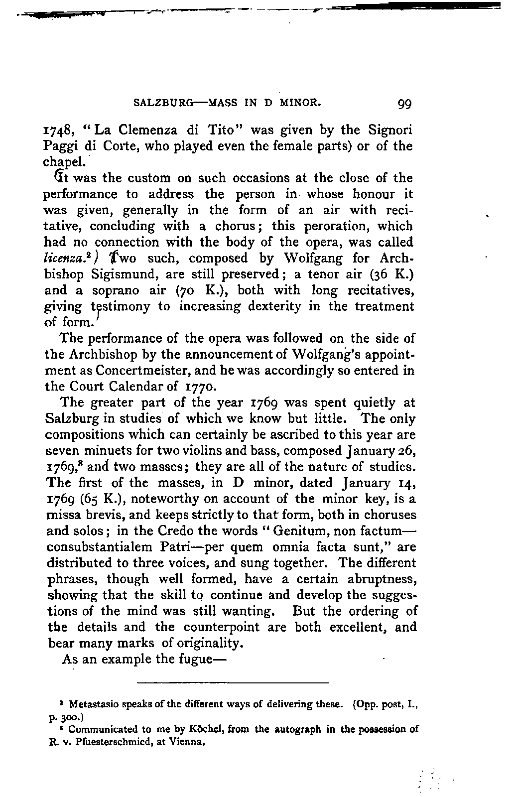 My first aim, then, was the verification and authentication of facts, and their unbiassed statement, so far as this was of interest. The written or authentic verbal traditions of Mozart and his family were here my chief dependence, and, except where some special authority is adduced, Nissen's correspondence forms the basis of my narrative. But since it was my wish to bring together all that appeared of lasting interest, and to dispense with Nissen's collection, for all readers who do not desire to search and prove for themselves, I have, therefore, quoted verbally from the letters wherever it was feasible, and have not hesitated to displace them where it answered my purpose in the narrative. I have in every case indicated the letters by their date, without mentioning whether they have been printed by Nissen or not. (They may be readily referred to in the careful collection of L. Nohl, "Mozarts Briefe": Salzburg, 1865.)
