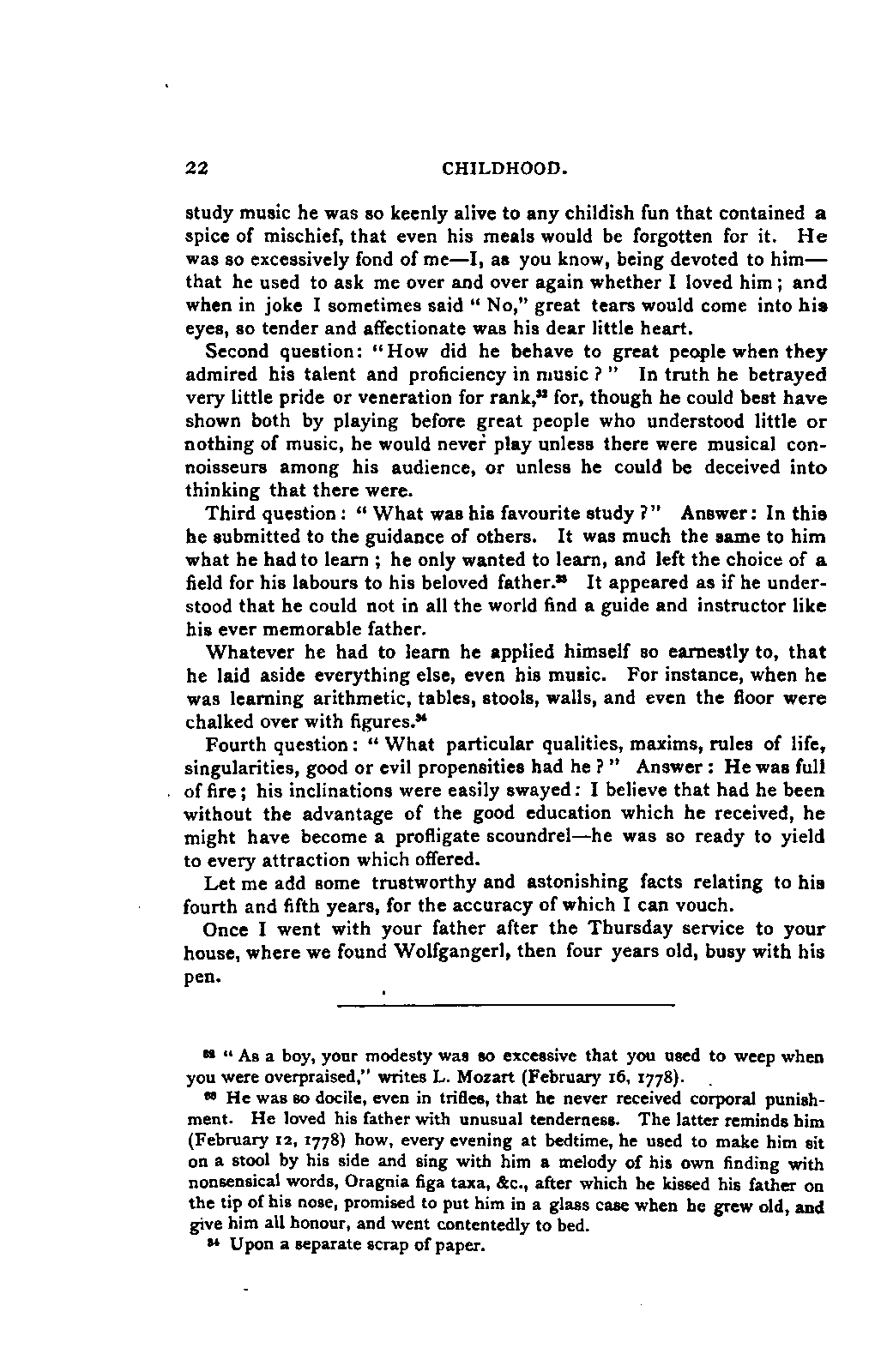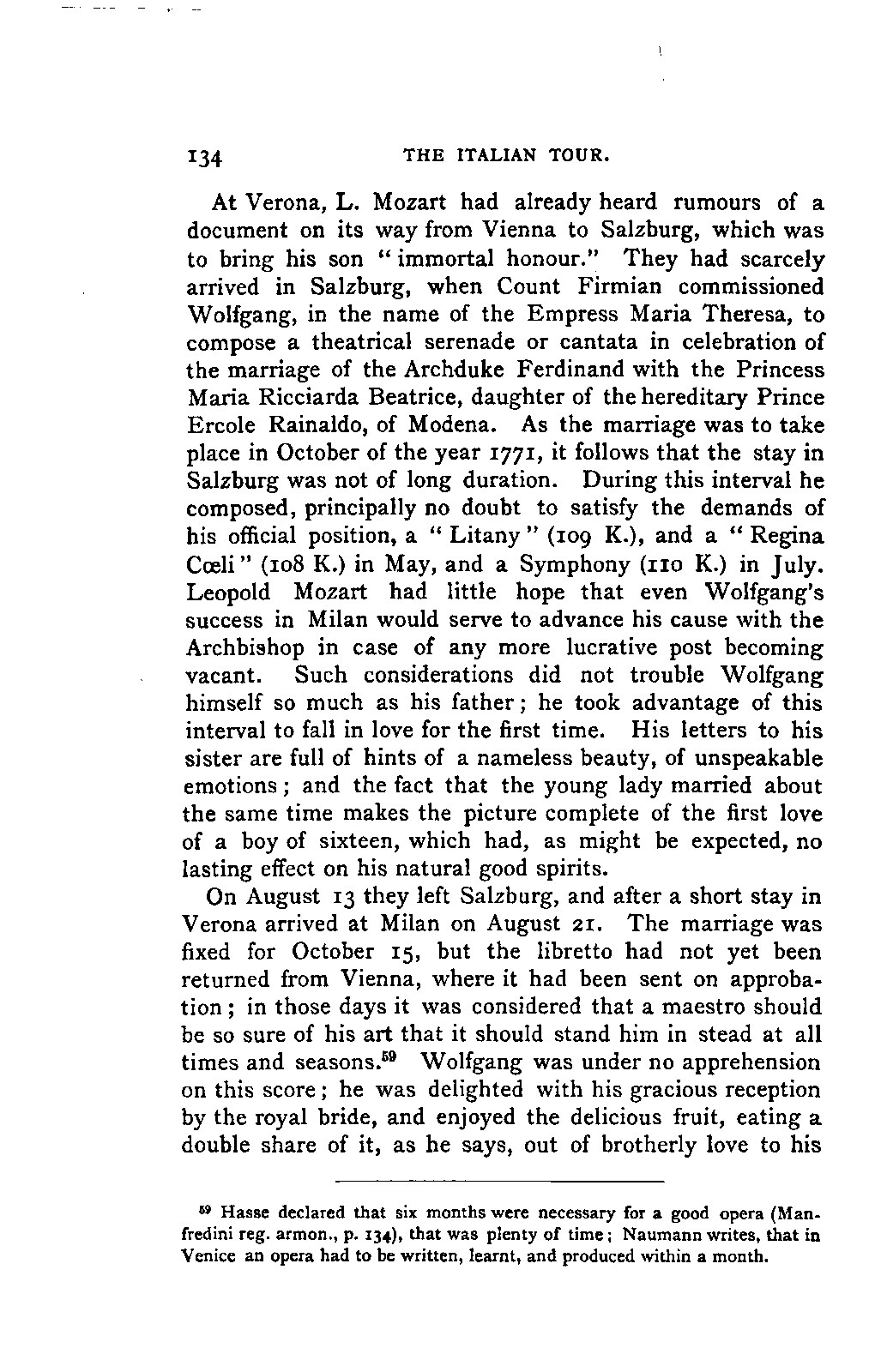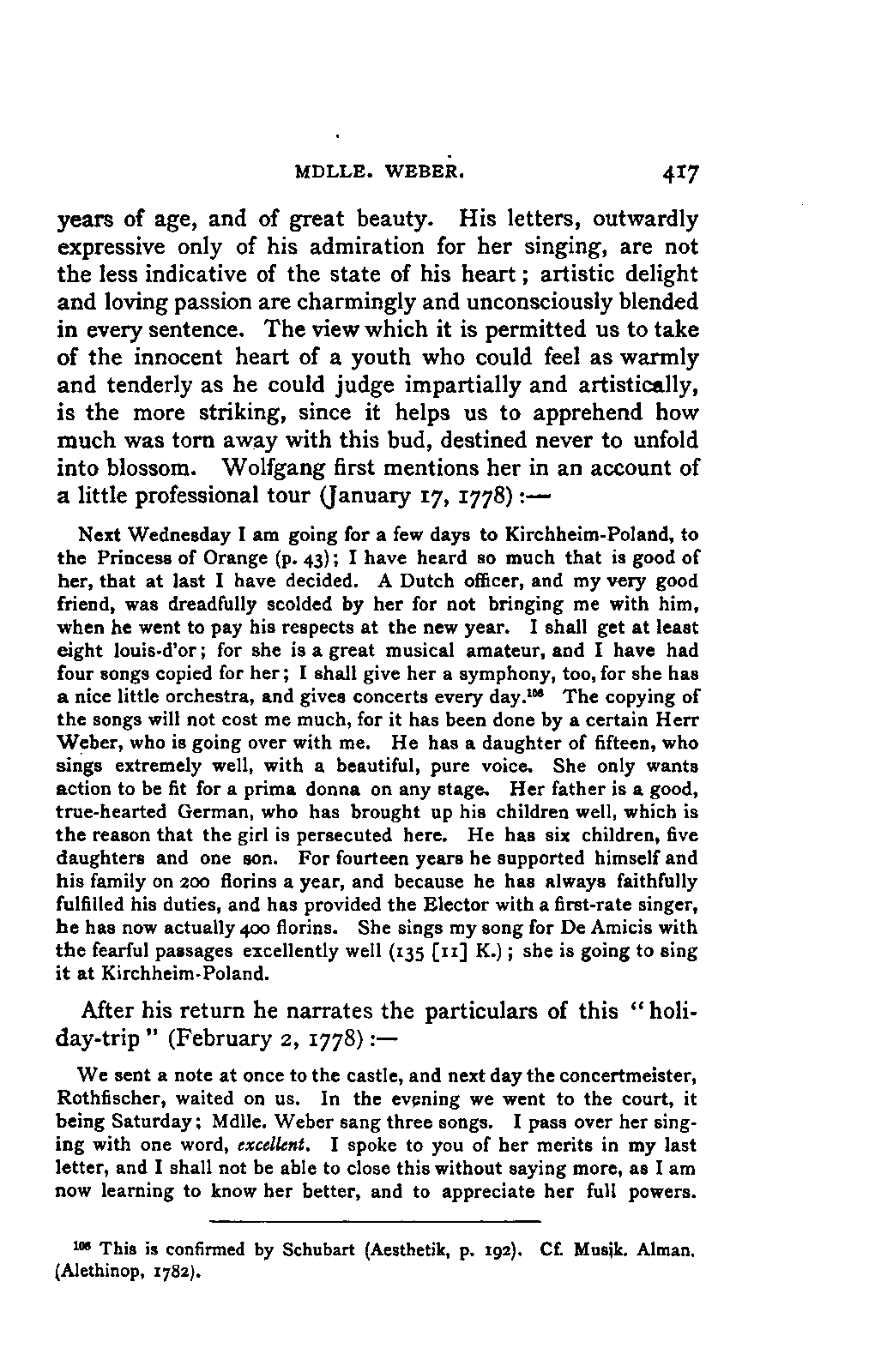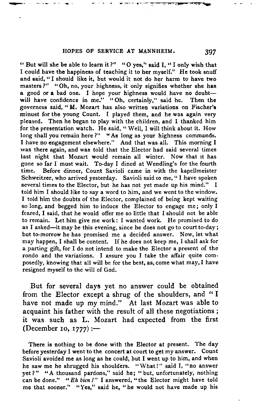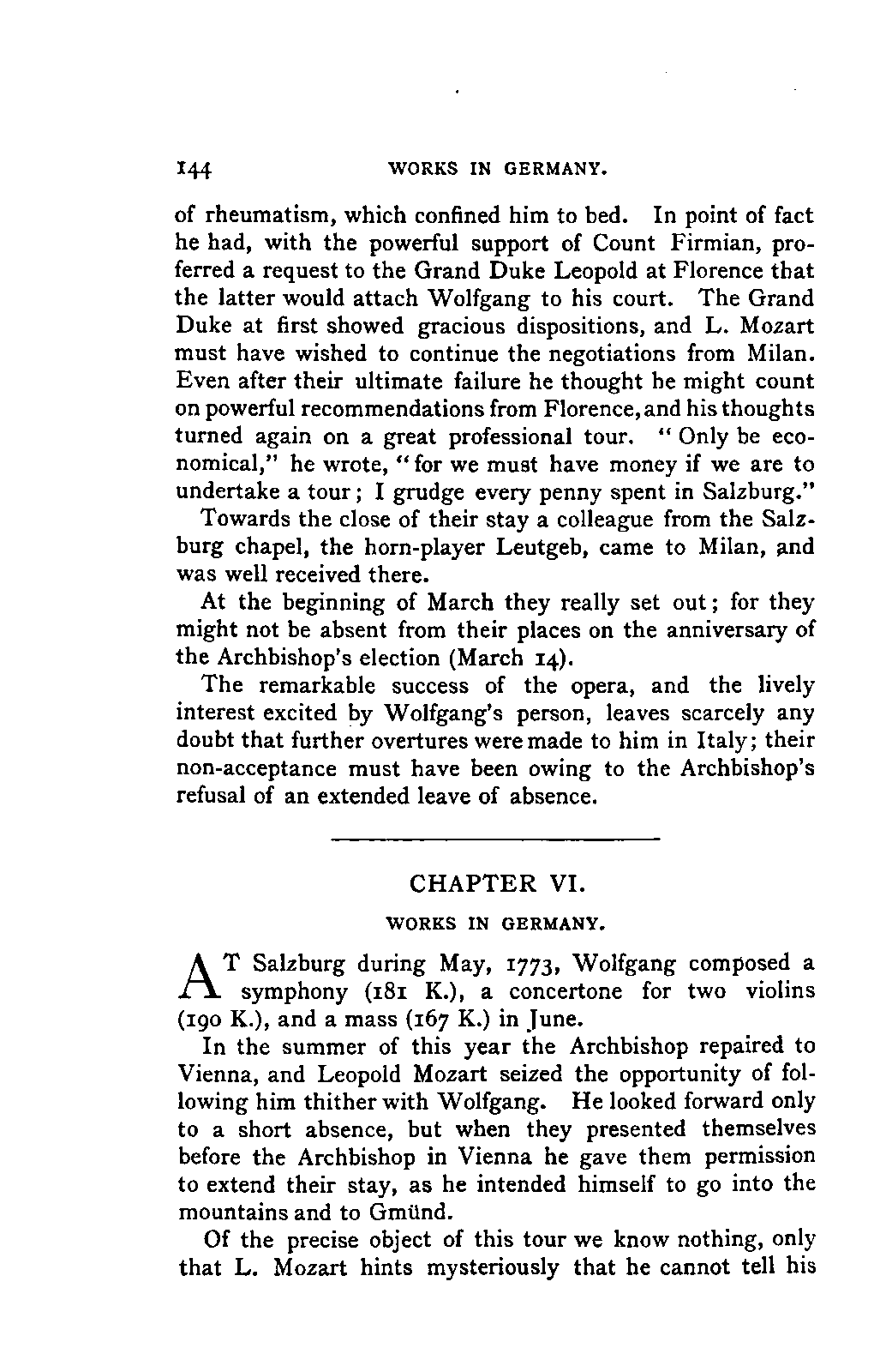 My first aim, then, was the verification and authentication of facts, and their unbiassed statement, so far as this was of interest. The written or authentic verbal traditions of Mozart and his family were here my chief dependence, and, except where some special authority is adduced, Nissen's correspondence forms the basis of my narrative. But since it was my wish to bring together all that appeared of lasting interest, and to dispense with Nissen's collection, for all readers who do not desire to search and prove for themselves, I have, therefore, quoted verbally from the letters wherever it was feasible, and have not hesitated to displace them where it answered my purpose in the narrative. I have in every case indicated the letters by their date, without mentioning whether they have been printed by Nissen or not. (They may be readily referred to in the careful collection of L. Nohl, "Mozarts Briefe": Salzburg, 1865.)