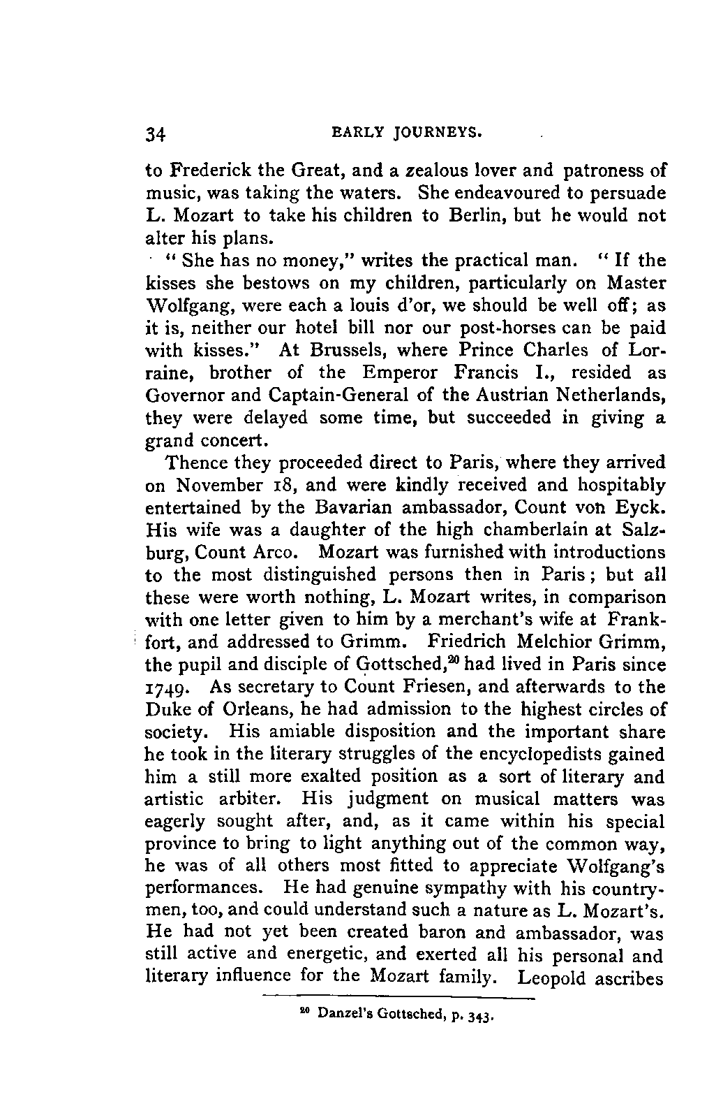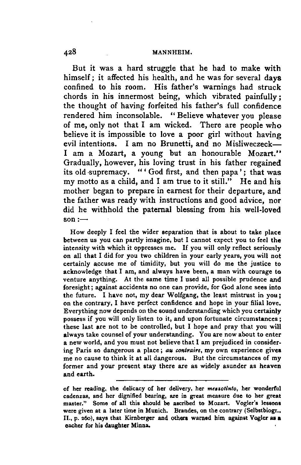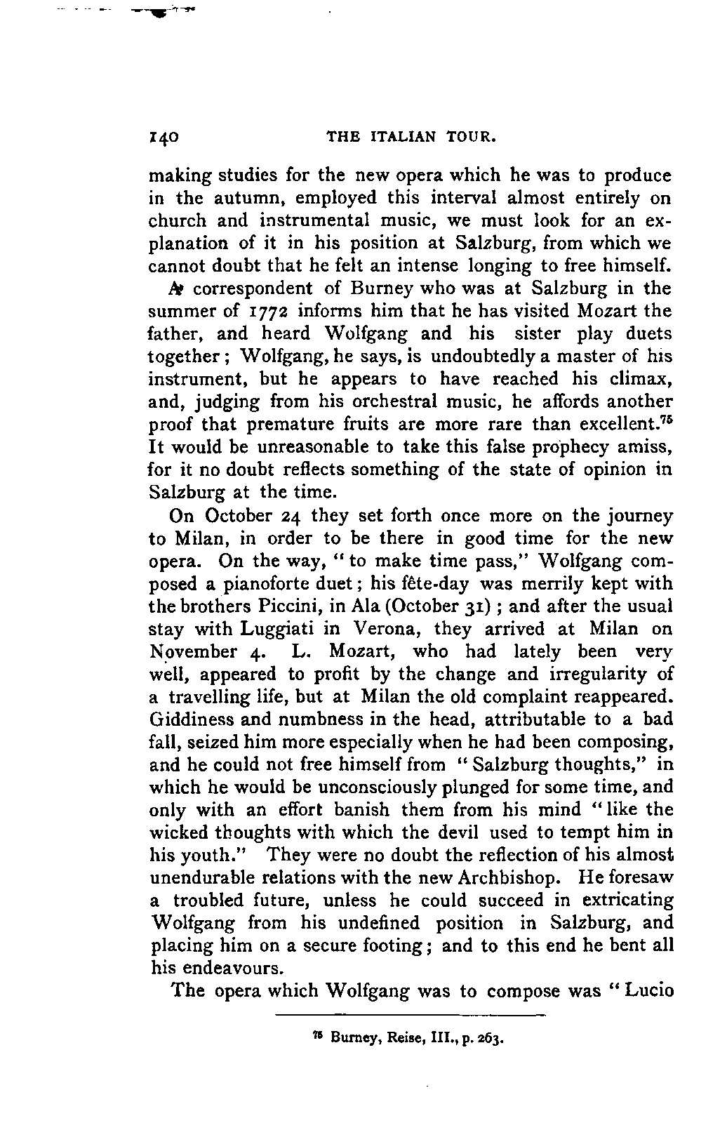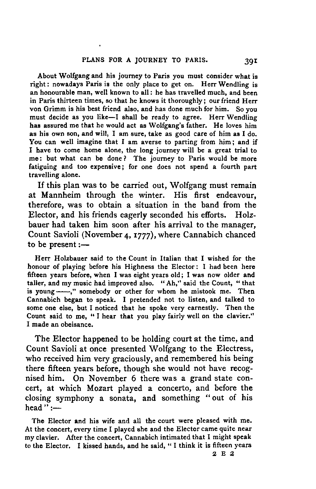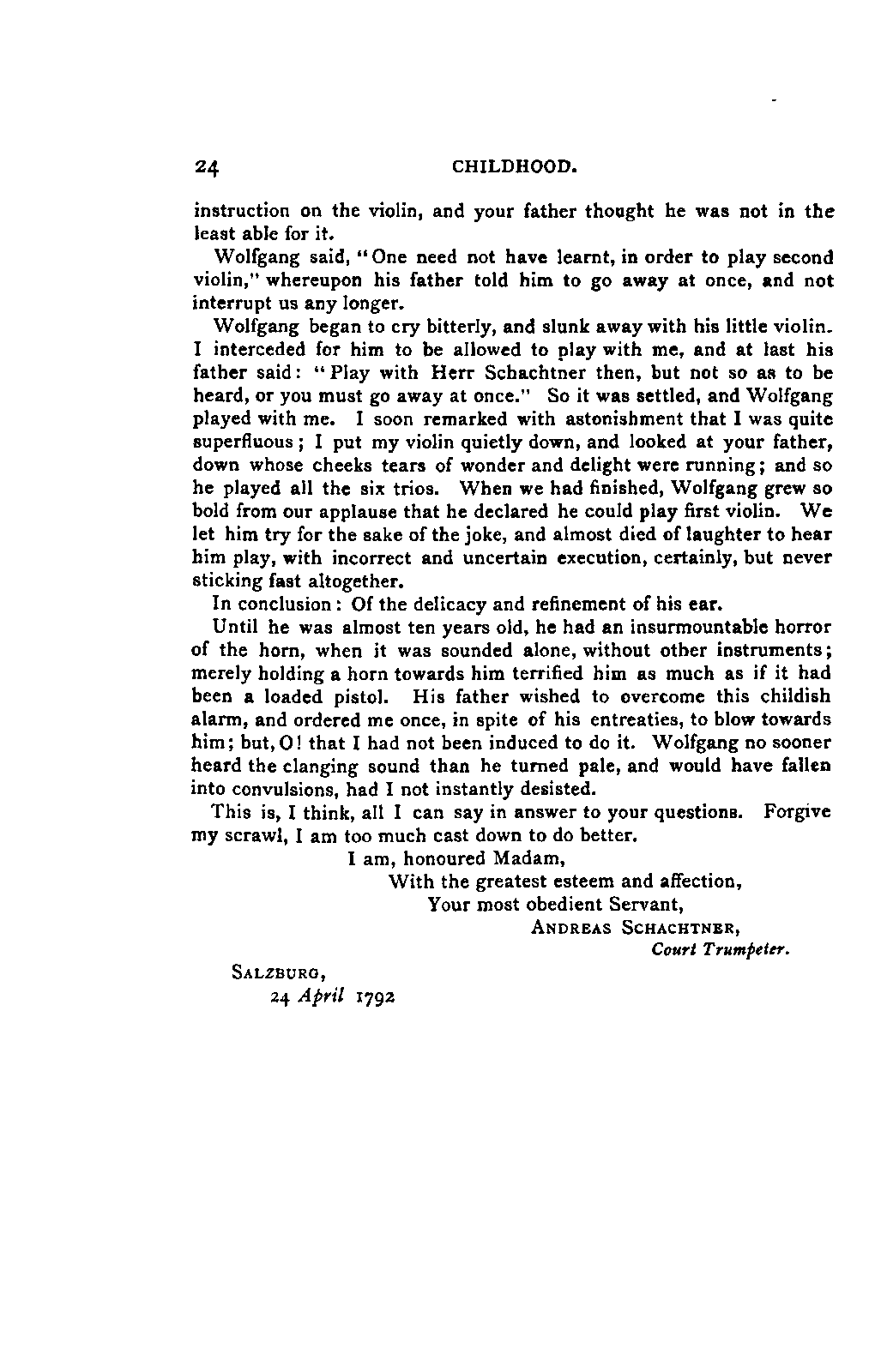My first aim, then, was the verification and authentication of facts, and their unbiassed statement, so far as this was of interest. The written or authentic verbal traditions of Mozart and his family were here my chief dependence, and, except where some special authority is adduced, Nissen's correspondence forms the basis of my narrative. But since it was my wish to bring together all that appeared of lasting interest, and to dispense with Nissen's collection, for all readers who do not desire to search and prove for themselves, I have, therefore, quoted verbally from the letters wherever it was feasible, and have not hesitated to displace them where it answered my purpose in the narrative. I have in every case indicated the letters by their date, without mentioning whether they have been printed by Nissen or not. (They may be readily referred to in the careful collection of L. Nohl, "Mozarts Briefe": Salzburg, 1865.)