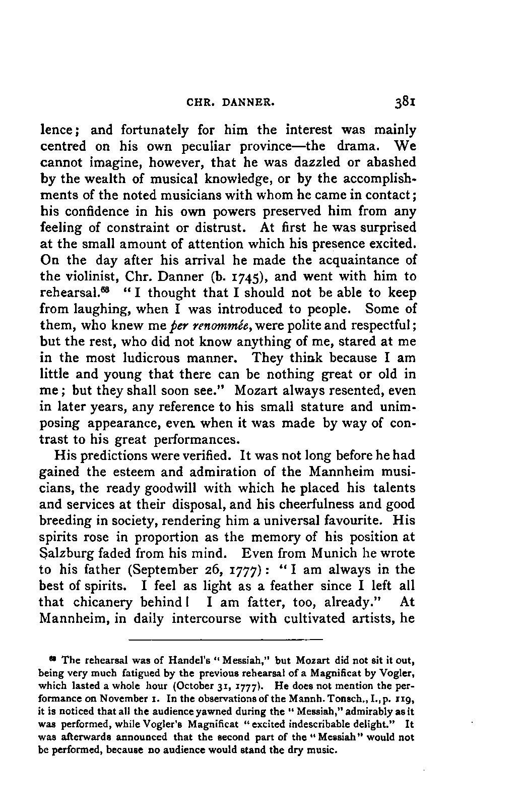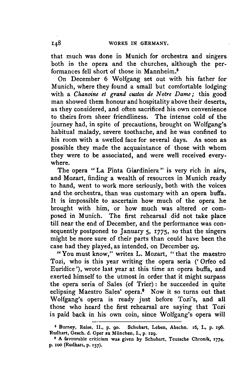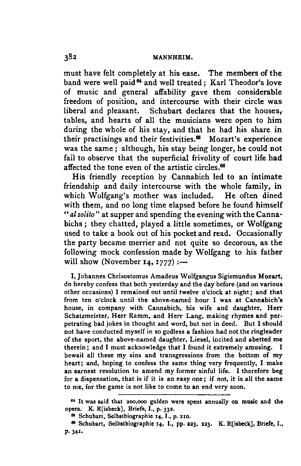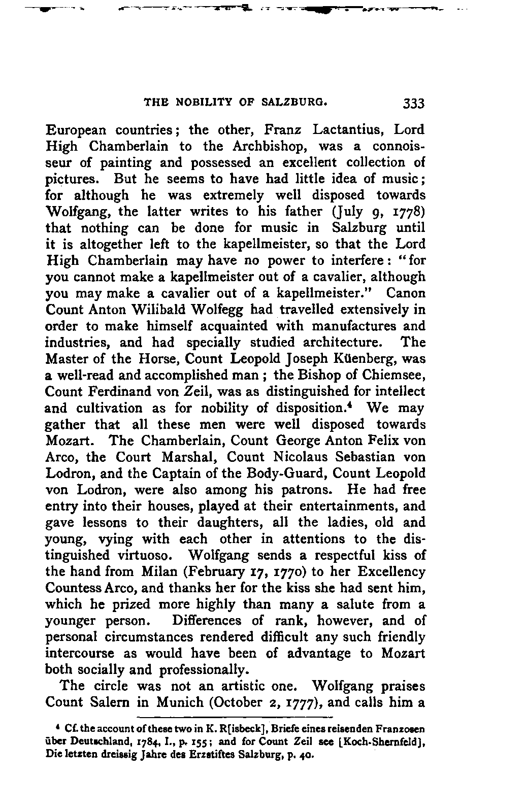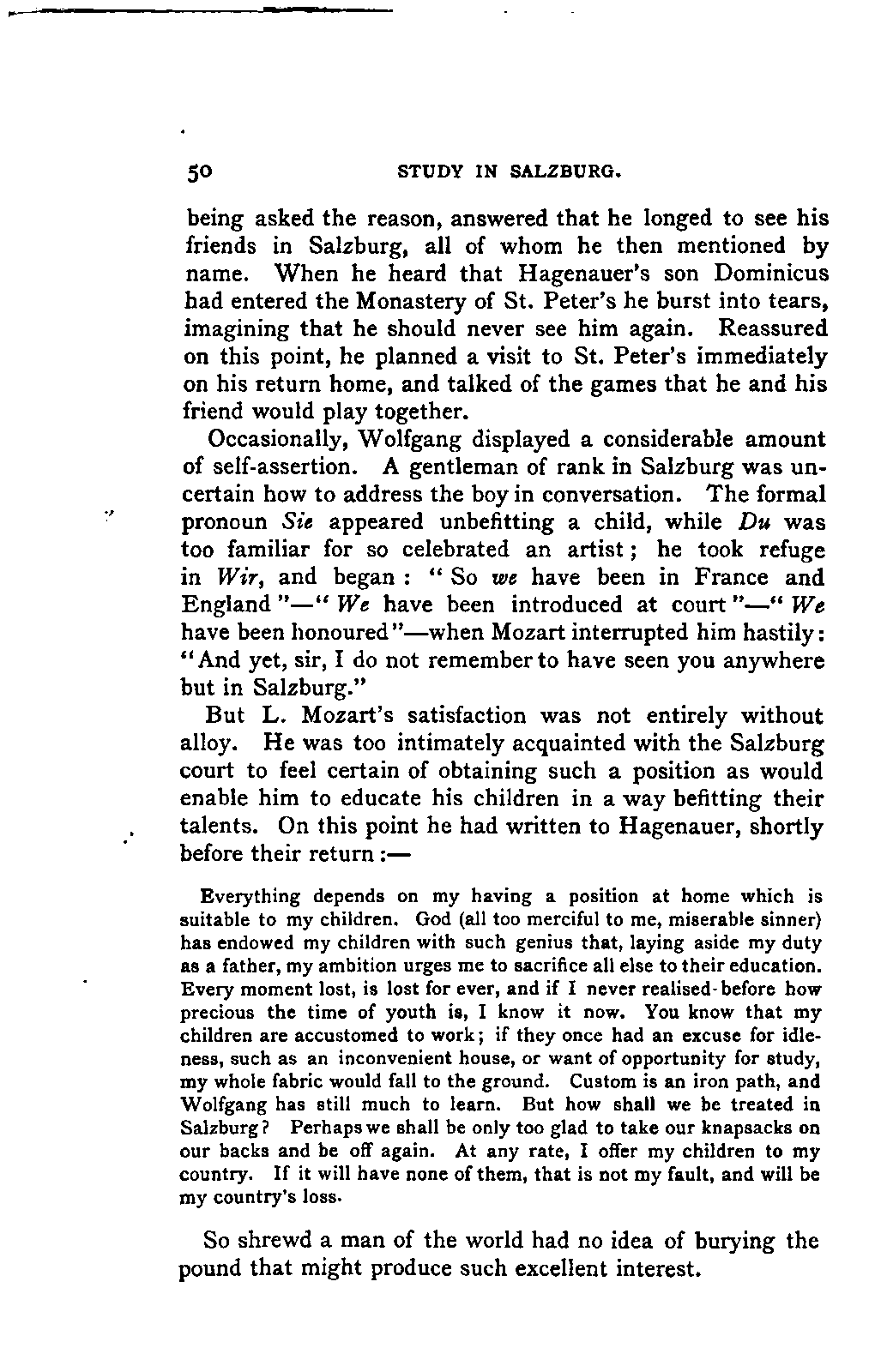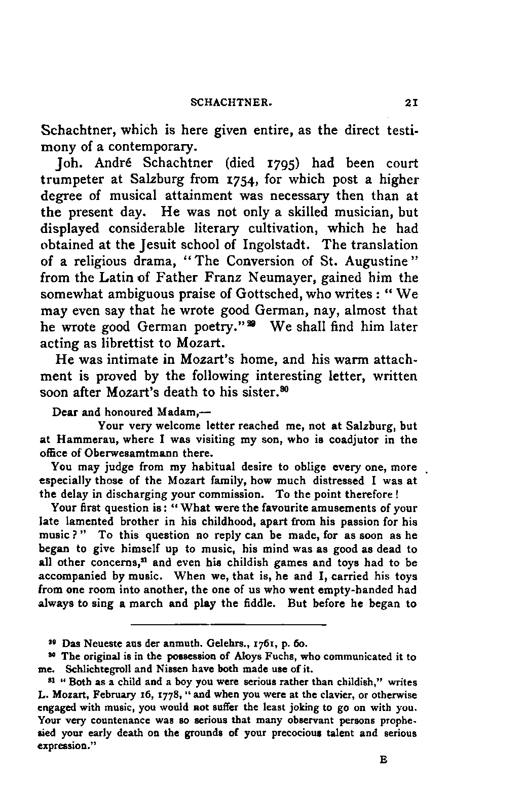 My first aim, then, was the verification and authentication of facts, and their unbiassed statement, so far as this was of interest. The written or authentic verbal traditions of Mozart and his family were here my chief dependence, and, except where some special authority is adduced, Nissen's correspondence forms the basis of my narrative. But since it was my wish to bring together all that appeared of lasting interest, and to dispense with Nissen's collection, for all readers who do not desire to search and prove for themselves, I have, therefore, quoted verbally from the letters wherever it was feasible, and have not hesitated to displace them where it answered my purpose in the narrative. I have in every case indicated the letters by their date, without mentioning whether they have been printed by Nissen or not. (They may be readily referred to in the careful collection of L. Nohl, "Mozarts Briefe": Salzburg, 1865.)
