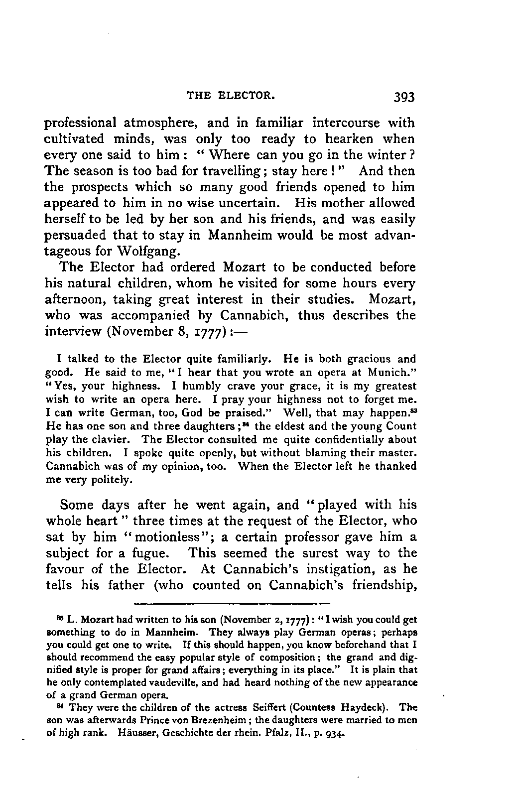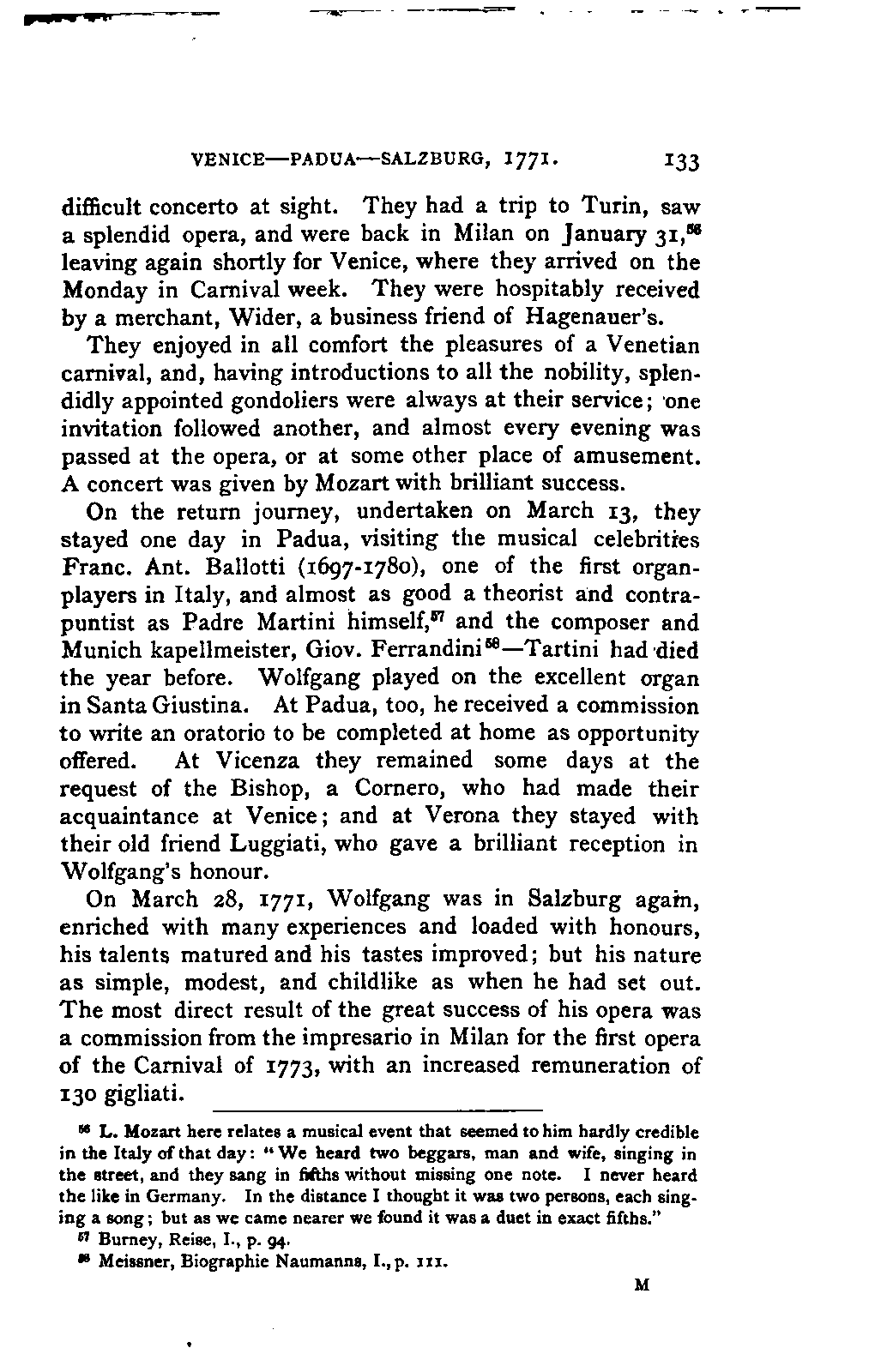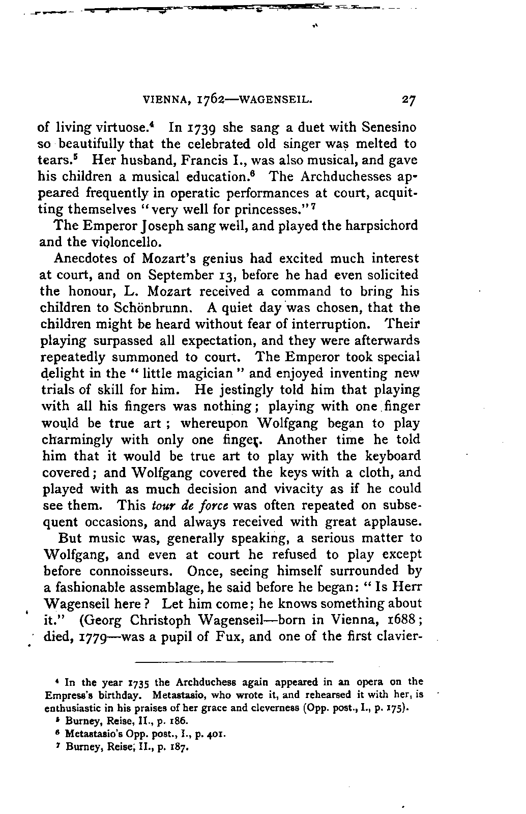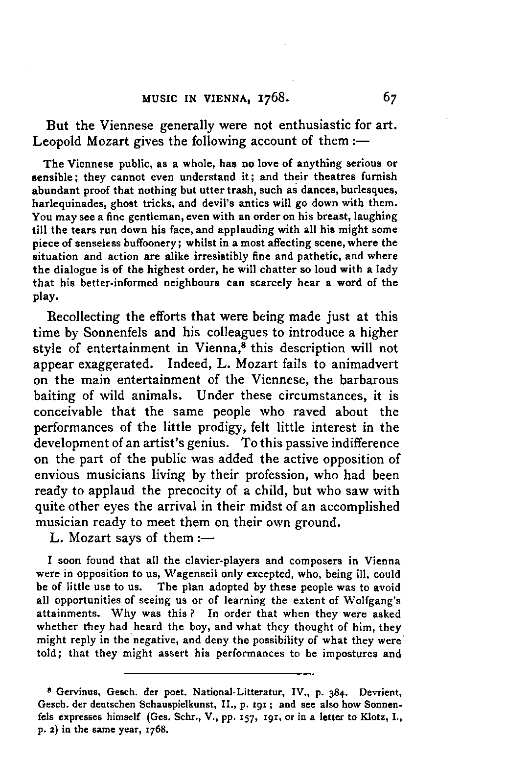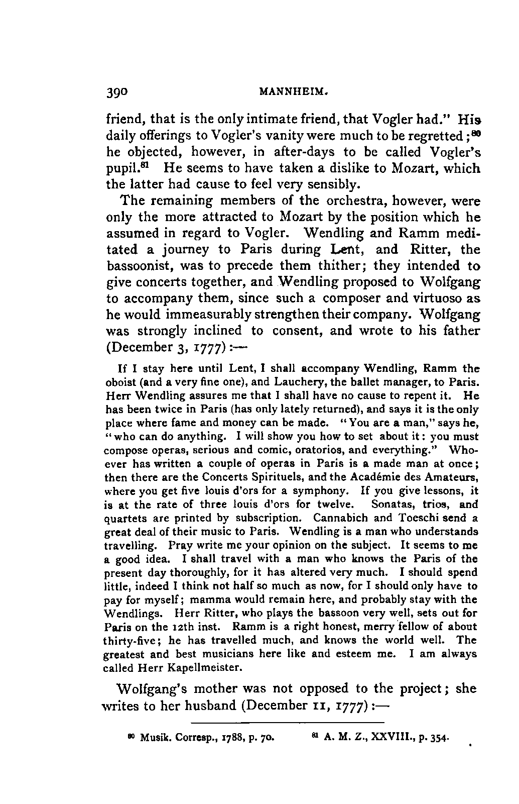 My first aim, then, was the verification and authentication of facts, and their unbiassed statement, so far as this was of interest. The written or authentic verbal traditions of Mozart and his family were here my chief dependence, and, except where some special authority is adduced, Nissen's correspondence forms the basis of my narrative. But since it was my wish to bring together all that appeared of lasting interest, and to dispense with Nissen's collection, for all readers who do not desire to search and prove for themselves, I have, therefore, quoted verbally from the letters wherever it was feasible, and have not hesitated to displace them where it answered my purpose in the narrative. I have in every case indicated the letters by their date, without mentioning whether they have been printed by Nissen or not. (They may be readily referred to in the careful collection of L. Nohl, "Mozarts Briefe": Salzburg, 1865.)