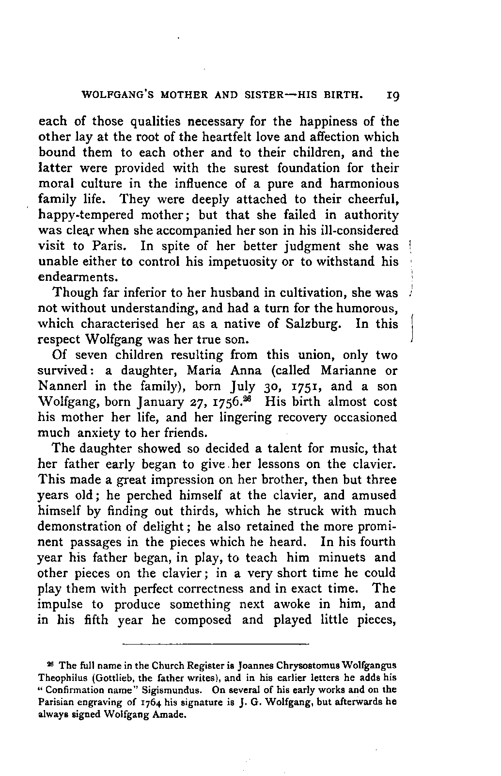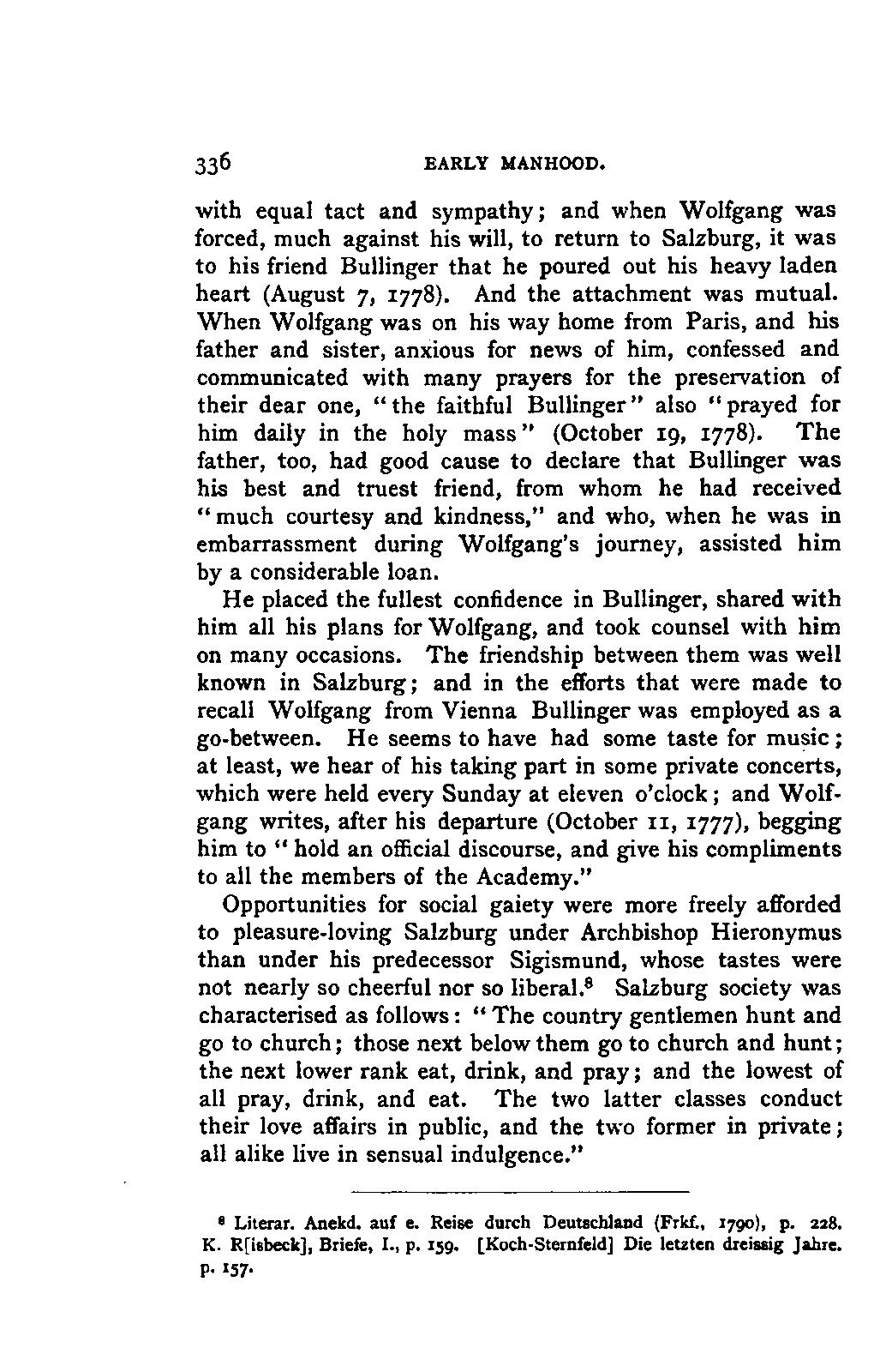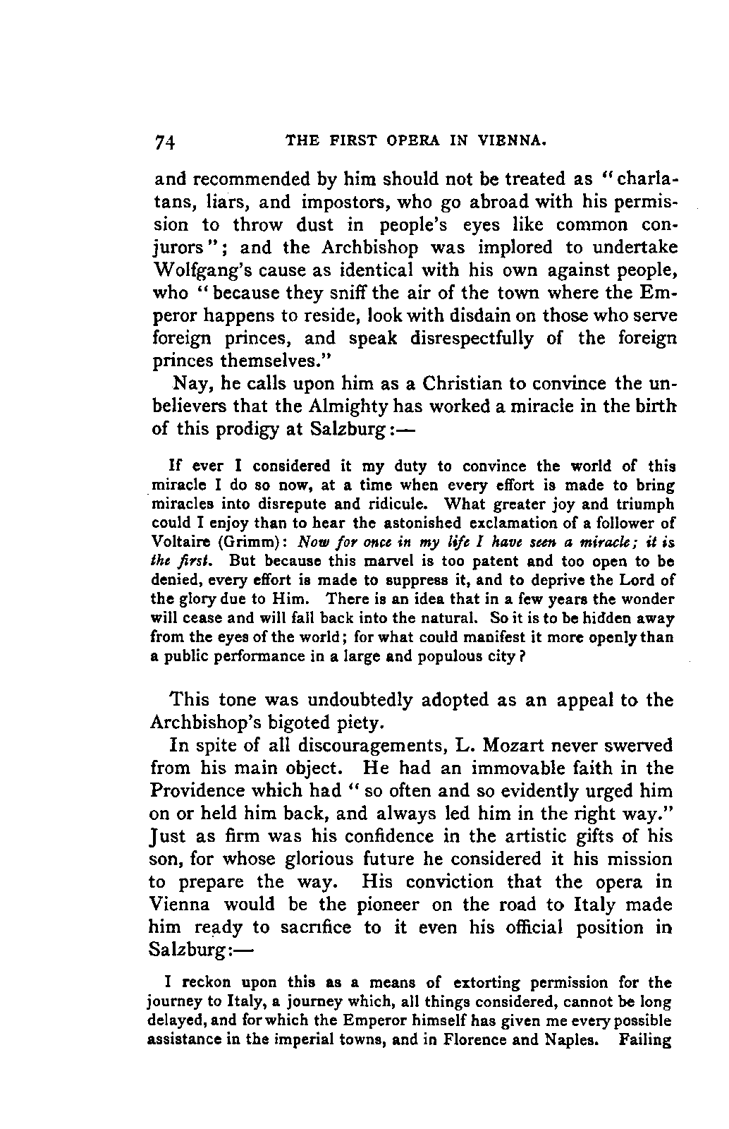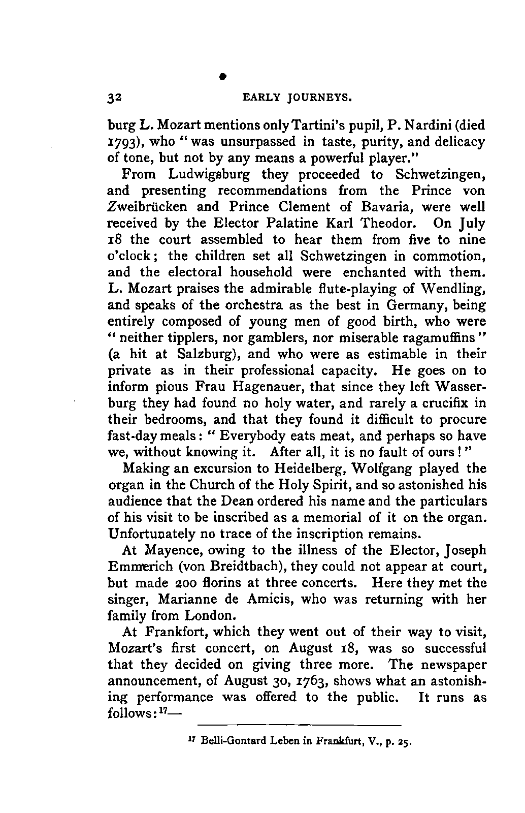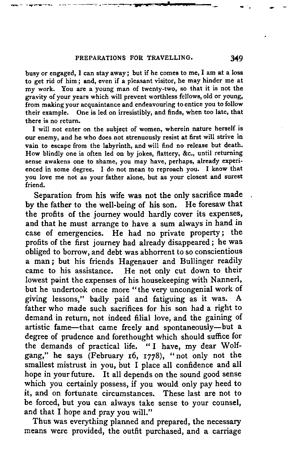 My first aim, then, was the verification and authentication of facts, and their unbiassed statement, so far as this was of interest. The written or authentic verbal traditions of Mozart and his family were here my chief dependence, and, except where some special authority is adduced, Nissen's correspondence forms the basis of my narrative. But since it was my wish to bring together all that appeared of lasting interest, and to dispense with Nissen's collection, for all readers who do not desire to search and prove for themselves, I have, therefore, quoted verbally from the letters wherever it was feasible, and have not hesitated to displace them where it answered my purpose in the narrative. I have in every case indicated the letters by their date, without mentioning whether they have been printed by Nissen or not. (They may be readily referred to in the careful collection of L. Nohl, "Mozarts Briefe": Salzburg, 1865.)