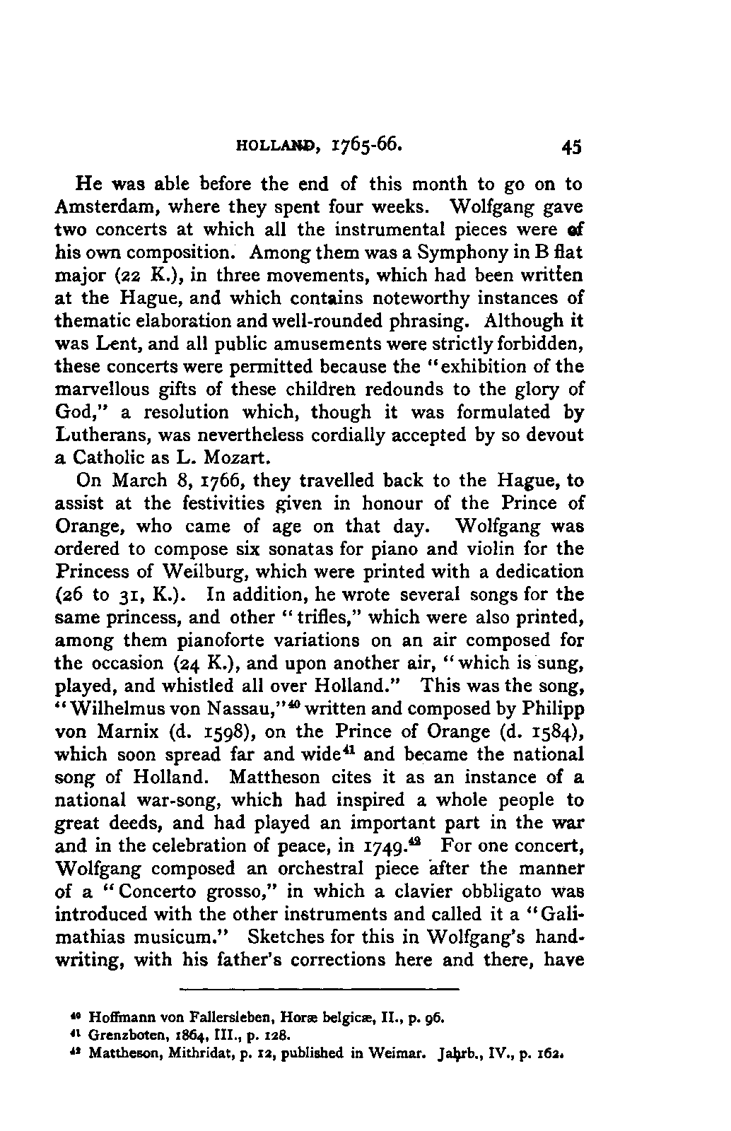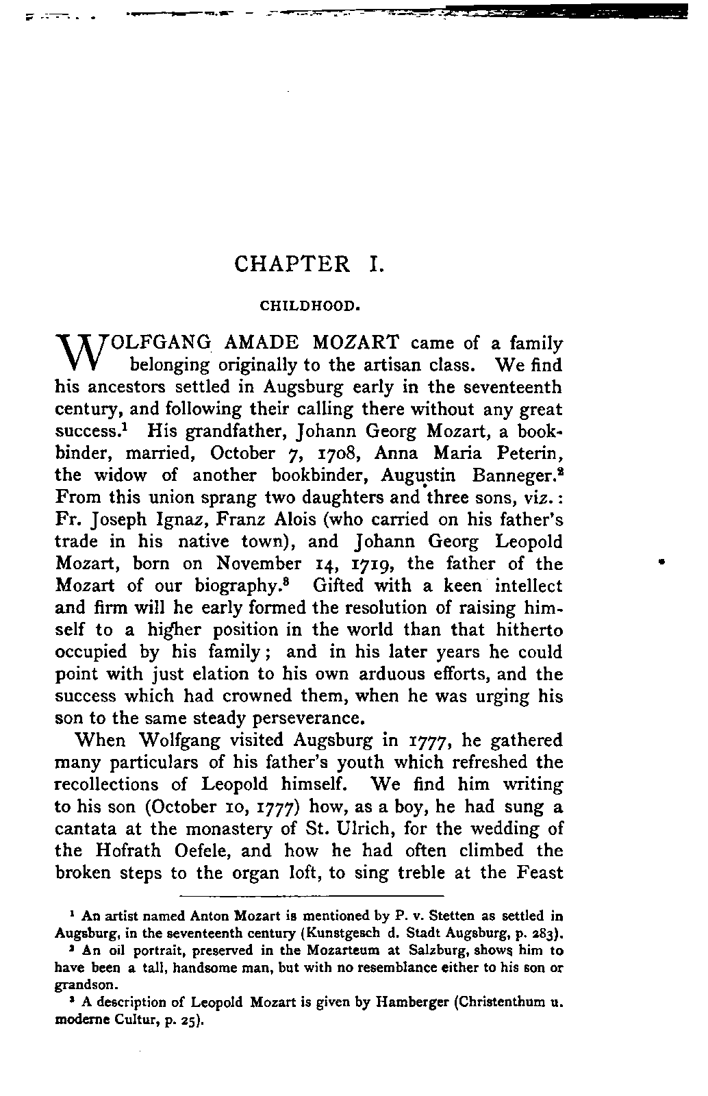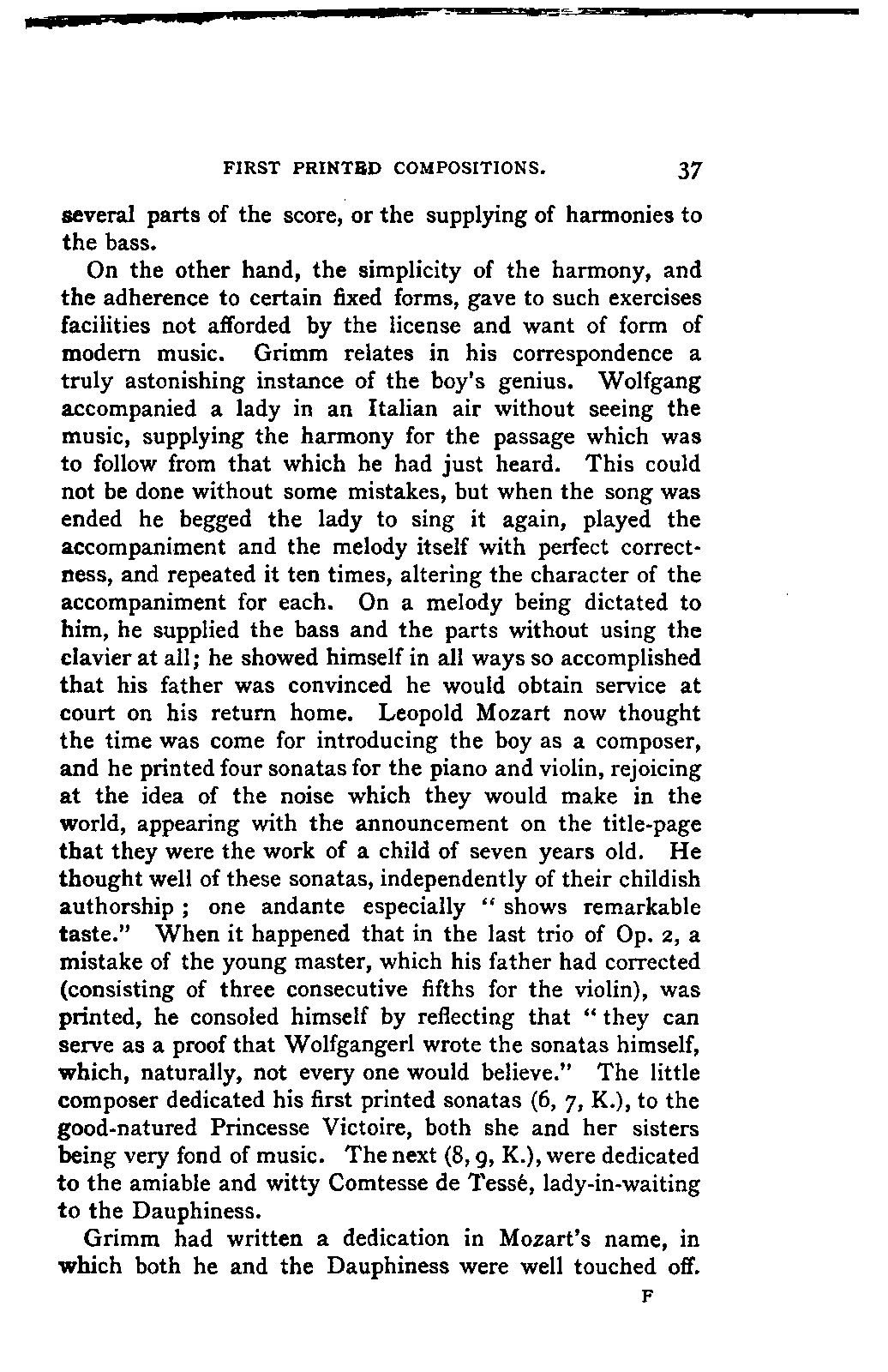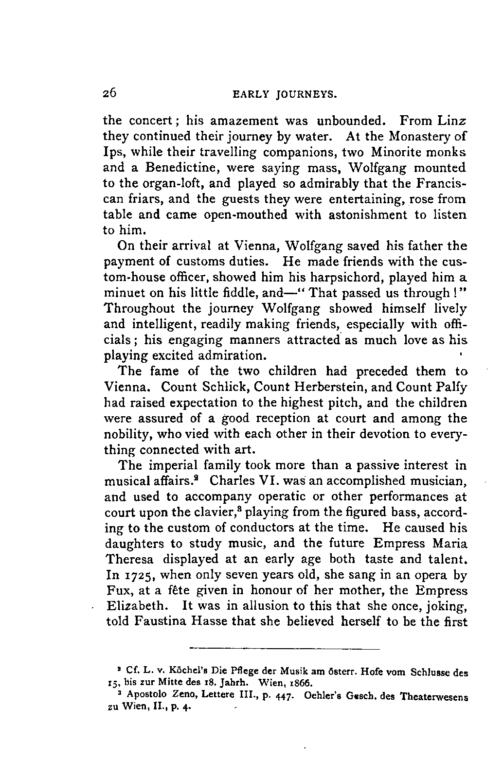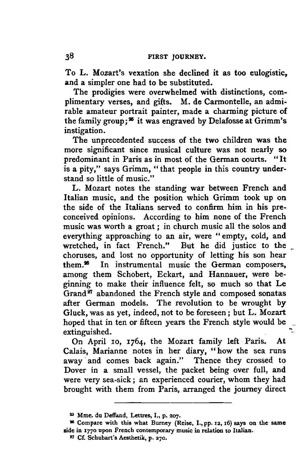 My first aim, then, was the verification and authentication of facts, and their unbiassed statement, so far as this was of interest. The written or authentic verbal traditions of Mozart and his family were here my chief dependence, and, except where some special authority is adduced, Nissen's correspondence forms the basis of my narrative. But since it was my wish to bring together all that appeared of lasting interest, and to dispense with Nissen's collection, for all readers who do not desire to search and prove for themselves, I have, therefore, quoted verbally from the letters wherever it was feasible, and have not hesitated to displace them where it answered my purpose in the narrative. I have in every case indicated the letters by their date, without mentioning whether they have been printed by Nissen or not. (They may be readily referred to in the careful collection of L. Nohl, "Mozarts Briefe": Salzburg, 1865.)