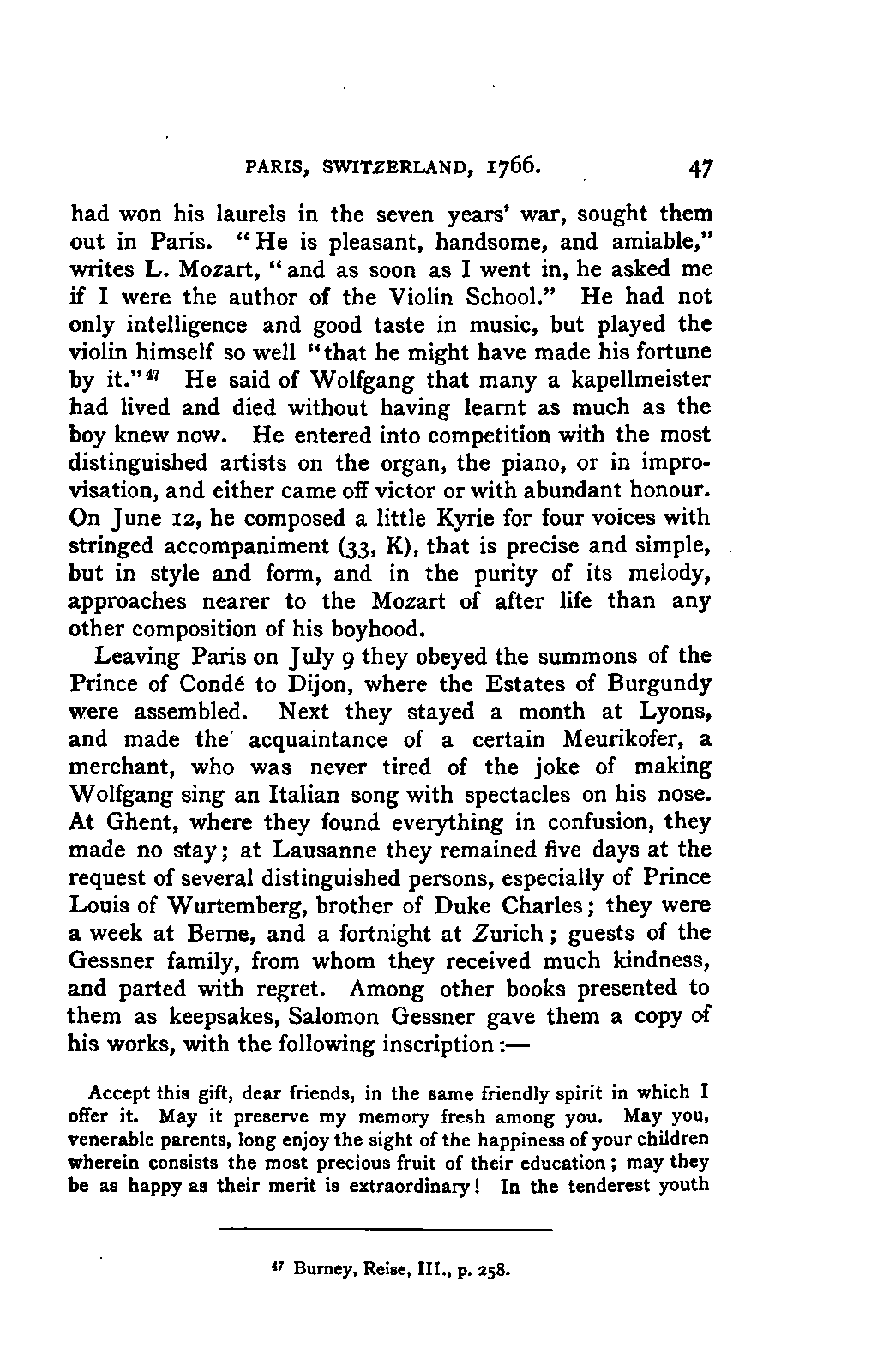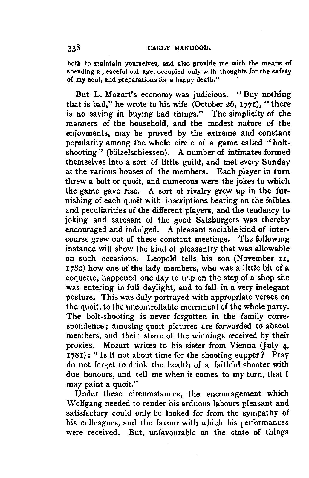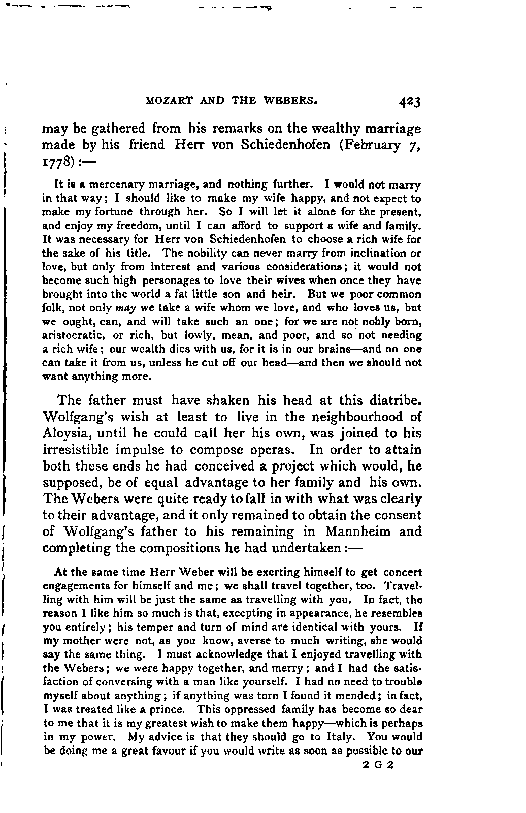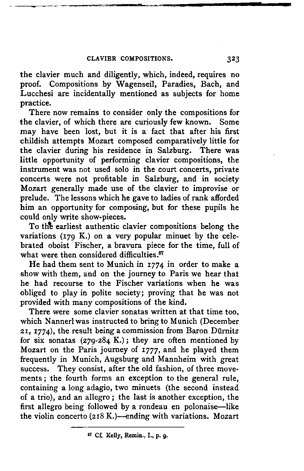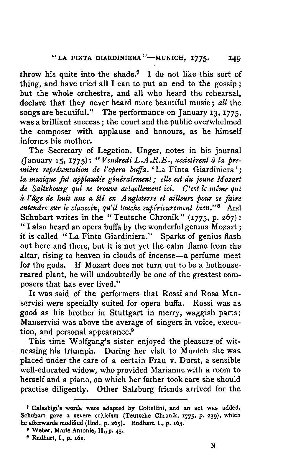 My first aim, then, was the verification and authentication of facts, and their unbiassed statement, so far as this was of interest. The written or authentic verbal traditions of Mozart and his family were here my chief dependence, and, except where some special authority is adduced, Nissen's correspondence forms the basis of my narrative. But since it was my wish to bring together all that appeared of lasting interest, and to dispense with Nissen's collection, for all readers who do not desire to search and prove for themselves, I have, therefore, quoted verbally from the letters wherever it was feasible, and have not hesitated to displace them where it answered my purpose in the narrative. I have in every case indicated the letters by their date, without mentioning whether they have been printed by Nissen or not. (They may be readily referred to in the careful collection of L. Nohl, "Mozarts Briefe": Salzburg, 1865.)