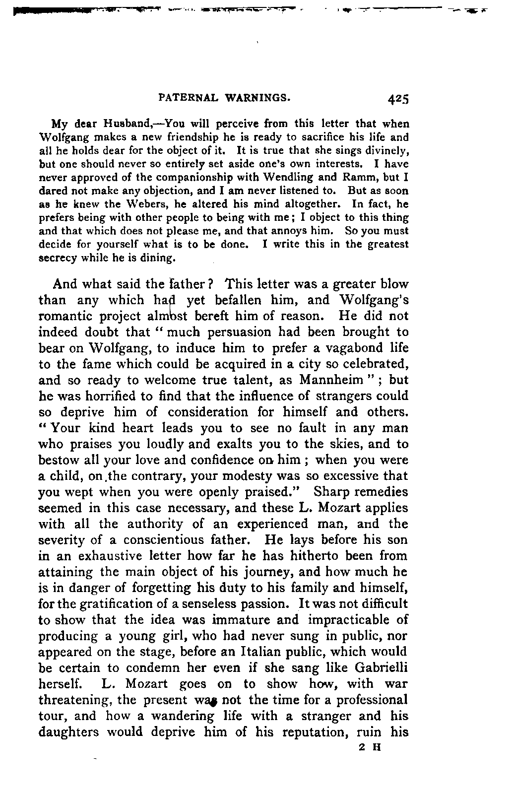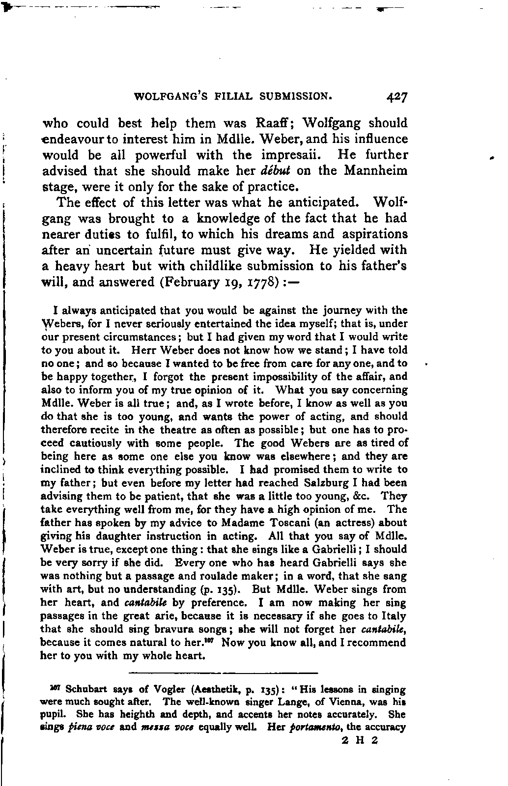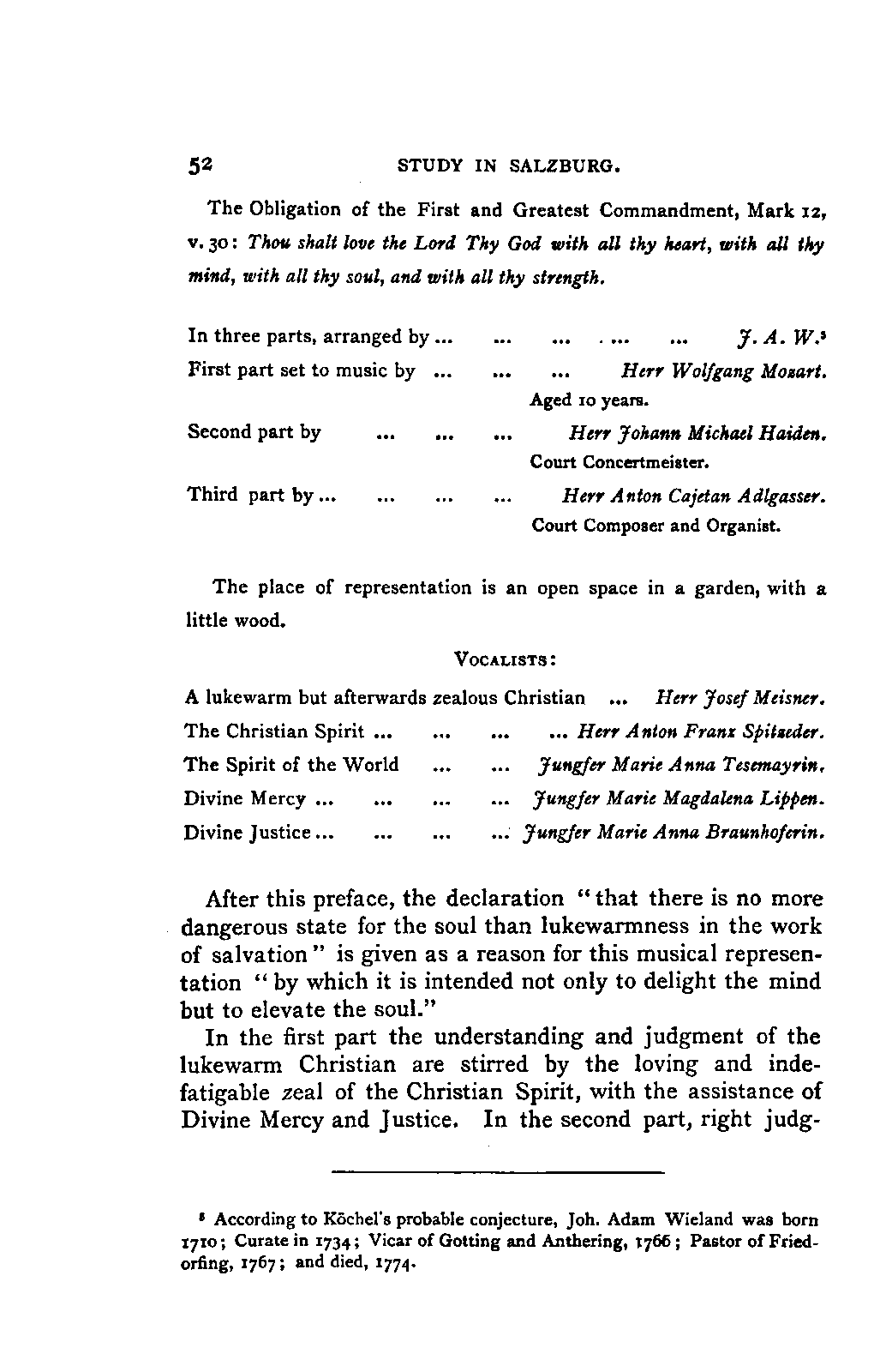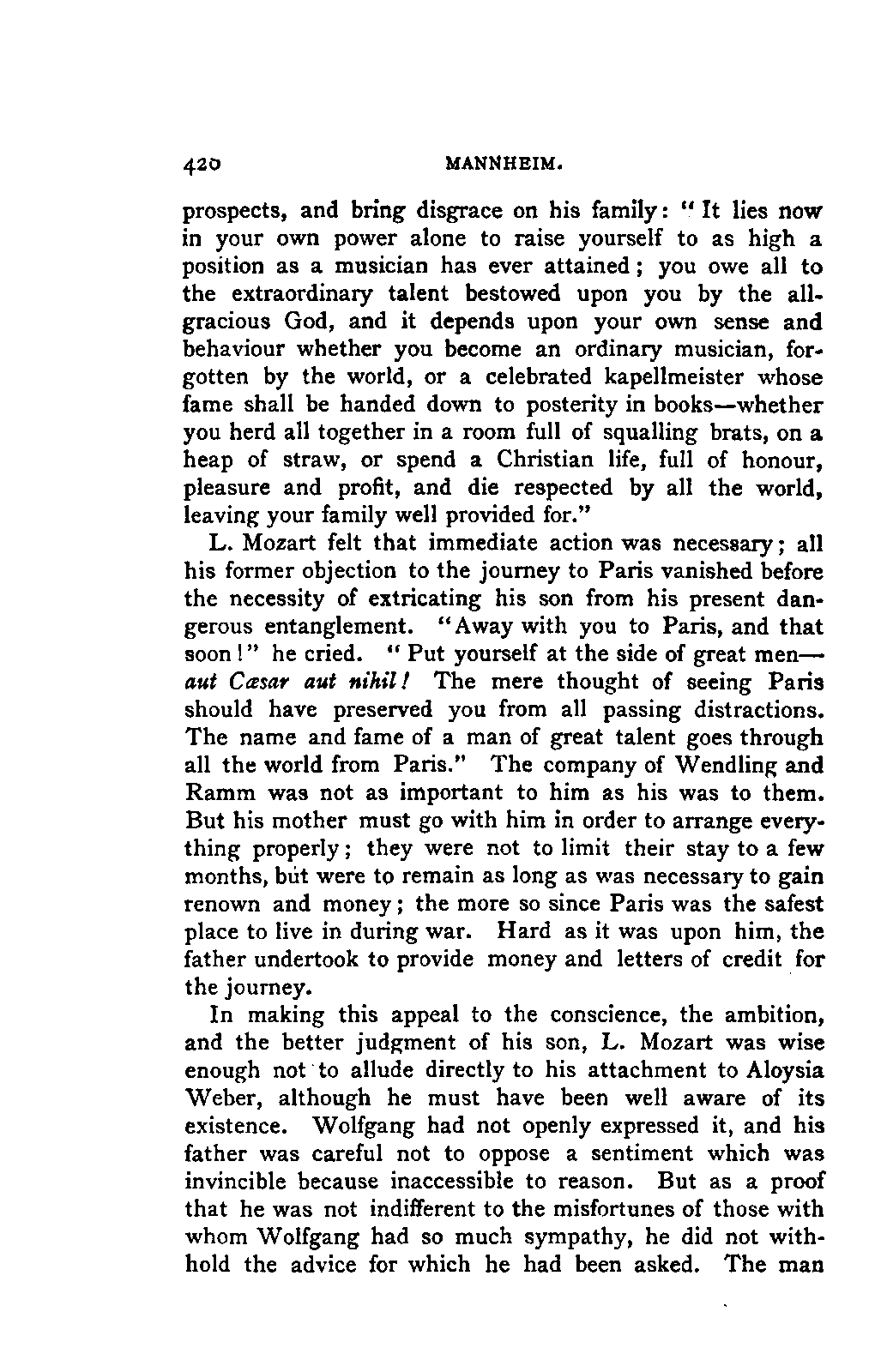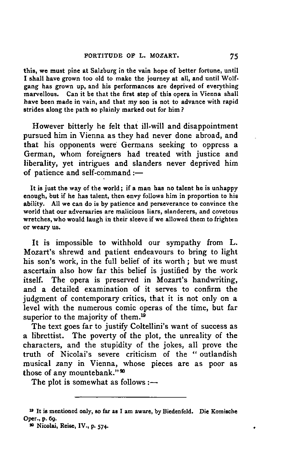 My first aim, then, was the verification and authentication of facts, and their unbiassed statement, so far as this was of interest. The written or authentic verbal traditions of Mozart and his family were here my chief dependence, and, except where some special authority is adduced, Nissen's correspondence forms the basis of my narrative. But since it was my wish to bring together all that appeared of lasting interest, and to dispense with Nissen's collection, for all readers who do not desire to search and prove for themselves, I have, therefore, quoted verbally from the letters wherever it was feasible, and have not hesitated to displace them where it answered my purpose in the narrative. I have in every case indicated the letters by their date, without mentioning whether they have been printed by Nissen or not. (They may be readily referred to in the careful collection of L. Nohl, "Mozarts Briefe": Salzburg, 1865.)