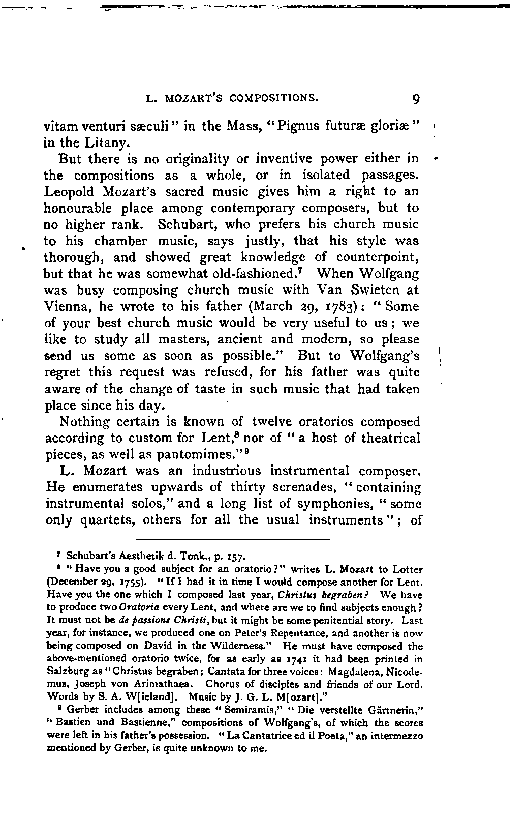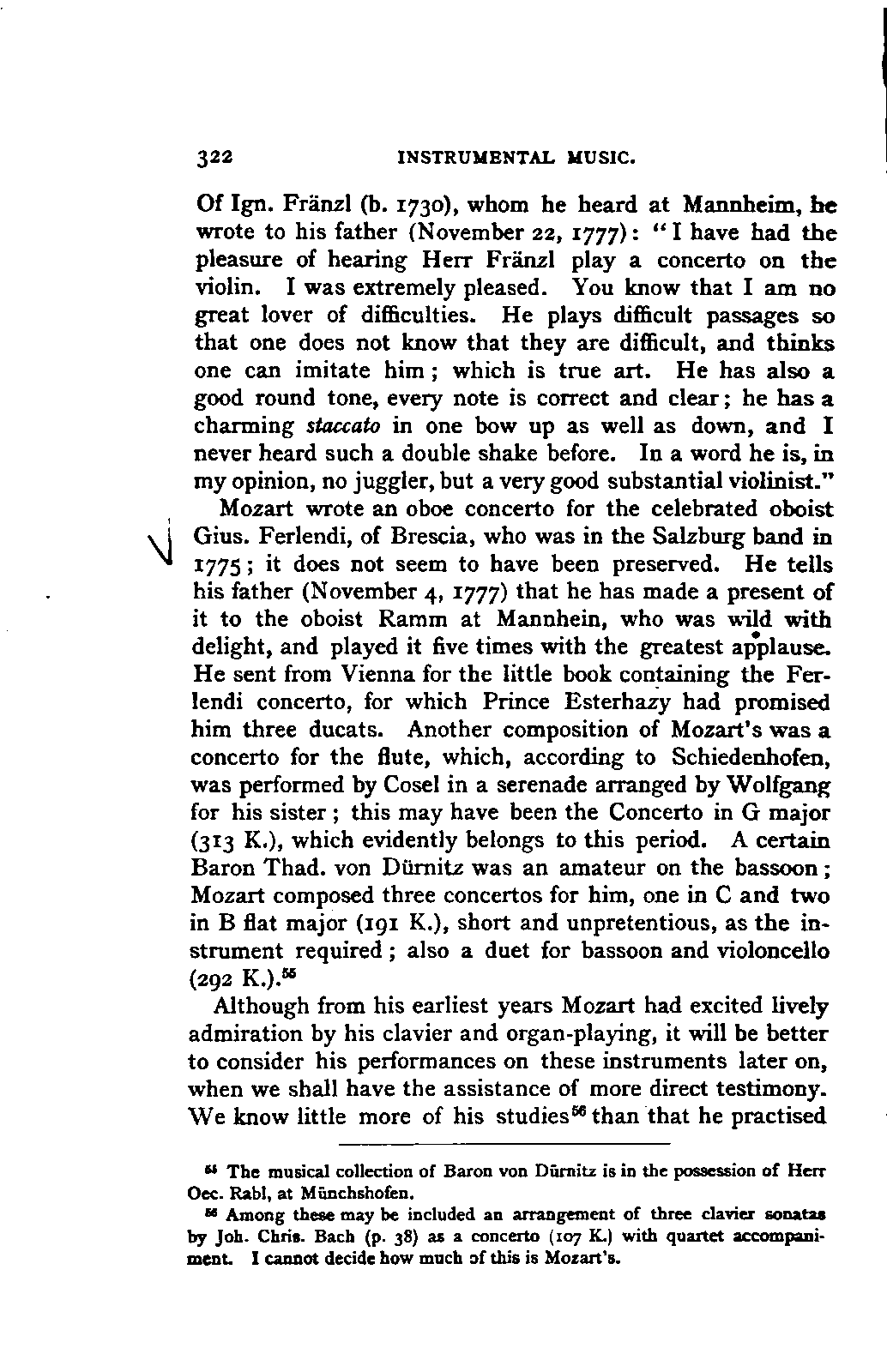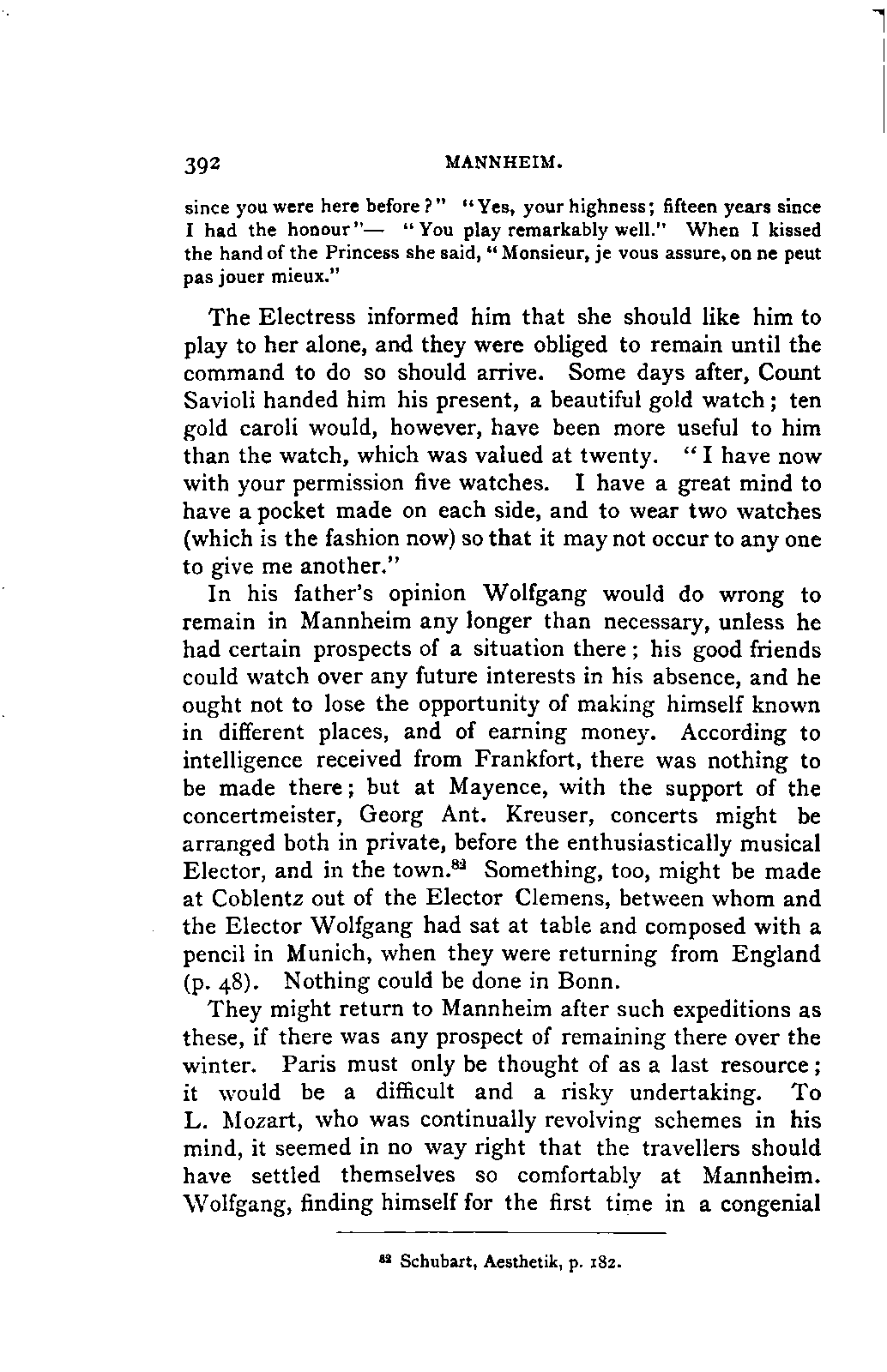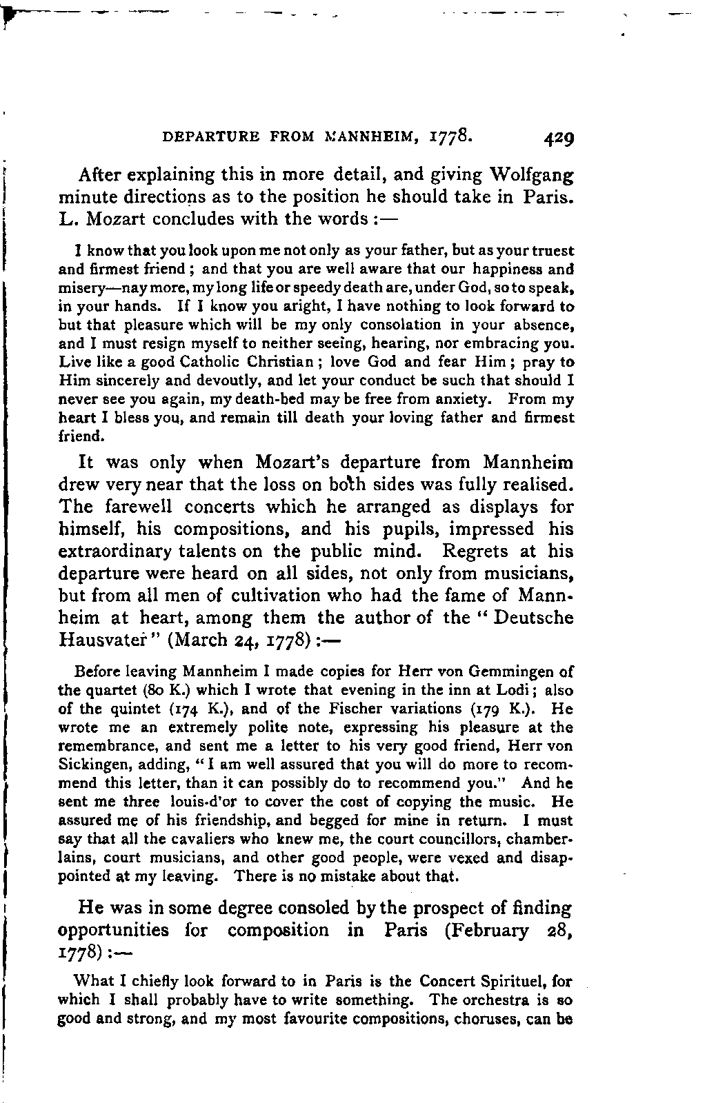 I sometimes regretted, however, that the collection was made more in the spirit of a collector than in the interests of science; so that, for example, he has scarcely ever noted the source of his extracts; but much was brought to my notice which would scarcely otherwise have occurred to me, much trouble was spared, and a number of Mozart's letters were made known to me for the first time. I was unfortunately prevented from thoroughly examining Fuchs's valuable collection of Mozart's compositions in their different editions and copies; my time was short, and I hoped to be able to avail myself of a future opportunity for doing so. This hope was frustrated by the death of Aloys Fuchs a few months after I left Vienna. It has been a painful feeling to me not to be able to express my gratitude for so much friendly service by offering to him the book in which I know he would have taken pleasure.