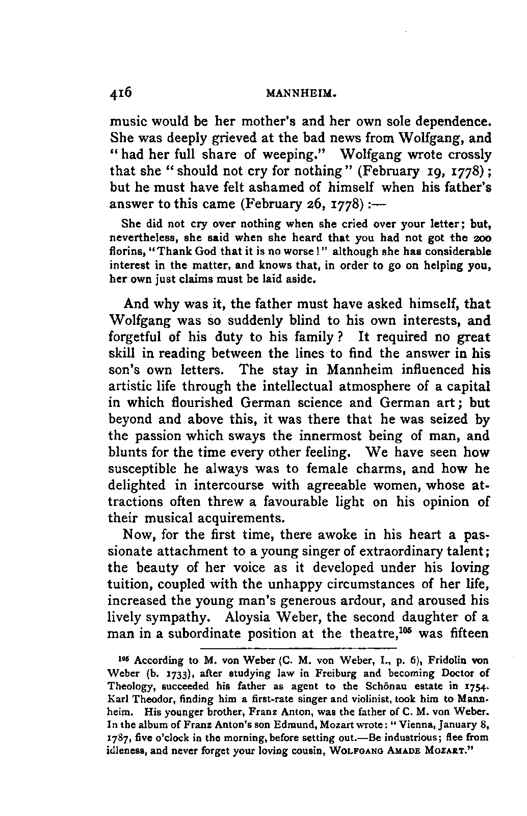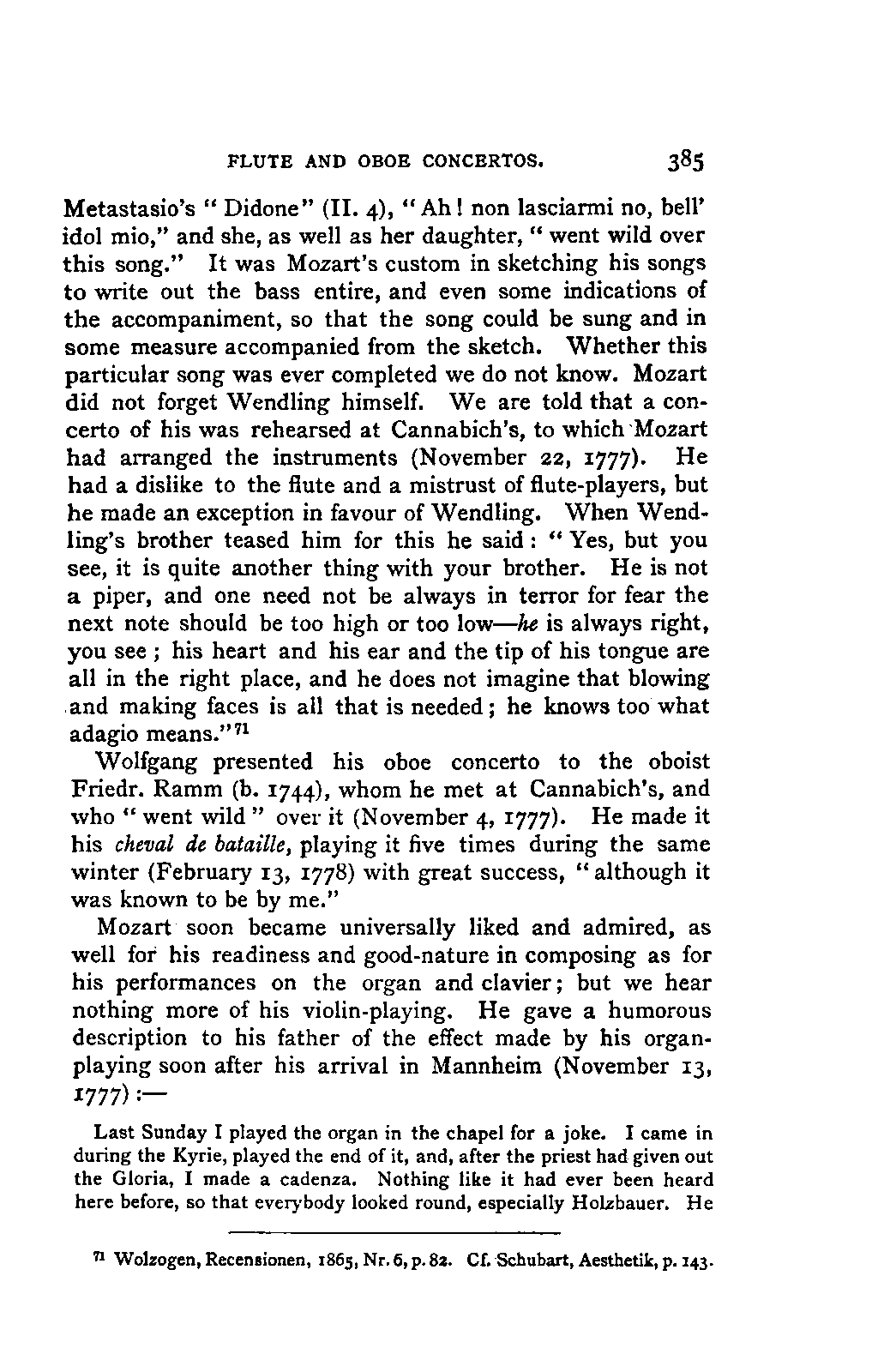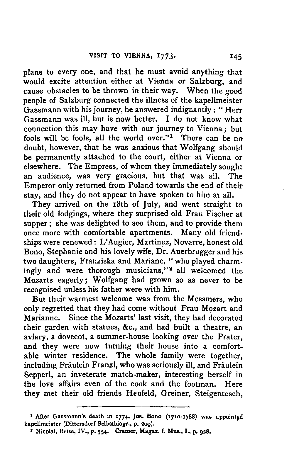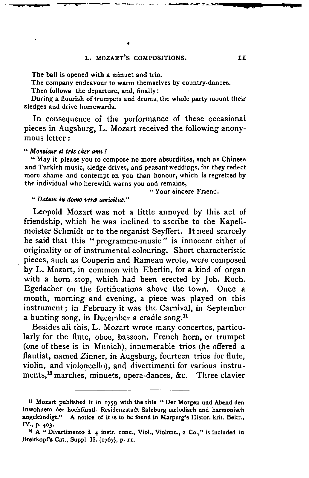 I sometimes regretted, however, that the collection was made more in the spirit of a collector than in the interests of science; so that, for example, he has scarcely ever noted the source of his extracts; but much was brought to my notice which would scarcely otherwise have occurred to me, much trouble was spared, and a number of Mozart's letters were made known to me for the first time. I was unfortunately prevented from thoroughly examining Fuchs's valuable collection of Mozart's compositions in their different editions and copies; my time was short, and I hoped to be able to avail myself of a future opportunity for doing so. This hope was frustrated by the death of Aloys Fuchs a few months after I left Vienna. It has been a painful feeling to me not to be able to express my gratitude for so much friendly service by offering to him the book in which I know he would have taken pleasure.