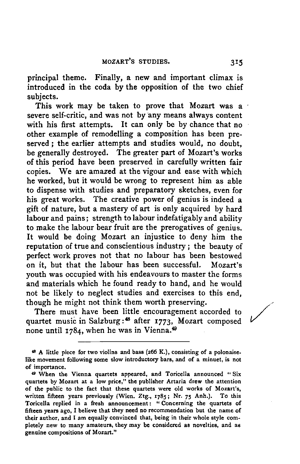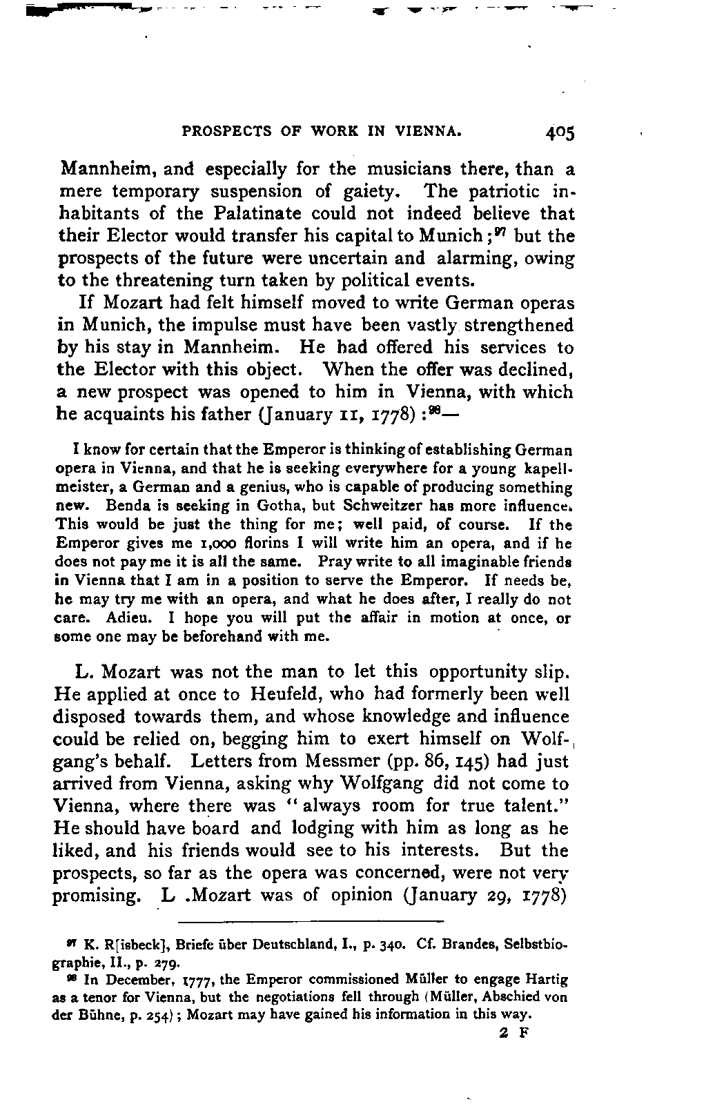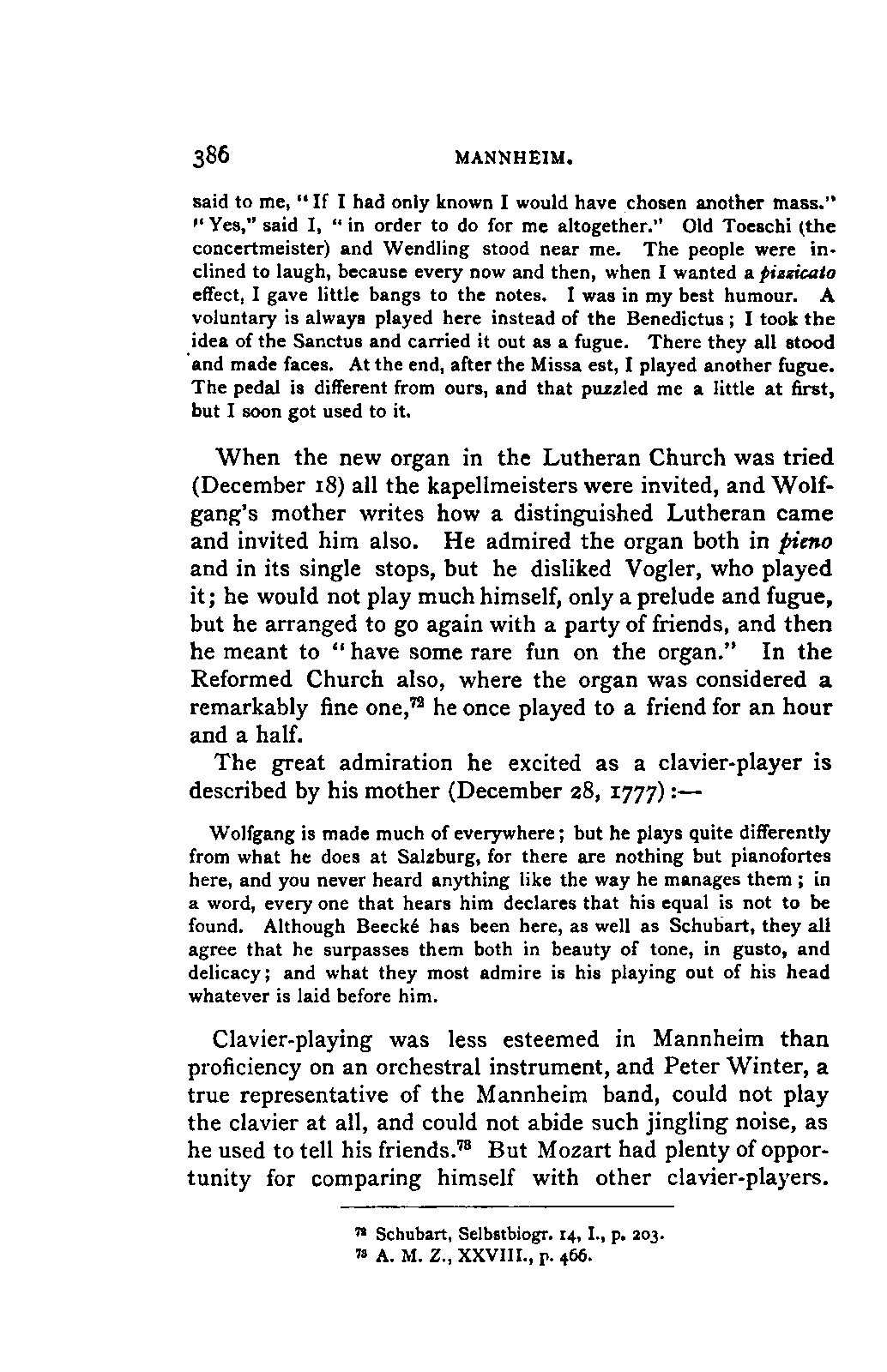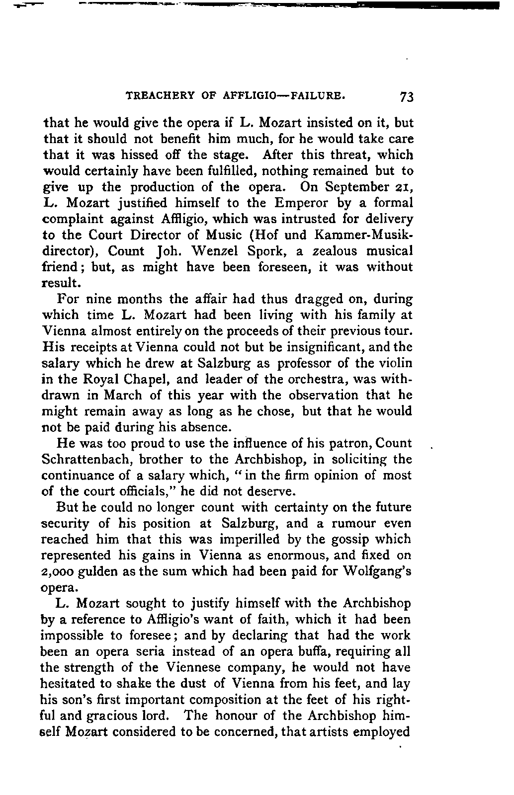 I sometimes regretted, however, that the collection was made more in the spirit of a collector than in the interests of science; so that, for example, he has scarcely ever noted the source of his extracts; but much was brought to my notice which would scarcely otherwise have occurred to me, much trouble was spared, and a number of Mozart's letters were made known to me for the first time. I was unfortunately prevented from thoroughly examining Fuchs's valuable collection of Mozart's compositions in their different editions and copies; my time was short, and I hoped to be able to avail myself of a future opportunity for doing so. This hope was frustrated by the death of Aloys Fuchs a few months after I left Vienna. It has been a painful feeling to me not to be able to express my gratitude for so much friendly service by offering to him the book in which I know he would have taken pleasure.