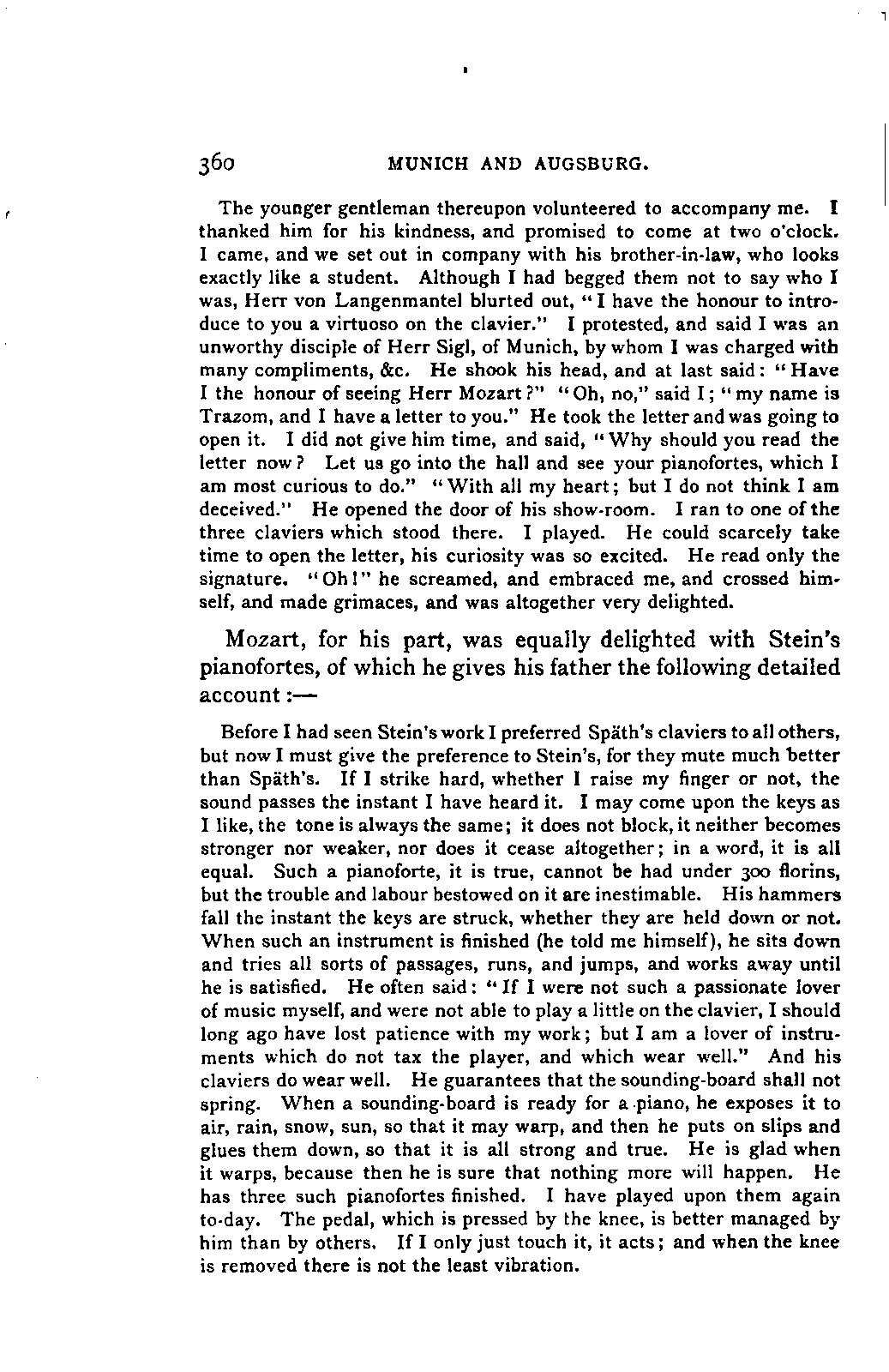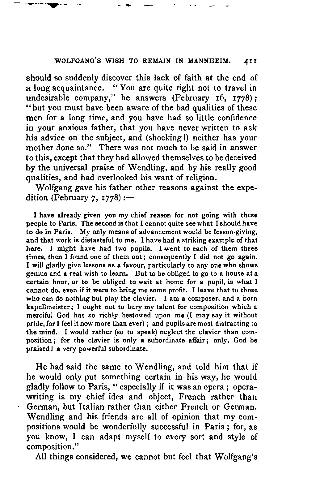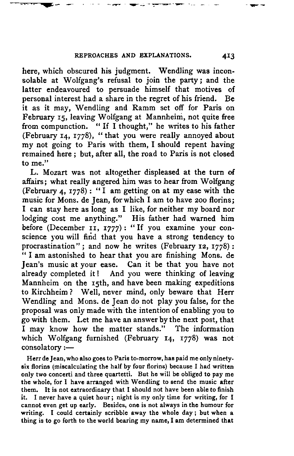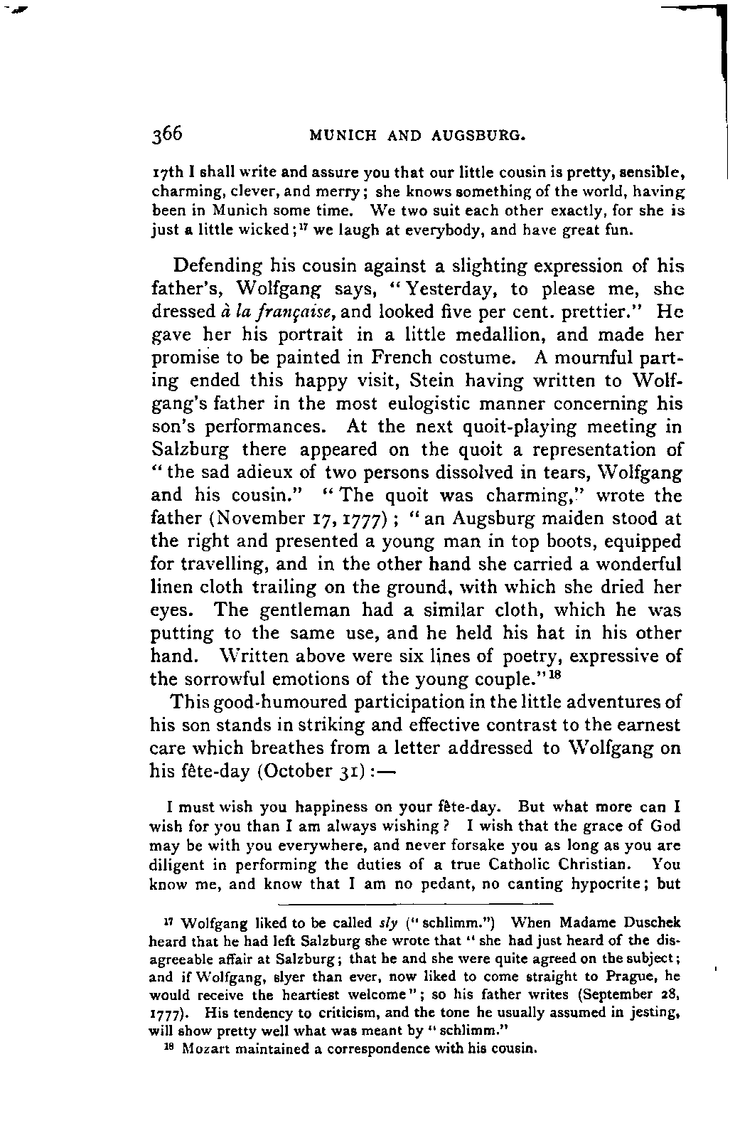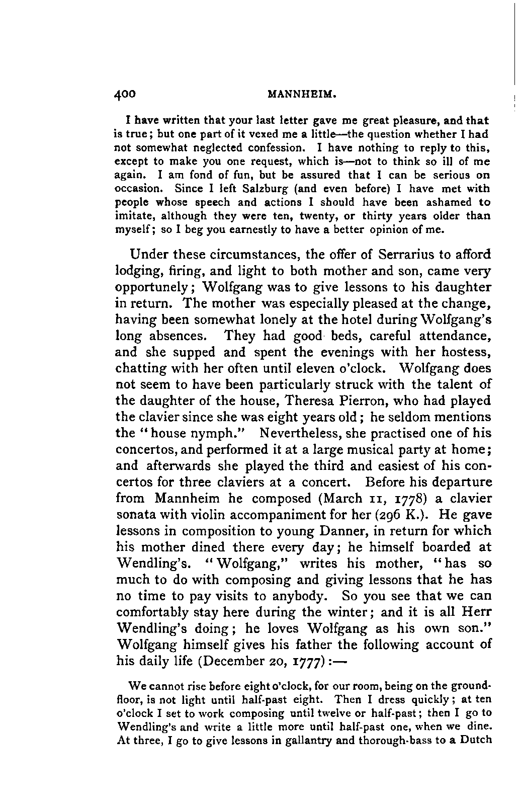I must remark, by the way, that my version cannot be verified by Nissen, since his is neither accurate nor entire; and in order to avoid any misunderstanding, I may also mention, that besides the collections referred to above, many single letters of Leopold and Wolfgang Mozart have come to hand, to which I was able to make more exact reference. As a matter of course, I have made use of originals whenever they were to be had, and of Nissen's version only when they were wanting. From you, my dear friend, I need only request confidence in my scrupulous honesty as to these matters, and I have hope that my book may inspire the reader with a belief in the accuracy of my rendering. It need scarcely be said that I have not made the slightest alteration in the style and expressions of the letters. I have only taken a few liberties with the orthography in order not to distract the reader's attention unnecessarily from the characterisation. I have accurately indicated any reference to authorities other than the letters.