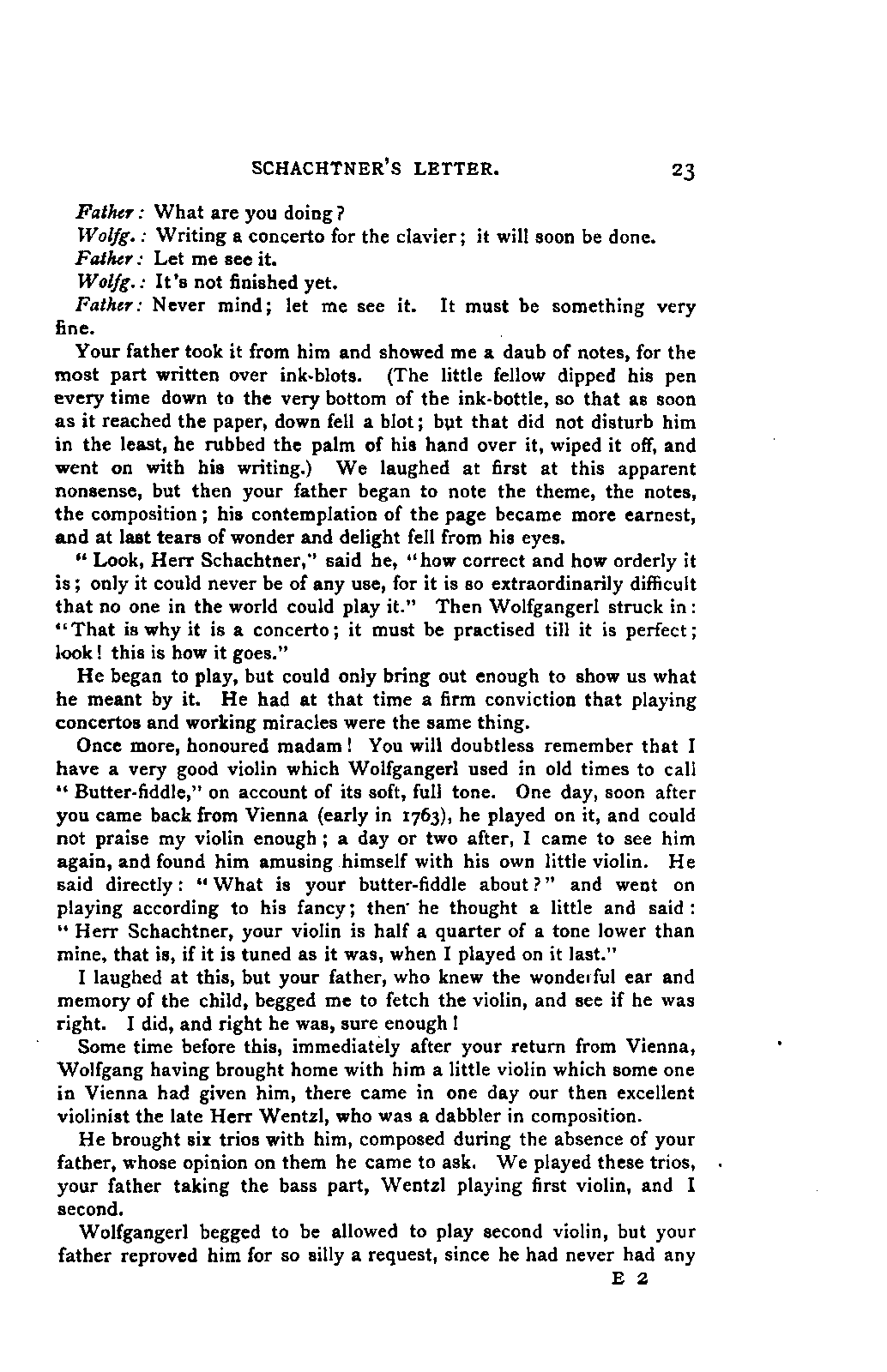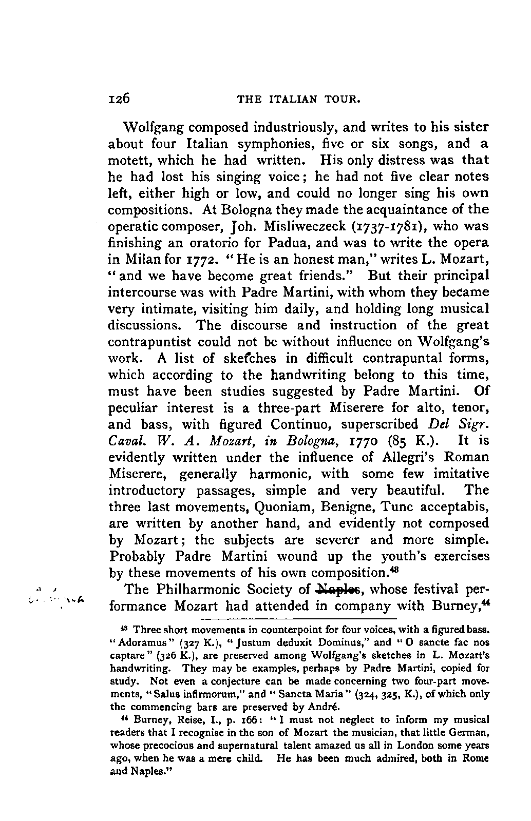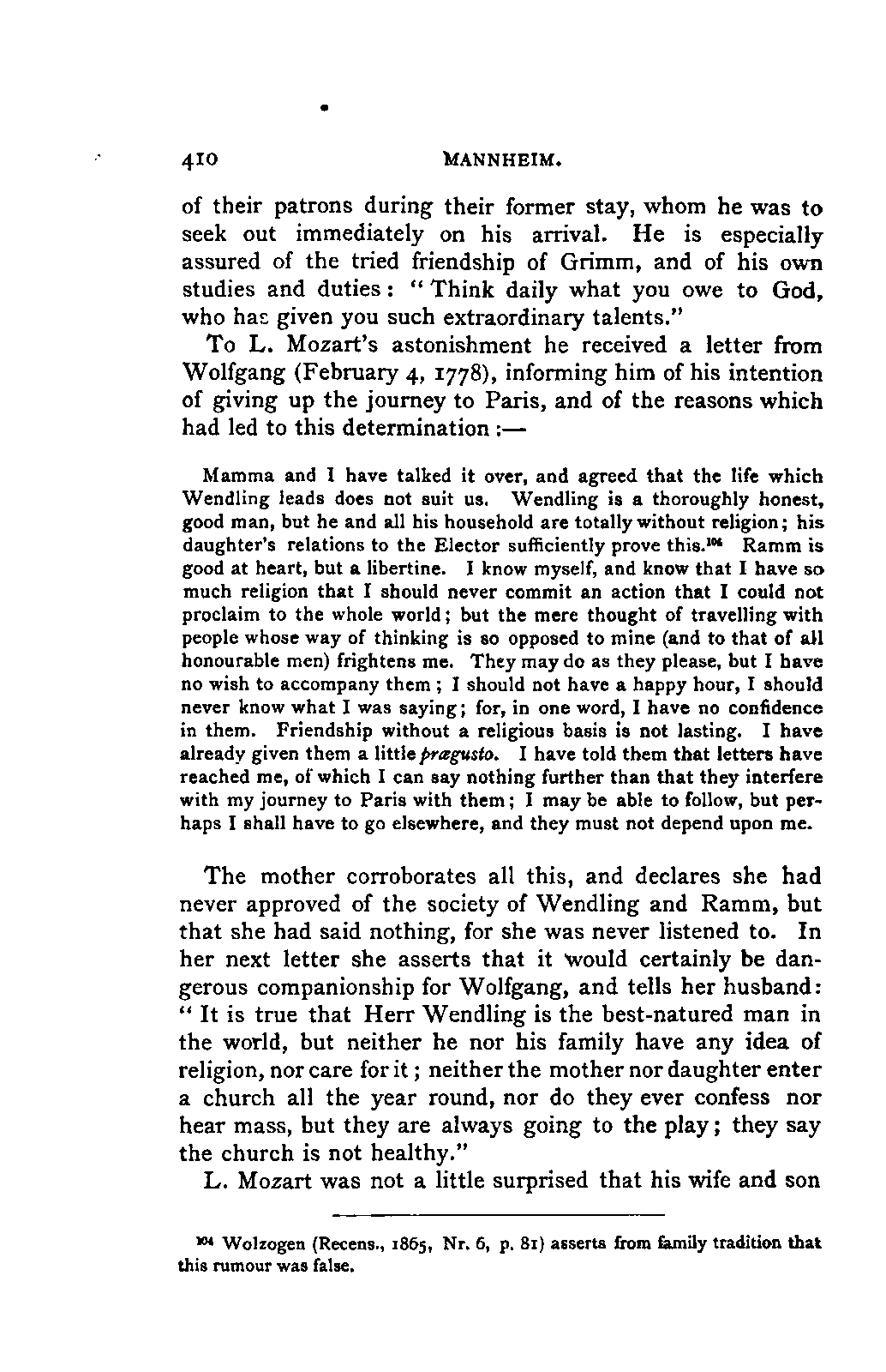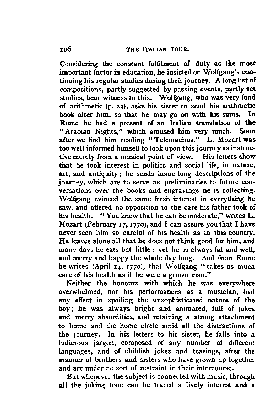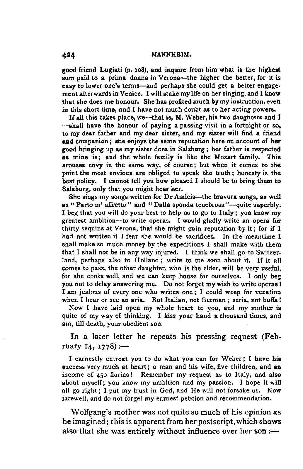 I must remark, by the way, that my version cannot be verified by Nissen, since his is neither accurate nor entire; and in order to avoid any misunderstanding, I may also mention, that besides the collections referred to above, many single letters of Leopold and Wolfgang Mozart have come to hand, to which I was able to make more exact reference. As a matter of course, I have made use of originals whenever they were to be had, and of Nissen's version only when they were wanting. From you, my dear friend, I need only request confidence in my scrupulous honesty as to these matters, and I have hope that my book may inspire the reader with a belief in the accuracy of my rendering. It need scarcely be said that I have not made the slightest alteration in the style and expressions of the letters. I have only taken a few liberties with the orthography in order not to distract the reader's attention unnecessarily from the characterisation. I have accurately indicated any reference to authorities other than the letters.