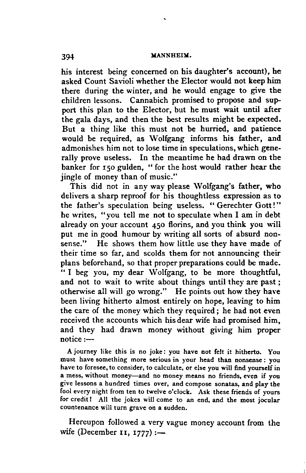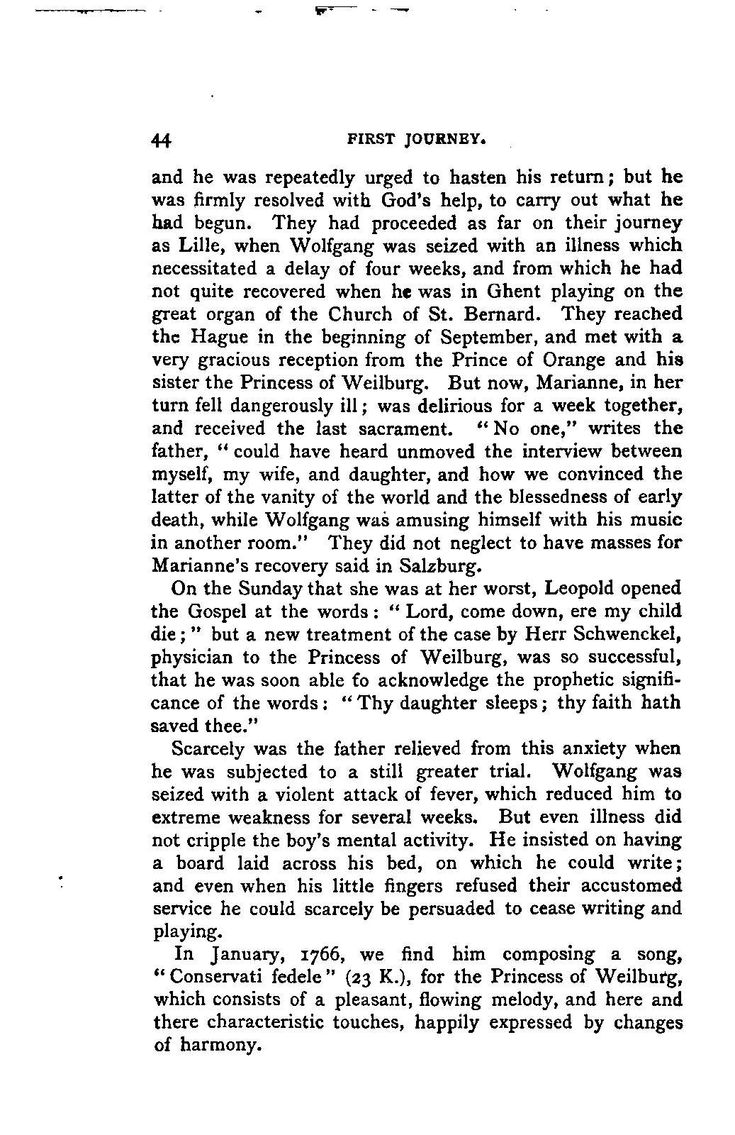 Besides a number of separate deeds, letters, and memoranda, he had at his disposal: Leopold Mozart's letters to Hagenauer during the journey to Vienna (September, 1762, to January, 1763); during the great journey (from June, 1763, to November, 1766); during the Vienna journey (September, 1767, to December, 1768); letters both of the father and son to their family during the Italian journey (December, 1769, to March, 1771; from August 13, 1771, to December, 1771; from October, 1772, to March, 1773); from Vienna (July, 1773, to September, 1773); from Munich (December, 1774, to March, 1775); Wolfgang's and his mother's letters home, together with the answers of Leopold and his daughter during the journey to Paris (September, 1777, to January, 1779); Wolfgang's correspondence with his father and sister during his journey to Munich and residence in Vienna. Wolfgang's letters come down to 1784, his father's to 1781.