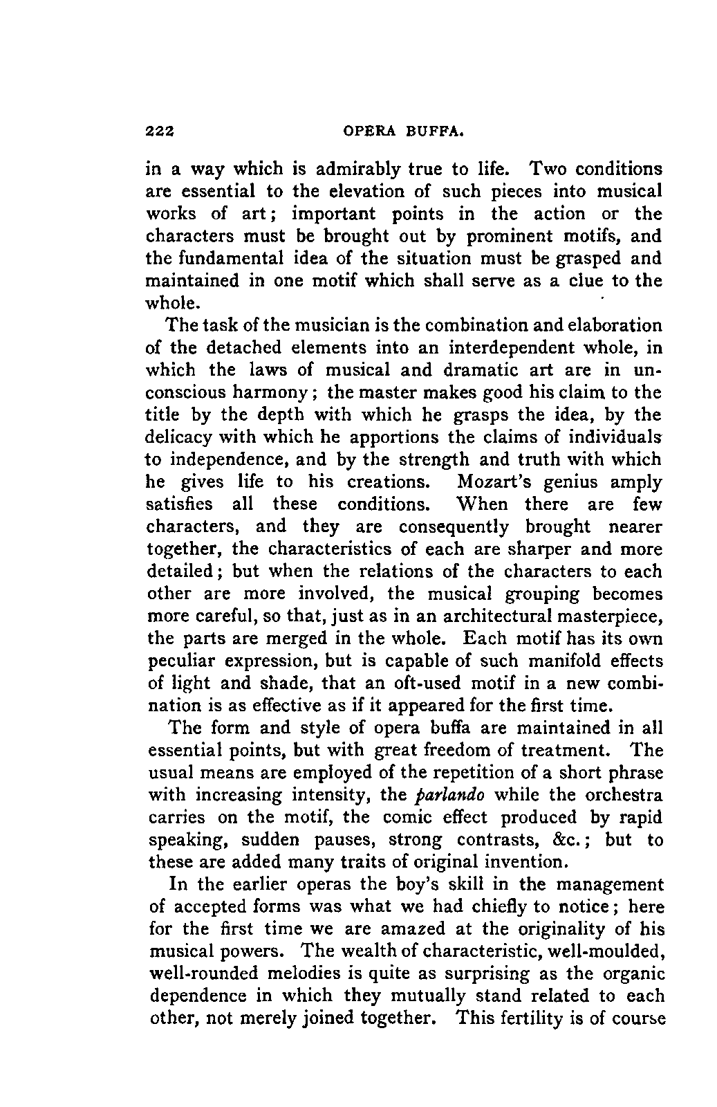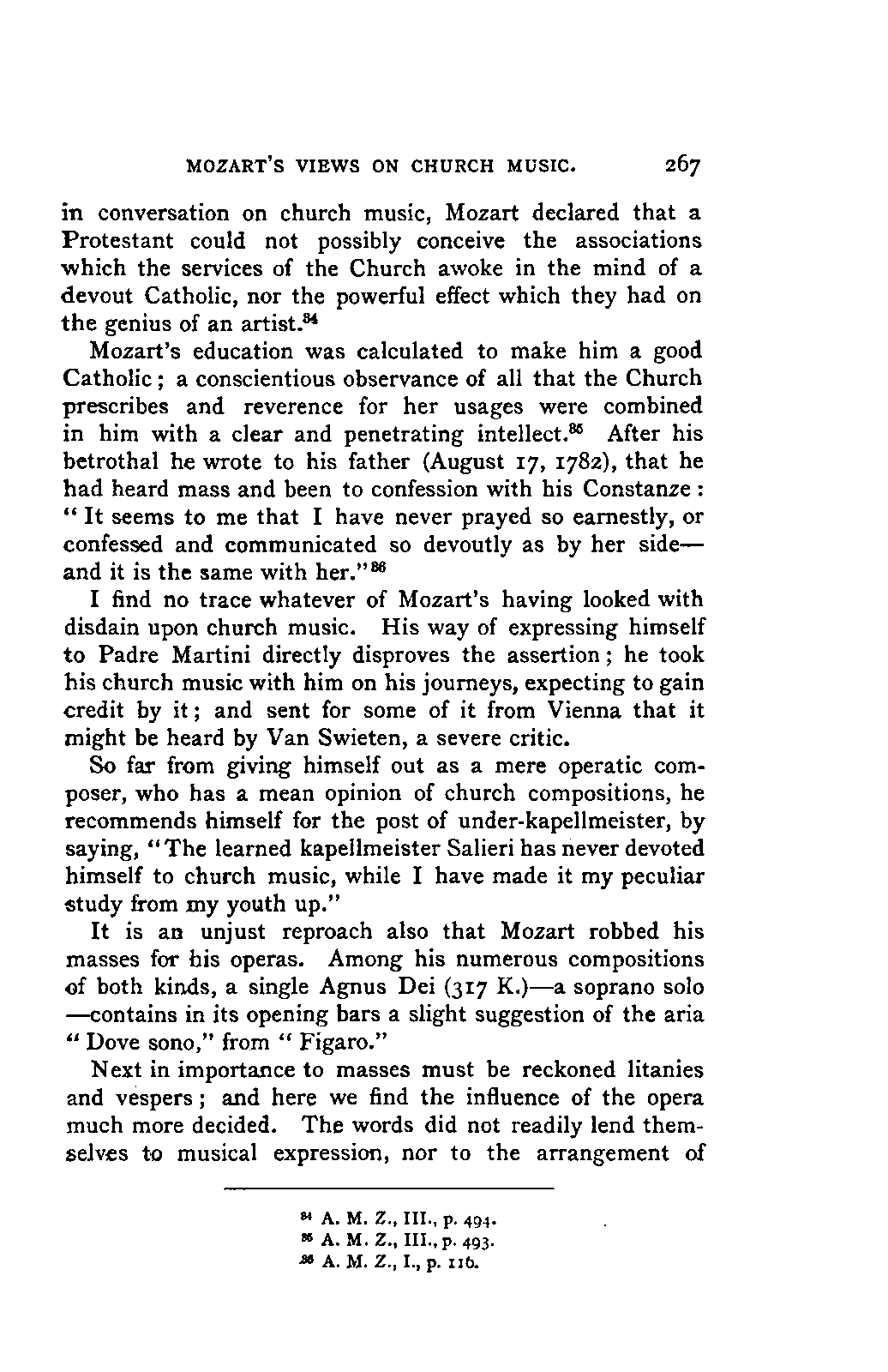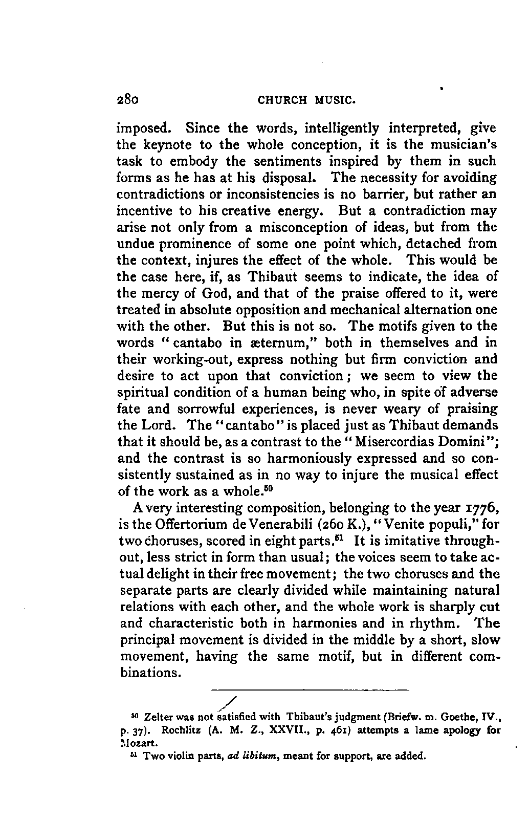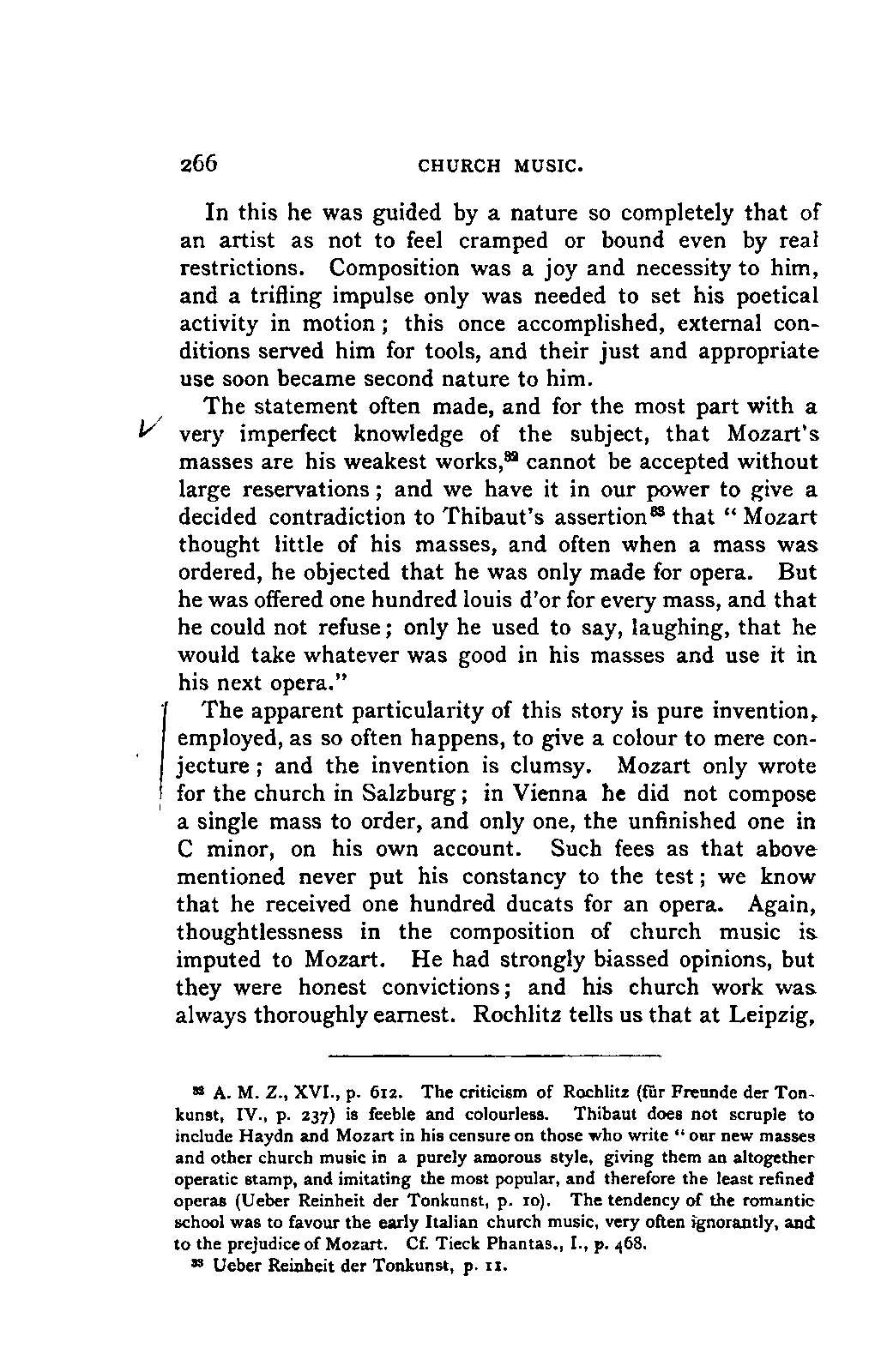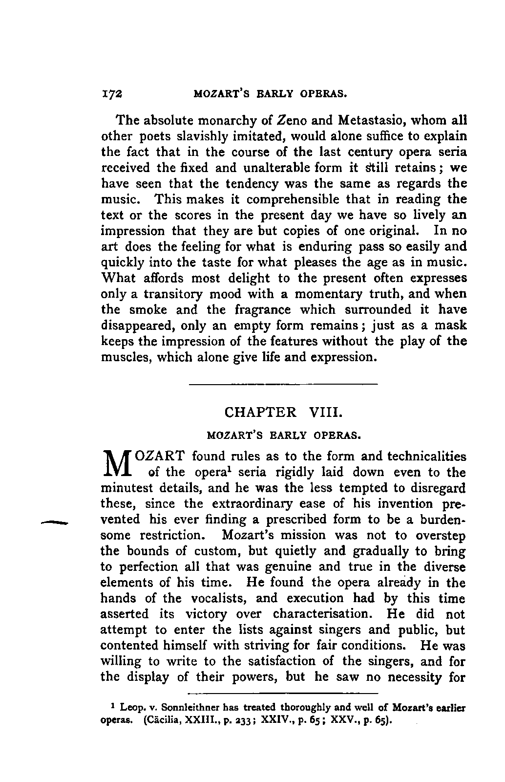 You will perceive, my dear friend, that all this led, of necessity, to fresh disclosures, to a fuller and more accurate insight into that which had hitherto been only partially known; and you will further take for granted that I, as a "philolog," would not neglect such researches into the literature of my subject as should bring together the scattered materials available for my task. But you must keep in mind that musical literature is not so accessible as philological; and that many expedients, which lighten our labours in the latter path, are wholly wanting in the former. I am, therefore, far from flattering myself that I have even approached a complete study of the literature of my subject. I only aimed at such a study so far as it concerned main principles; for to become acquainted with, or even to quote, everything that has been thought, dreamt, or raved concerning Mozart's music was as far from my intention as from my desire. I was more than satisfied with what came in my way of this kind in the course of my reading, and my INTRODUCTION. [xix] readers will be more than satisfied with what I offer them of it by way of example.