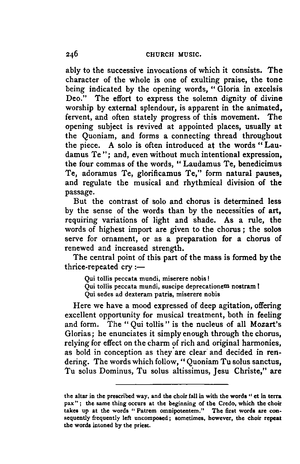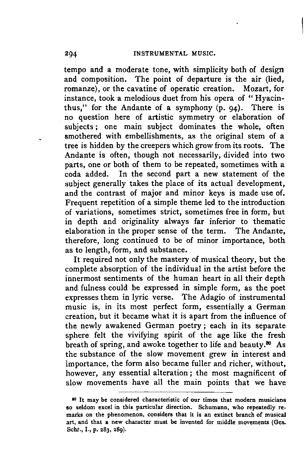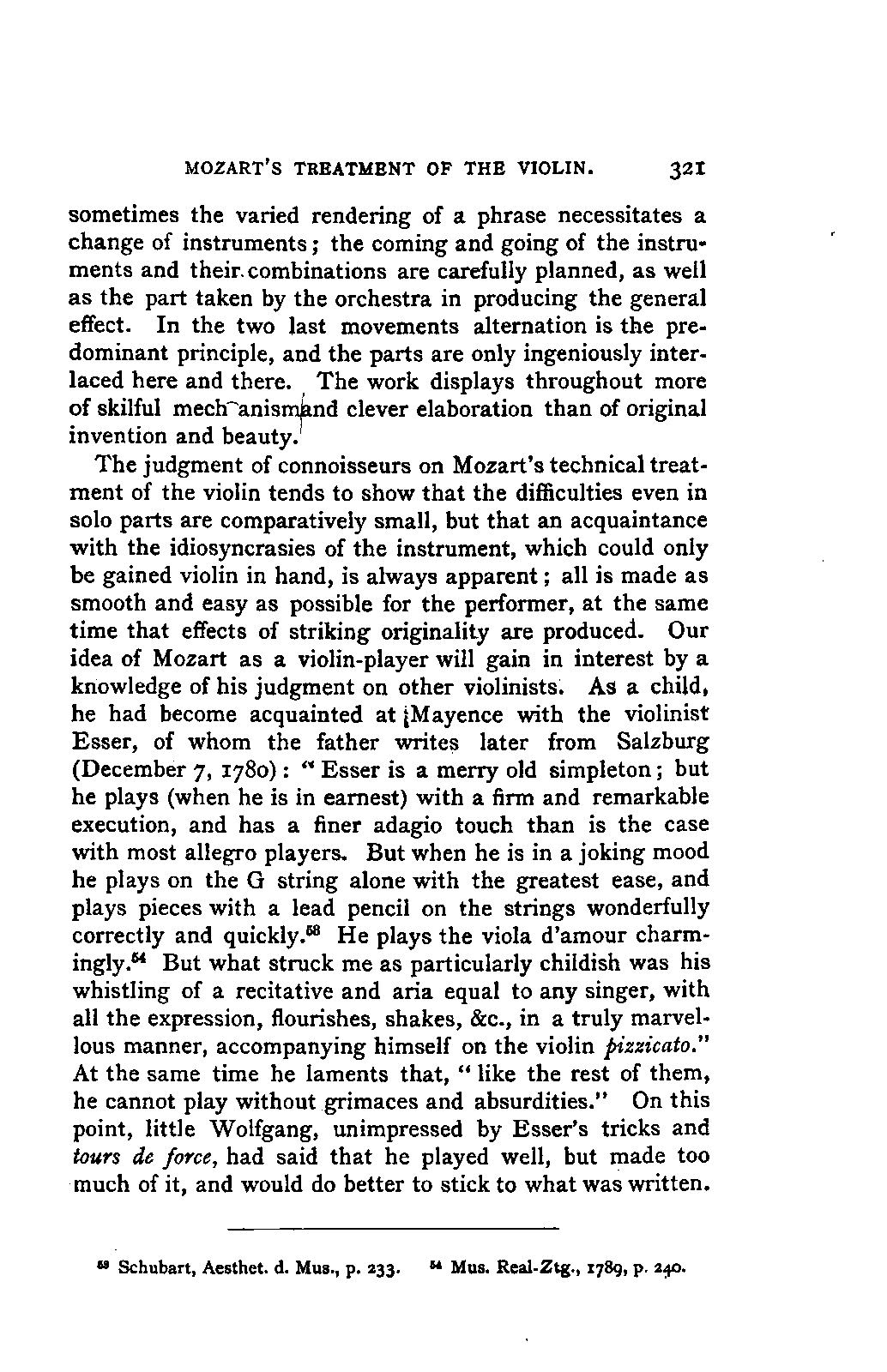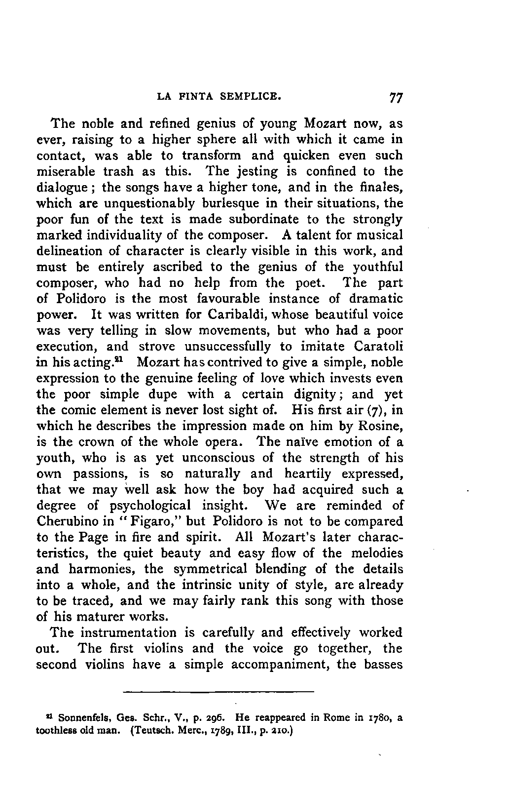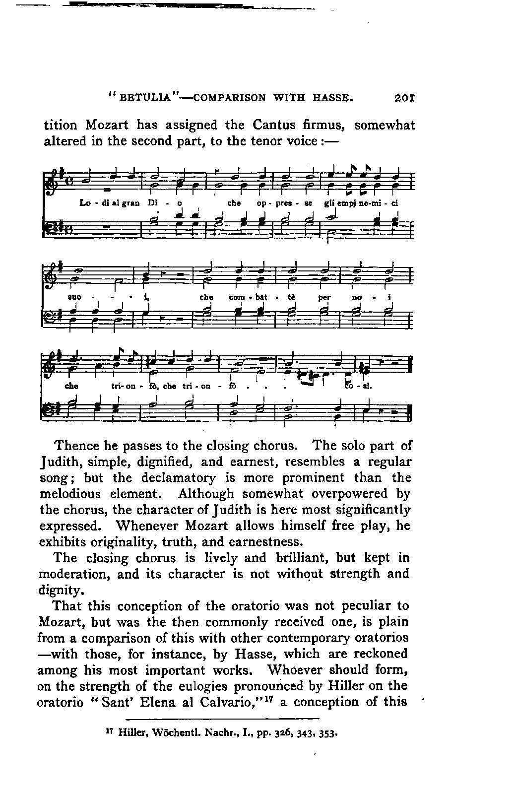 You will perceive, my dear friend, that all this led, of necessity, to fresh disclosures, to a fuller and more accurate insight into that which had hitherto been only partially known; and you will further take for granted that I, as a "philolog," would not neglect such researches into the literature of my subject as should bring together the scattered materials available for my task. But you must keep in mind that musical literature is not so accessible as philological; and that many expedients, which lighten our labours in the latter path, are wholly wanting in the former. I am, therefore, far from flattering myself that I have even approached a complete study of the literature of my subject. I only aimed at such a study so far as it concerned main principles; for to become acquainted with, or even to quote, everything that has been thought, dreamt, or raved concerning Mozart's music was as far from my intention as from my desire. I was more than satisfied with what came in my way of this kind in the course of my reading, and my INTRODUCTION. [xix] readers will be more than satisfied with what I offer them of it by way of example.