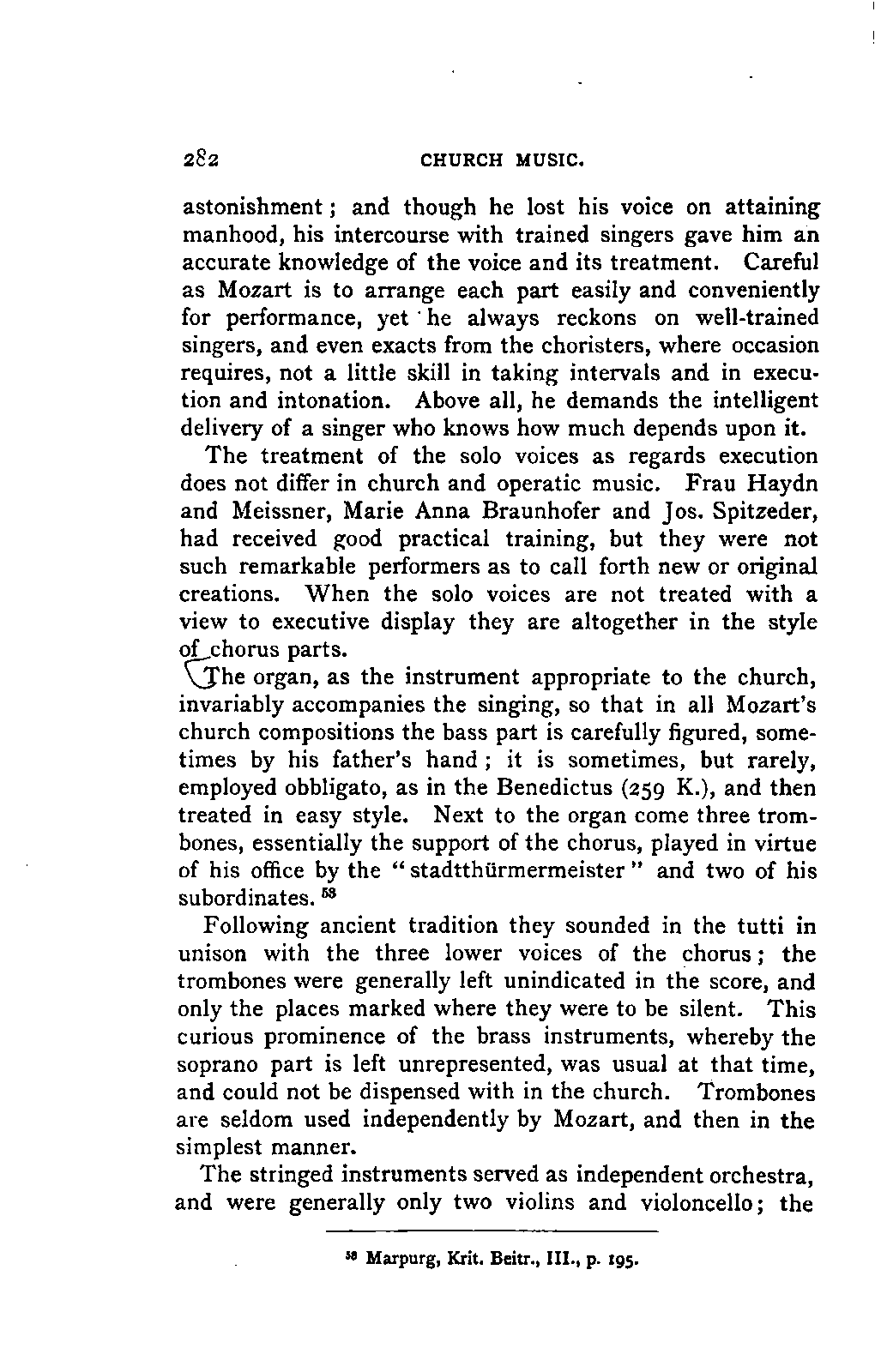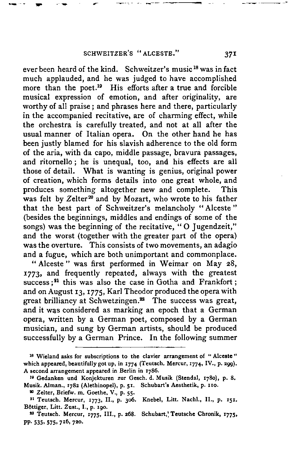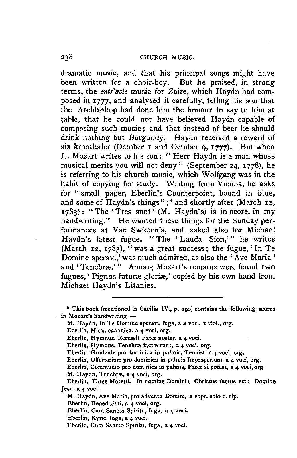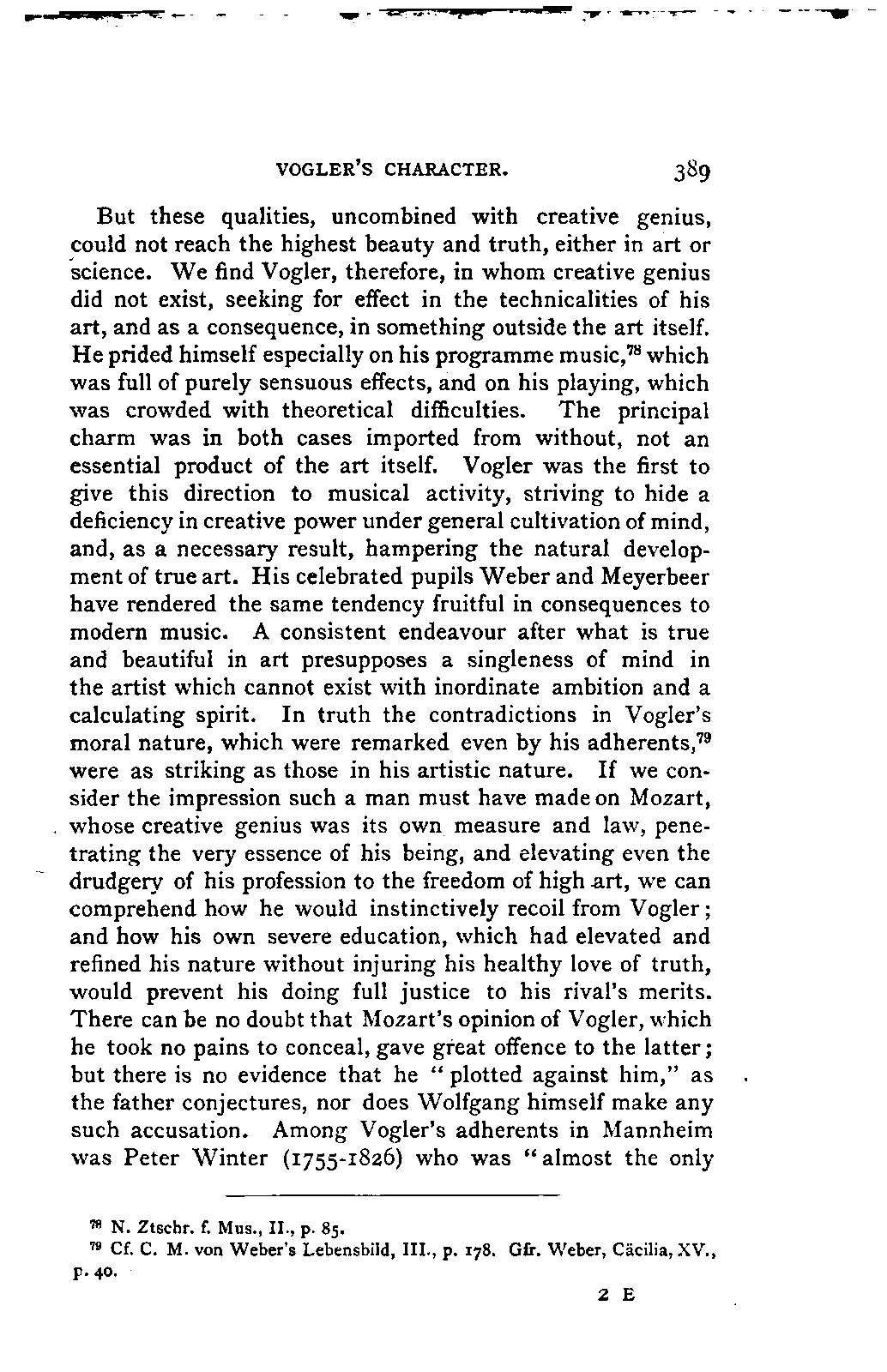 The new branch of musical literature, founded by Holmes and Jahn, already shows some considerable monuments. Passing by the voluminous and accurate thematic catalogues of Mozart by the Ritter von Köchel (1862), of Weber by Jahns (1871), and of Beethoven and Schubert by Nottebohm (1868 and 1874), works which properly belong to a separate department of the subject—we already possess the Life of Handel by Chrysander (vol. i., 1858; II., 1860; III., 1867), that of Beethoven by A. W. Thayer (vol. i., 1866; II., 1872; III., 1879), that of Haydn by C. F. Pohl (vol. i., 1875; II., 1882)—all three still in progress—and that of Bach by Spitta (vol. i., 1873; II., 1880). But these laborious and conscientious works, while they rival and even surpass Jahn in their wide range and the manner in which they embalm every minute particular relating to the subject, are far behind him in lucidity, and in the ease with which he handles his vast materials. In these respects, as might be expected from his literary position, Otto Jahn stands hitherto quite alone.