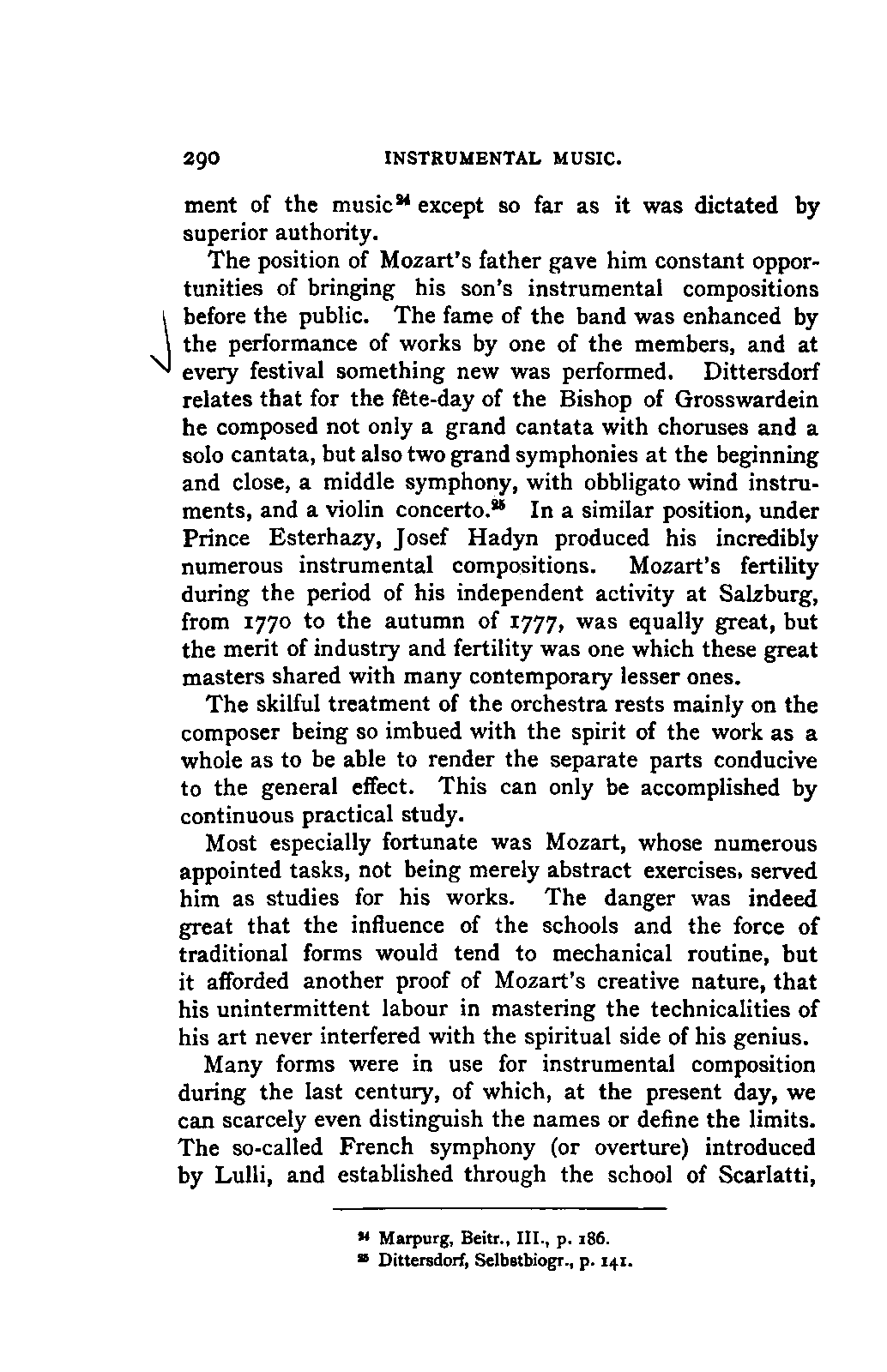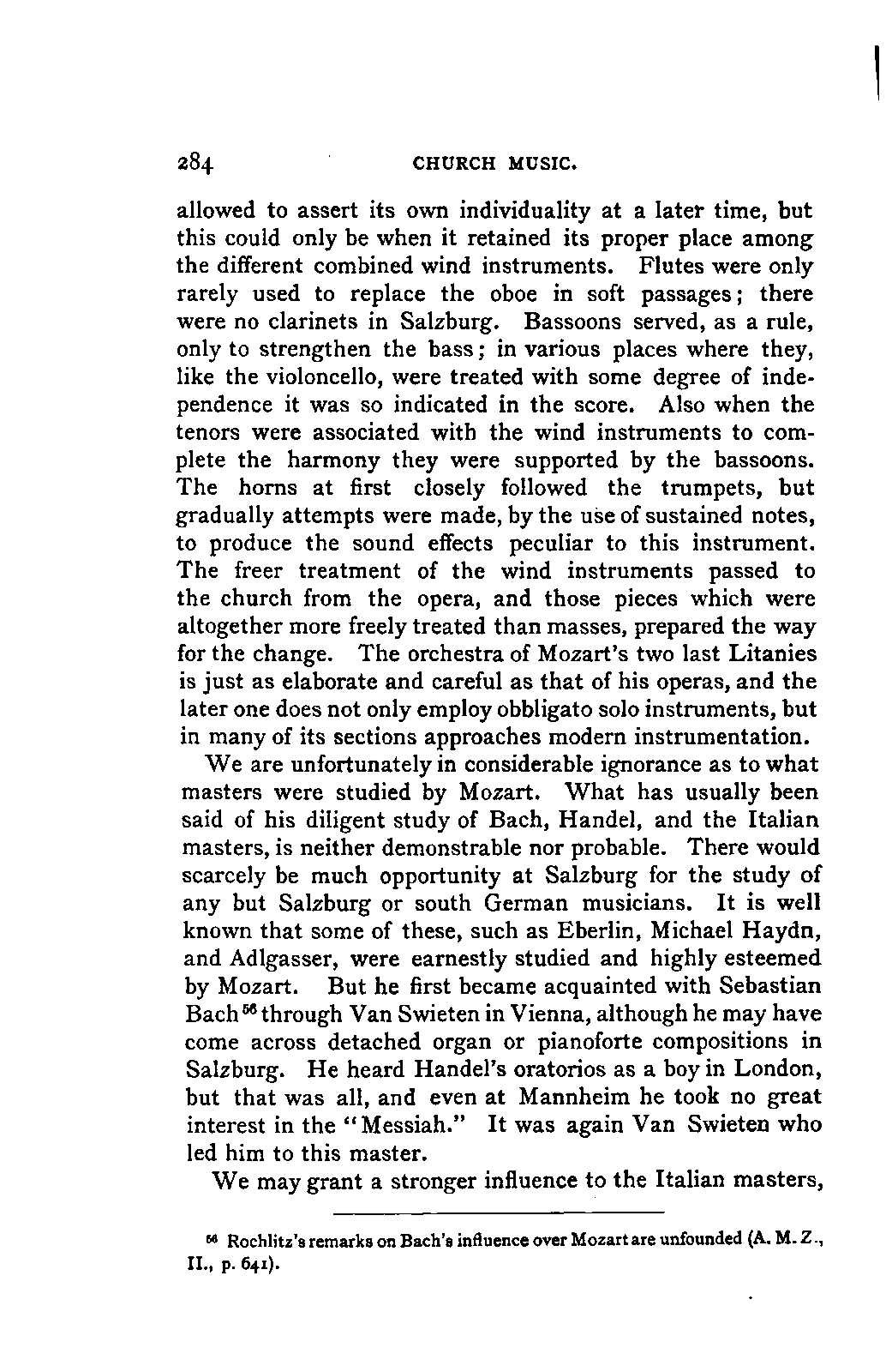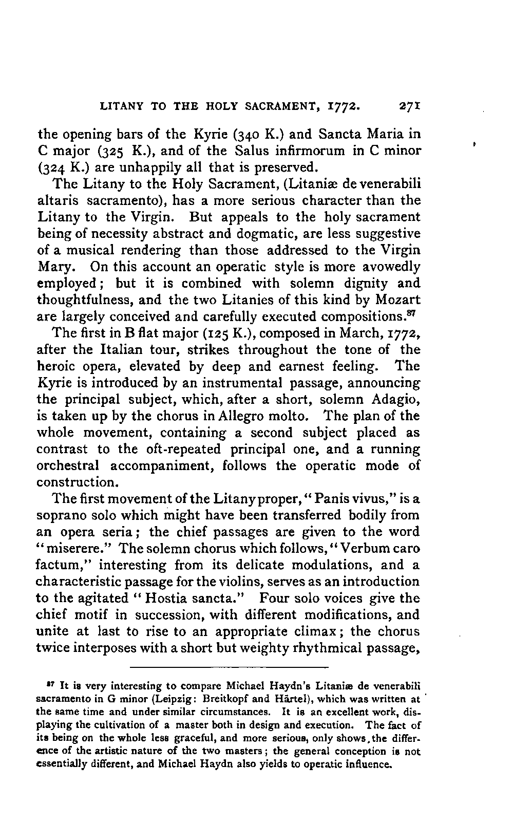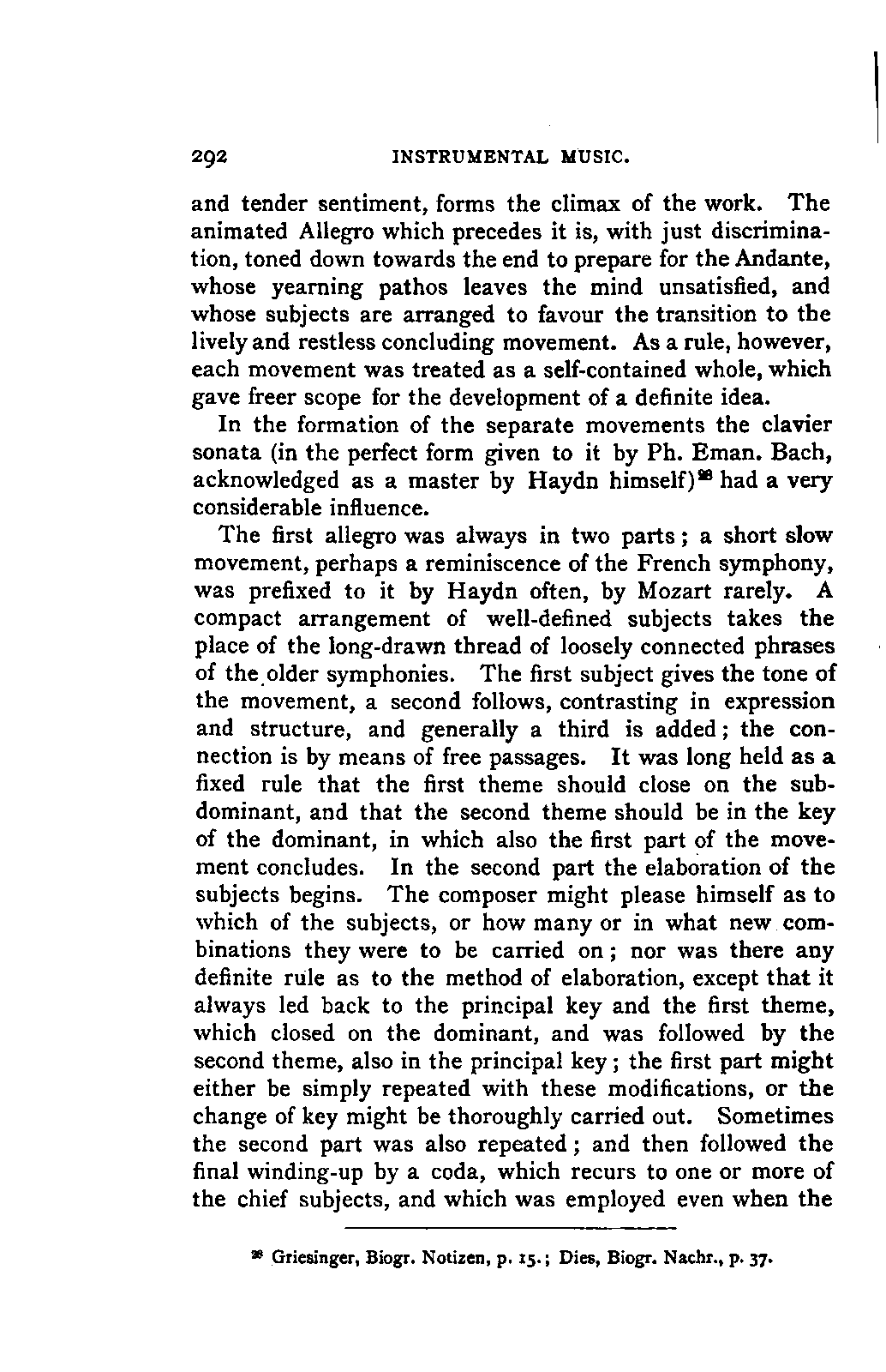 The new branch of musical literature, founded by Holmes and Jahn, already shows some considerable monuments. Passing by the voluminous and accurate thematic catalogues of Mozart by the Ritter von Köchel (1862), of Weber by Jahns (1871), and of Beethoven and Schubert by Nottebohm (1868 and 1874), works which properly belong to a separate department of the subject—we already possess the Life of Handel by Chrysander (vol. i., 1858; II., 1860; III., 1867), that of Beethoven by A. W. Thayer (vol. i., 1866; II., 1872; III., 1879), that of Haydn by C. F. Pohl (vol. i., 1875; II., 1882)—all three still in progress—and that of Bach by Spitta (vol. i., 1873; II., 1880). But these laborious and conscientious works, while they rival and even surpass Jahn in their wide range and the manner in which they embalm every minute particular relating to the subject, are far behind him in lucidity, and in the ease with which he handles his vast materials. In these respects, as might be expected from his literary position, Otto Jahn stands hitherto quite alone.