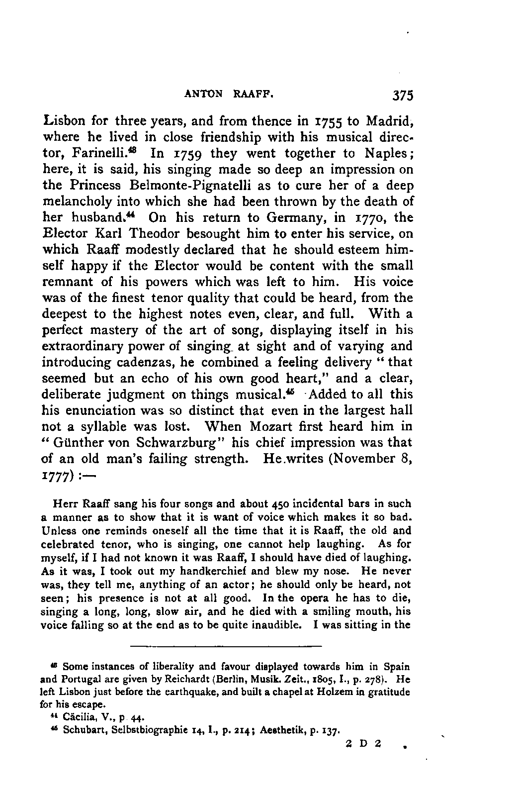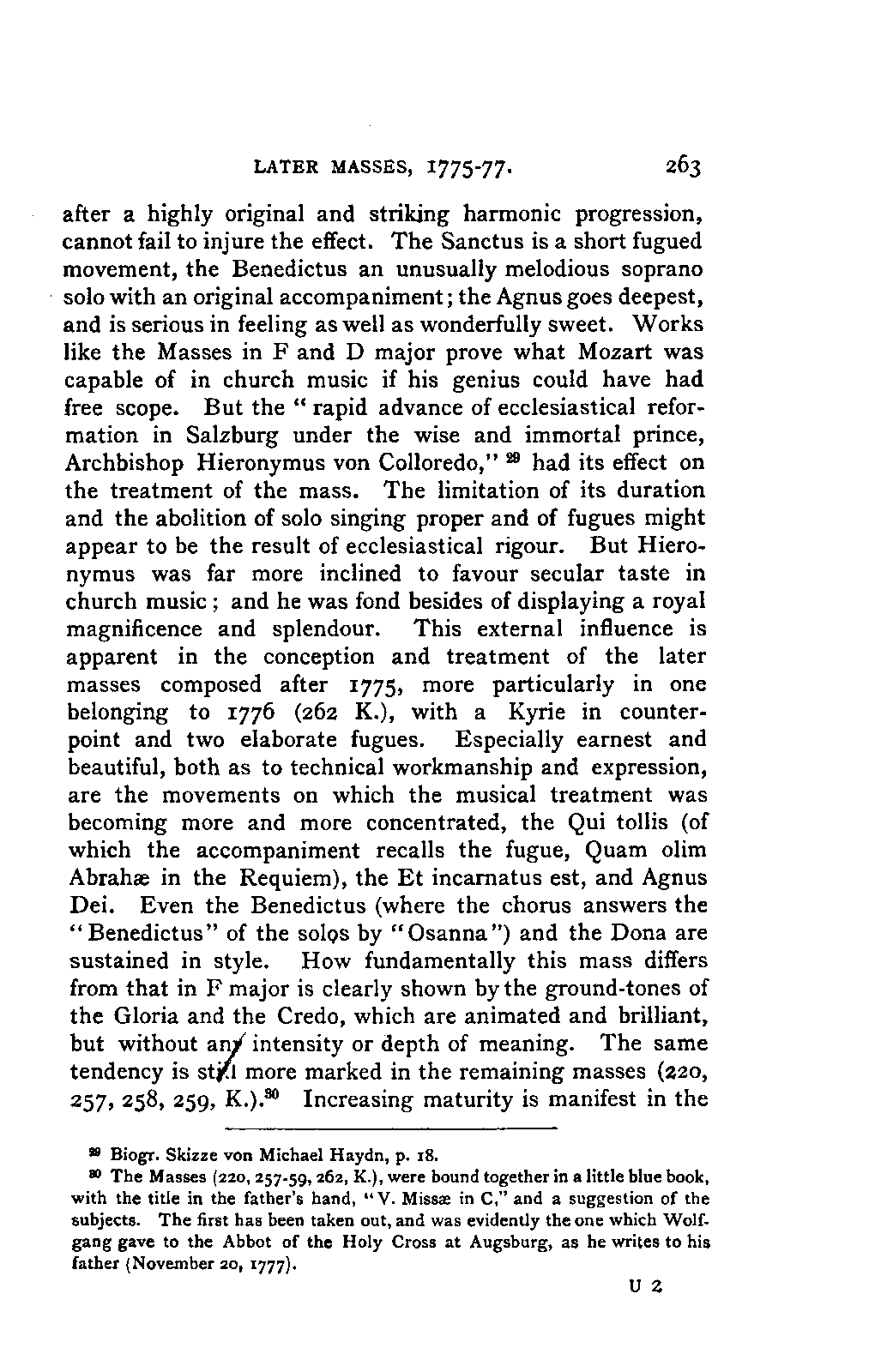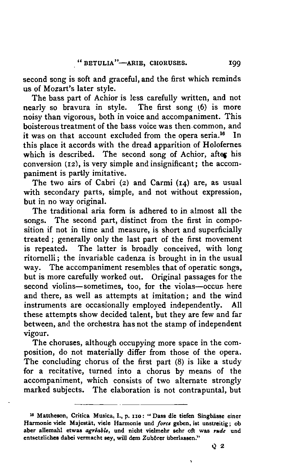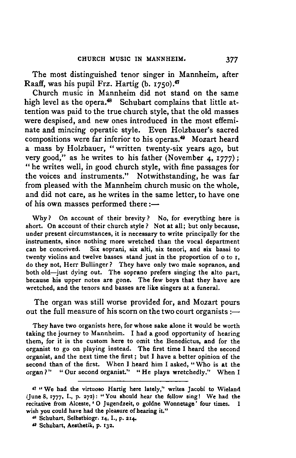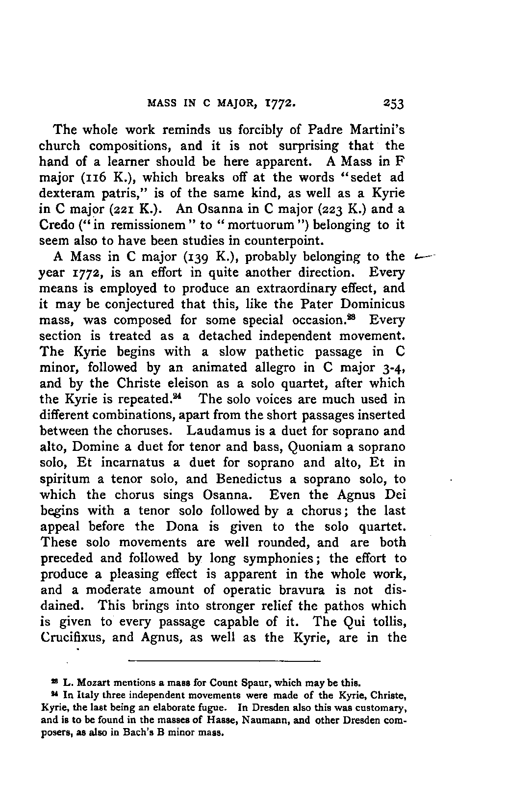 The new branch of musical literature, founded by Holmes and Jahn, already shows some considerable monuments. Passing by the voluminous and accurate thematic catalogues of Mozart by the Ritter von Köchel (1862), of Weber by Jahns (1871), and of Beethoven and Schubert by Nottebohm (1868 and 1874), works which properly belong to a separate department of the subject—we already possess the Life of Handel by Chrysander (vol. i., 1858; II., 1860; III., 1867), that of Beethoven by A. W. Thayer (vol. i., 1866; II., 1872; III., 1879), that of Haydn by C. F. Pohl (vol. i., 1875; II., 1882)—all three still in progress—and that of Bach by Spitta (vol. i., 1873; II., 1880). But these laborious and conscientious works, while they rival and even surpass Jahn in their wide range and the manner in which they embalm every minute particular relating to the subject, are far behind him in lucidity, and in the ease with which he handles his vast materials. In these respects, as might be expected from his literary position, Otto Jahn stands hitherto quite alone.