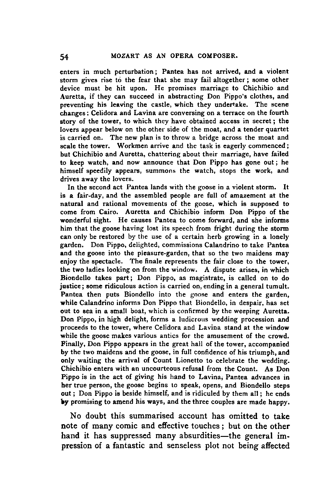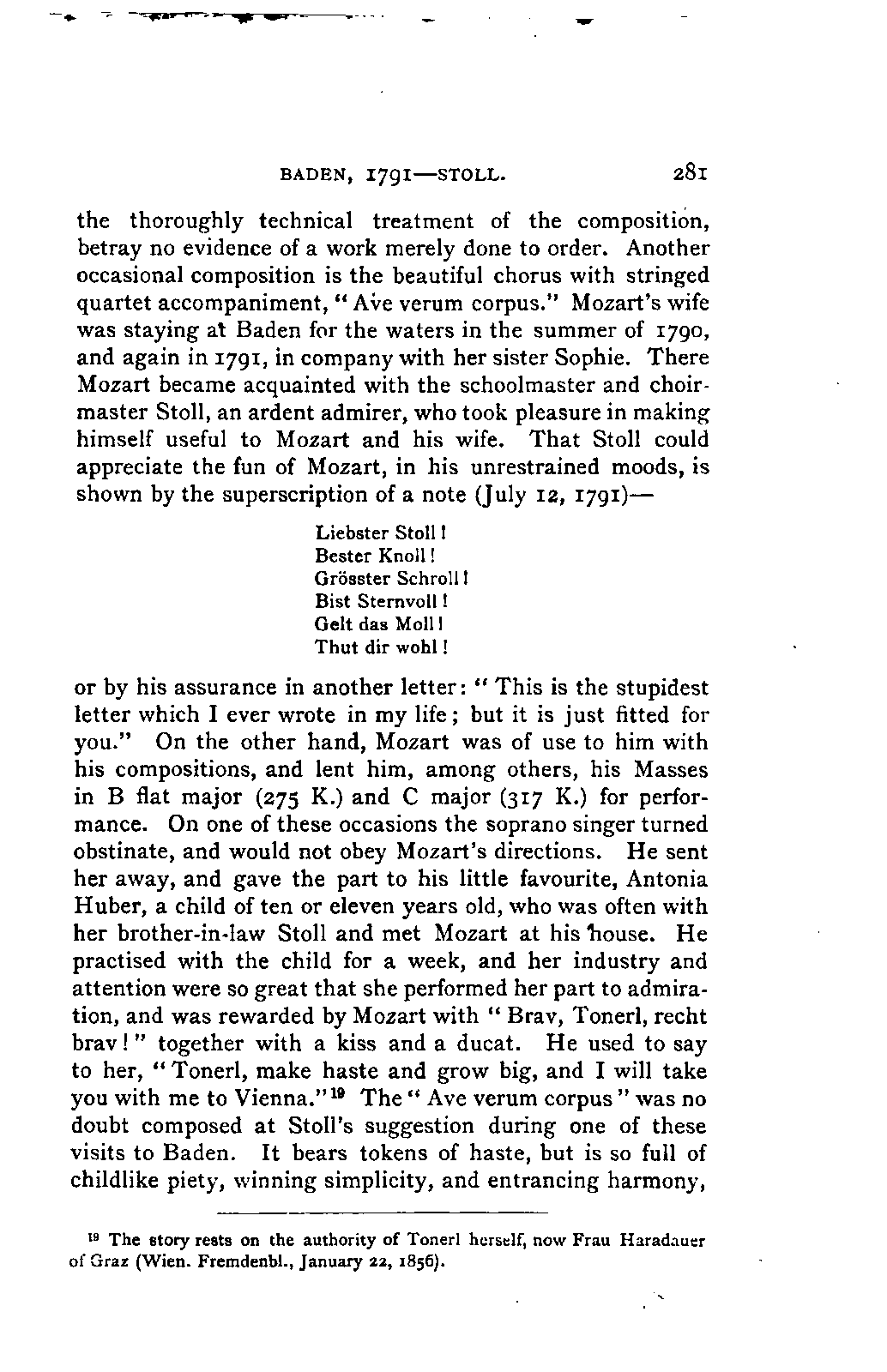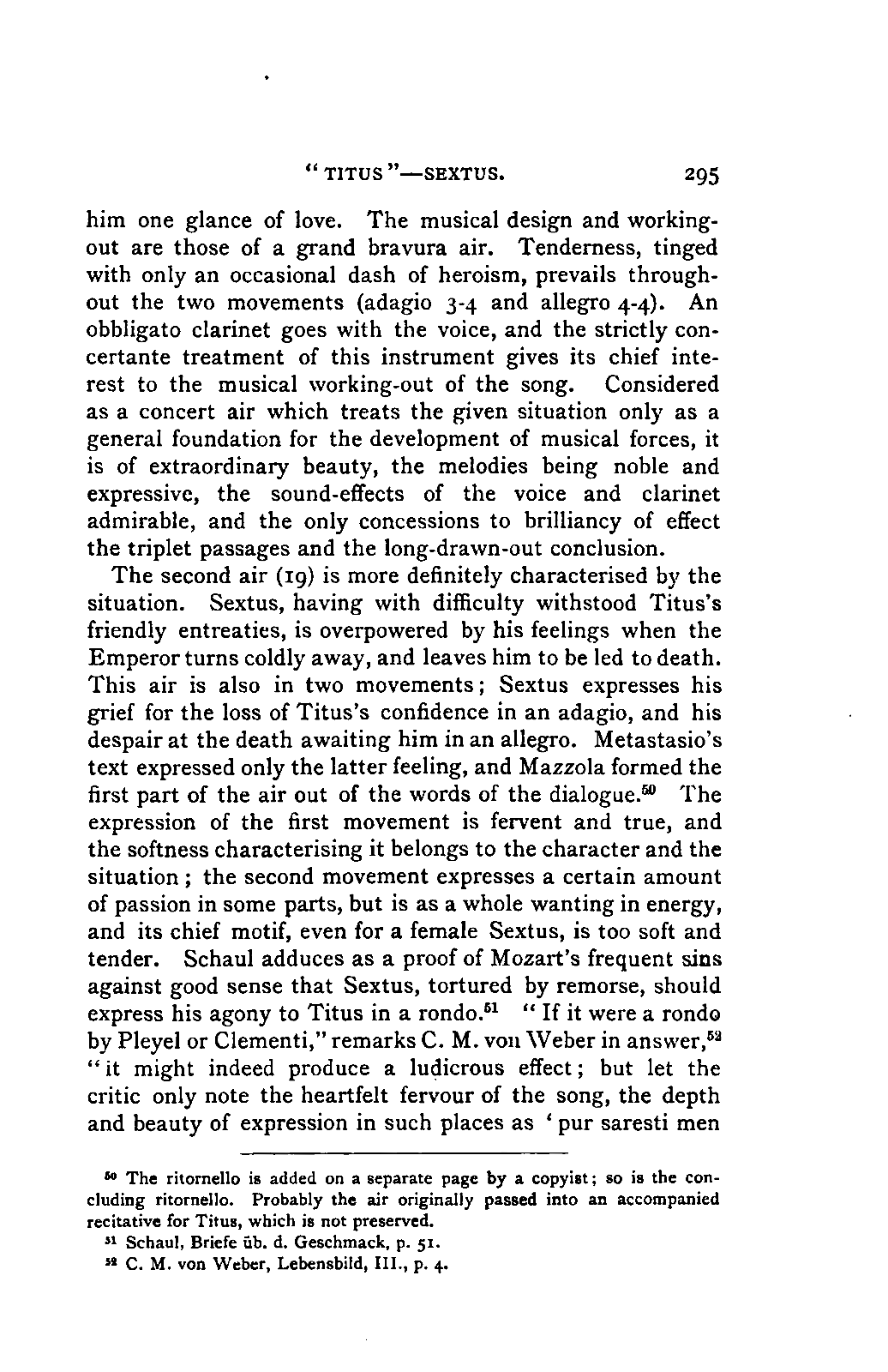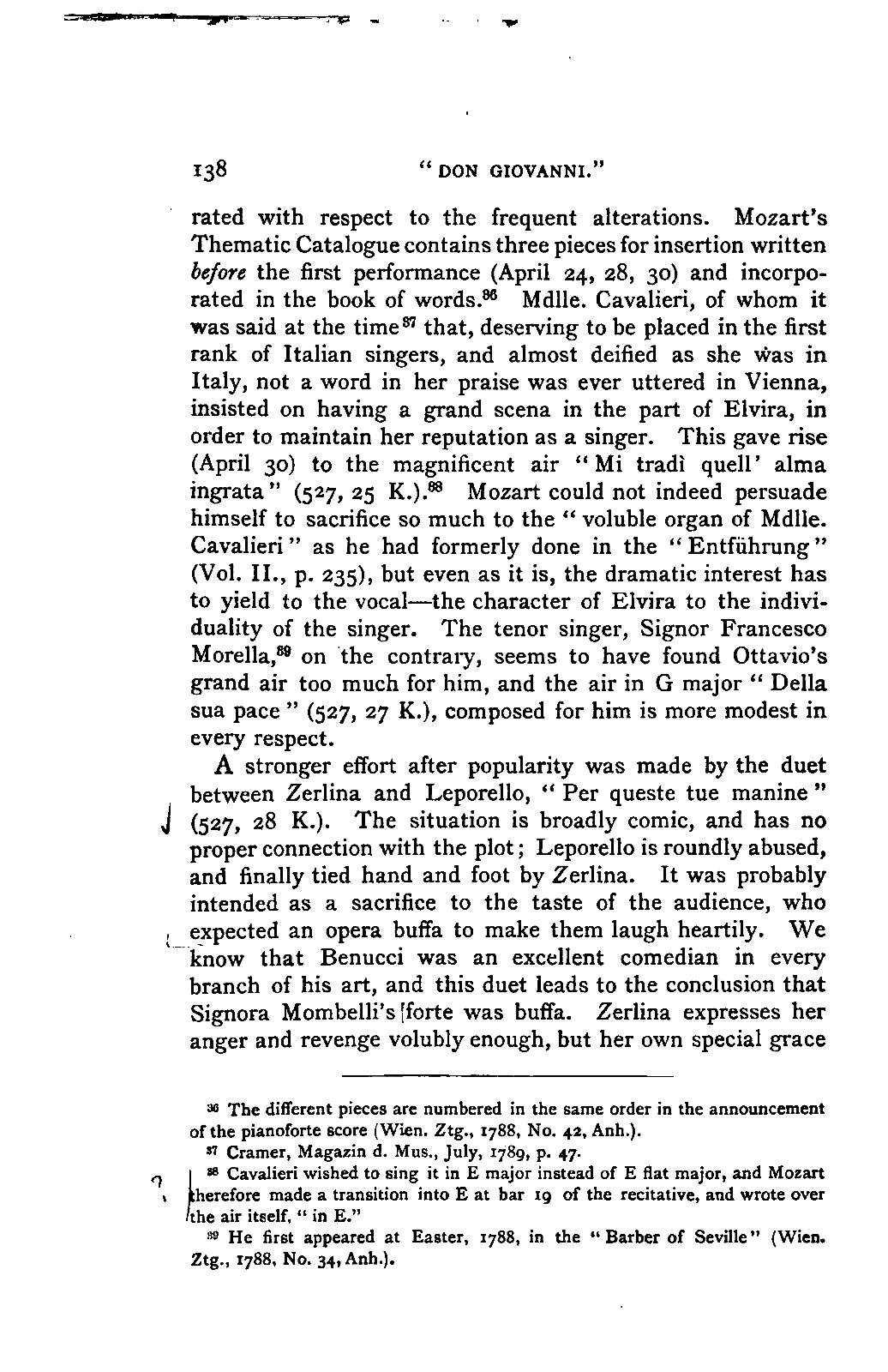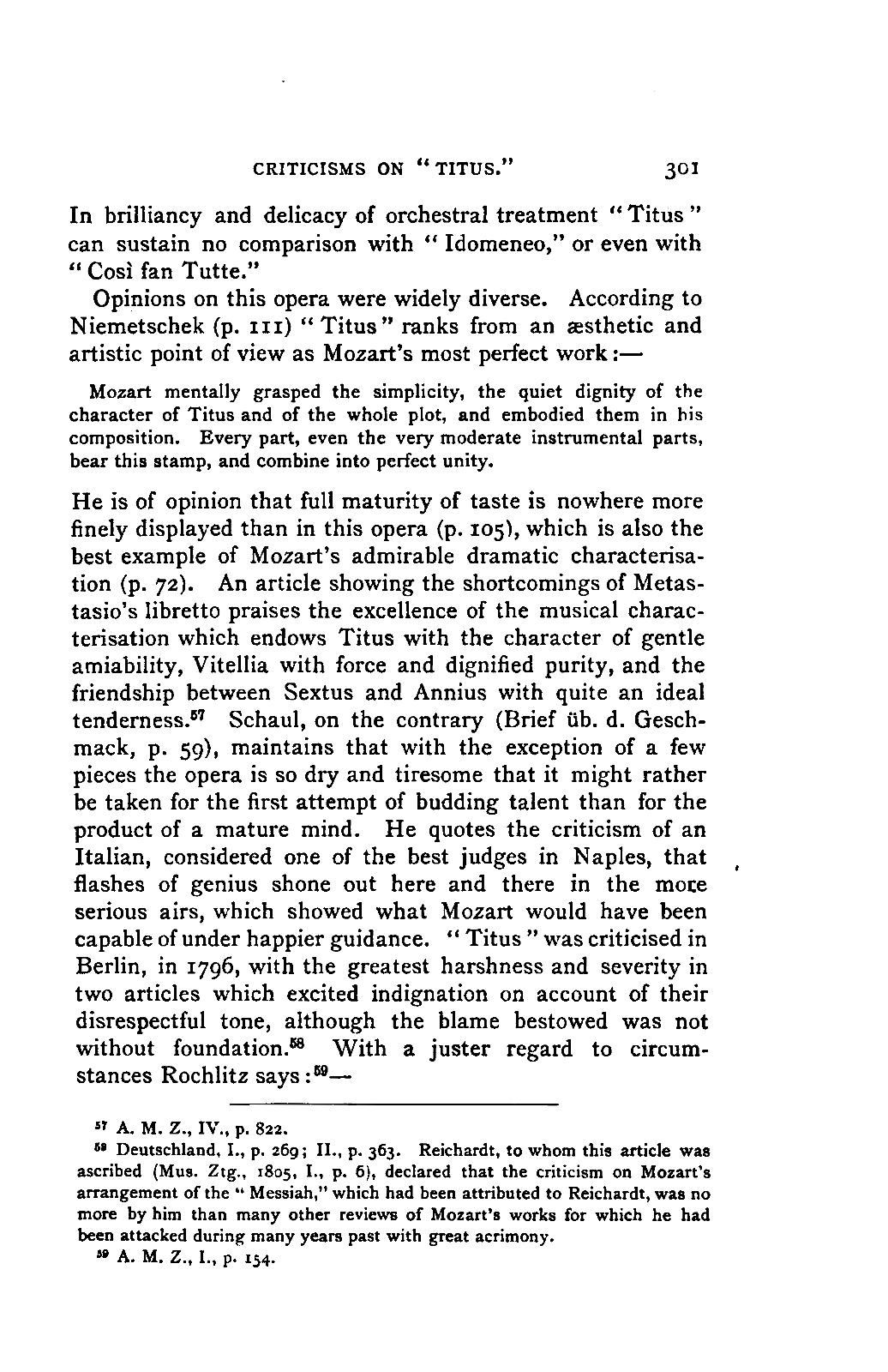 Any difference of opinion as to this work at the present day can only exist with regard to minor details, and it will scarcely now be asserted by any one that "a piece may be recognised as Mozart's by its rapid succession of daring transitions." 15 We are accustomed to take our standard from Beethoven, and it seems to us almost incredible that a contemporary of Mozart's, the Stuttgart Hofmusicus, Schaul (who acknowledged, it is true, that he belonged to a time when nothing was heard but Italian operas and musicians), should exclaim: 16 —