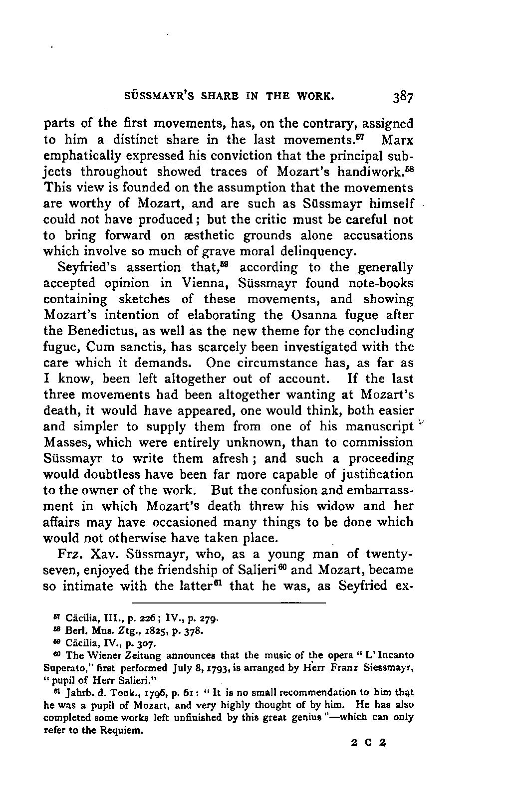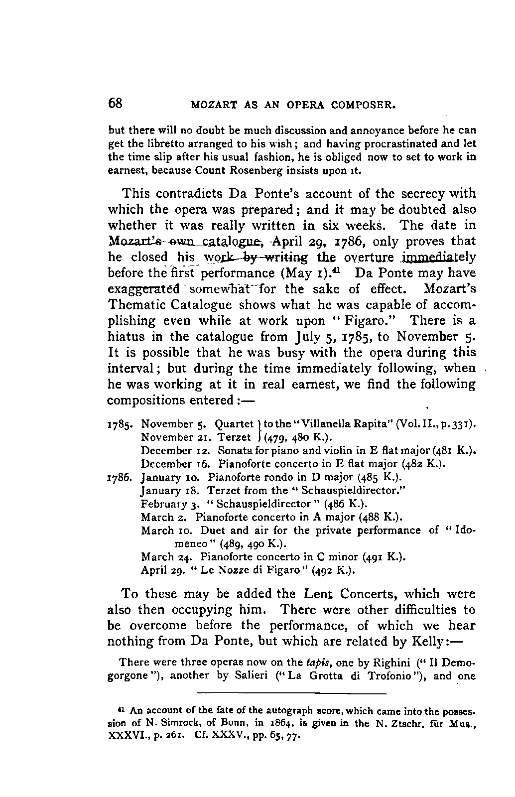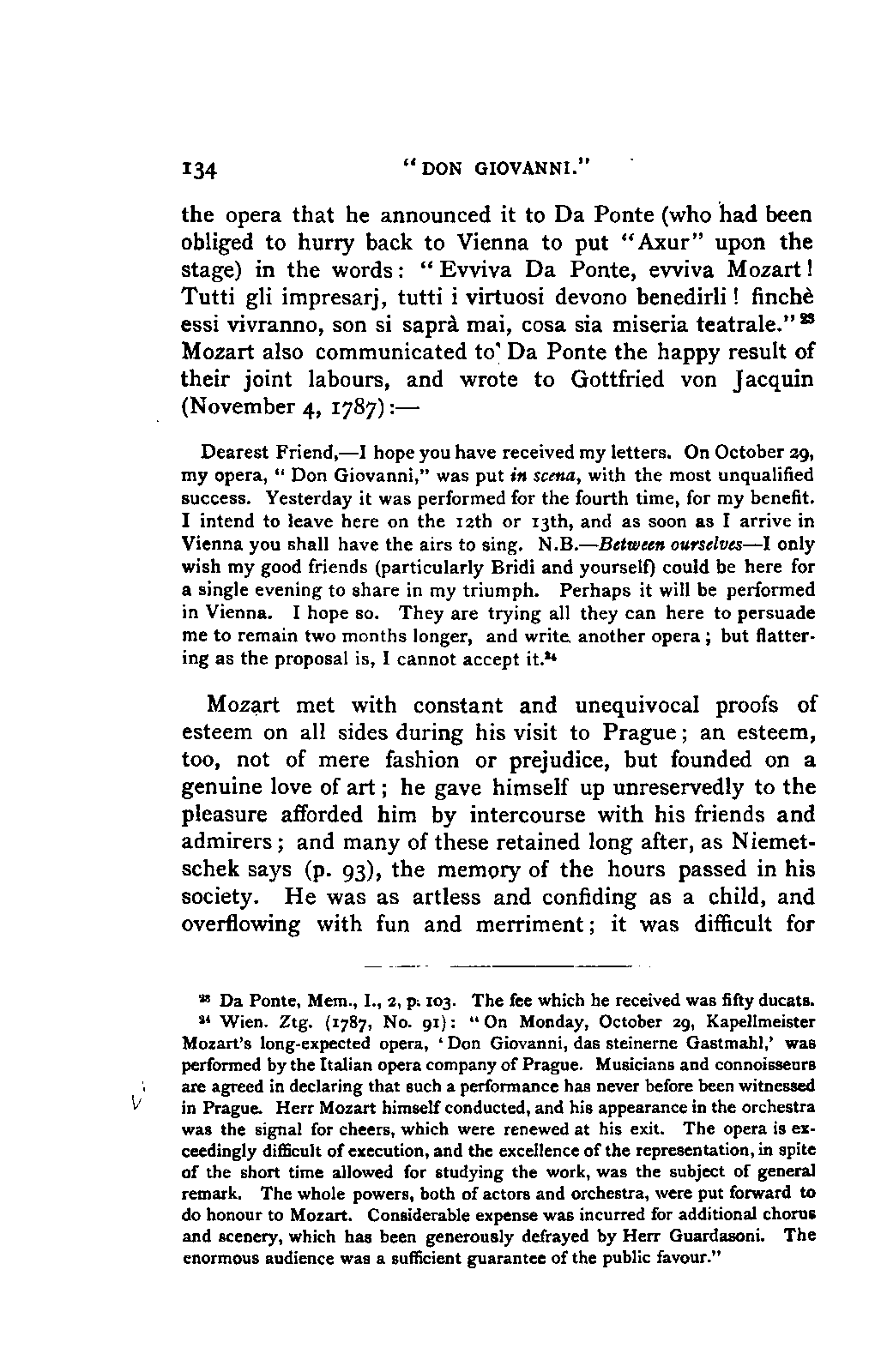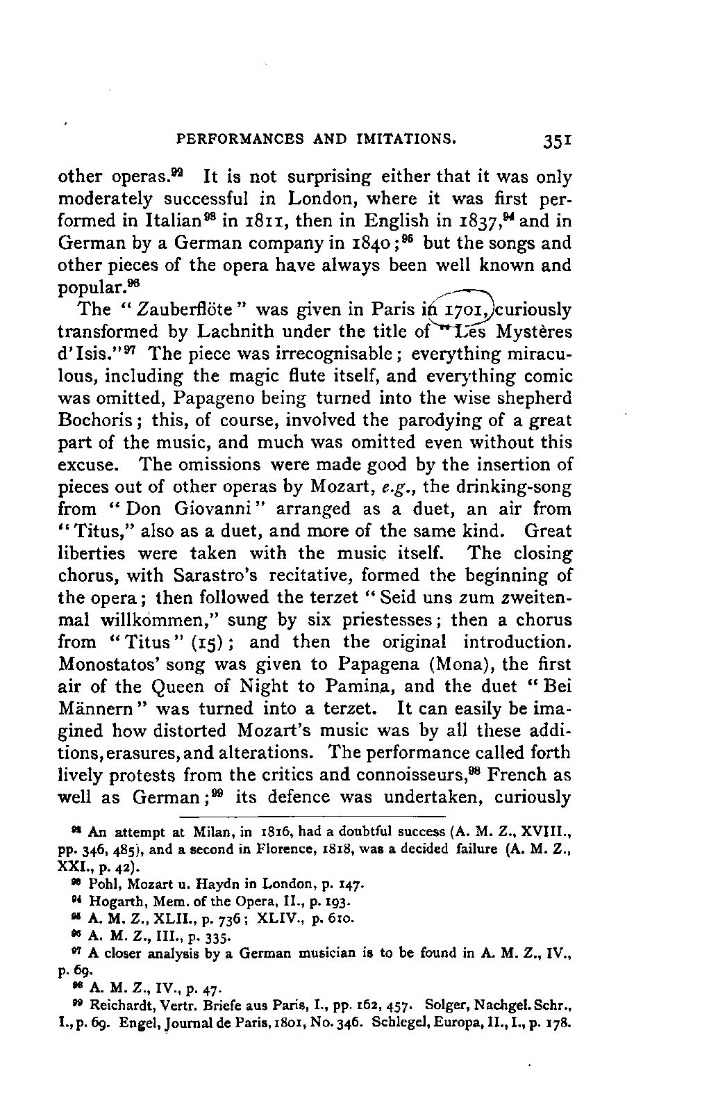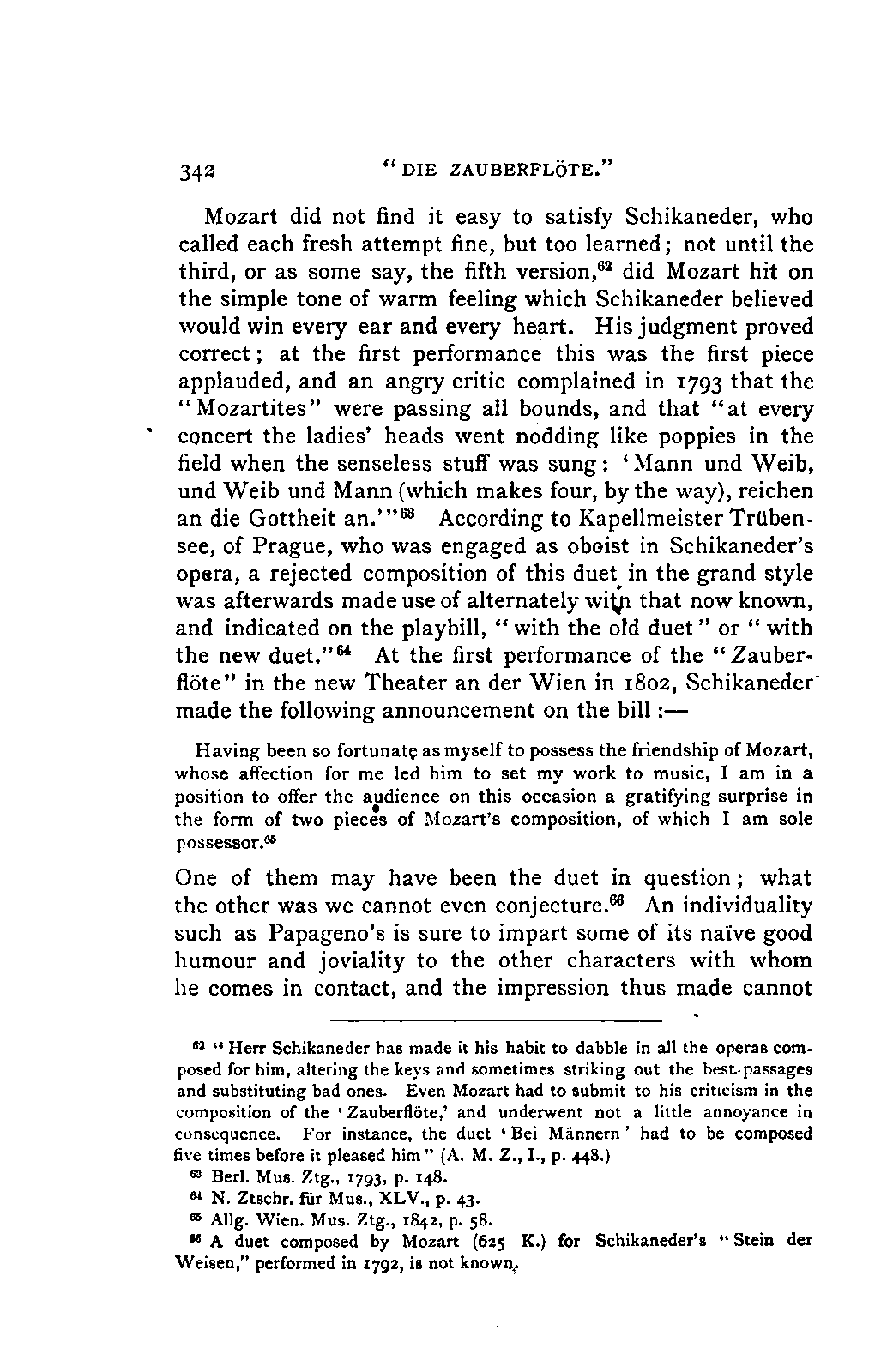 Any difference of opinion as to this work at the present day can only exist with regard to minor details, and it will scarcely now be asserted by any one that "a piece may be recognised as Mozart's by its rapid succession of daring transitions." 15 We are accustomed to take our standard from Beethoven, and it seems to us almost incredible that a contemporary of Mozart's, the Stuttgart Hofmusicus, Schaul (who acknowledged, it is true, that he belonged to a time when nothing was heard but Italian operas and musicians), should exclaim: 16 —