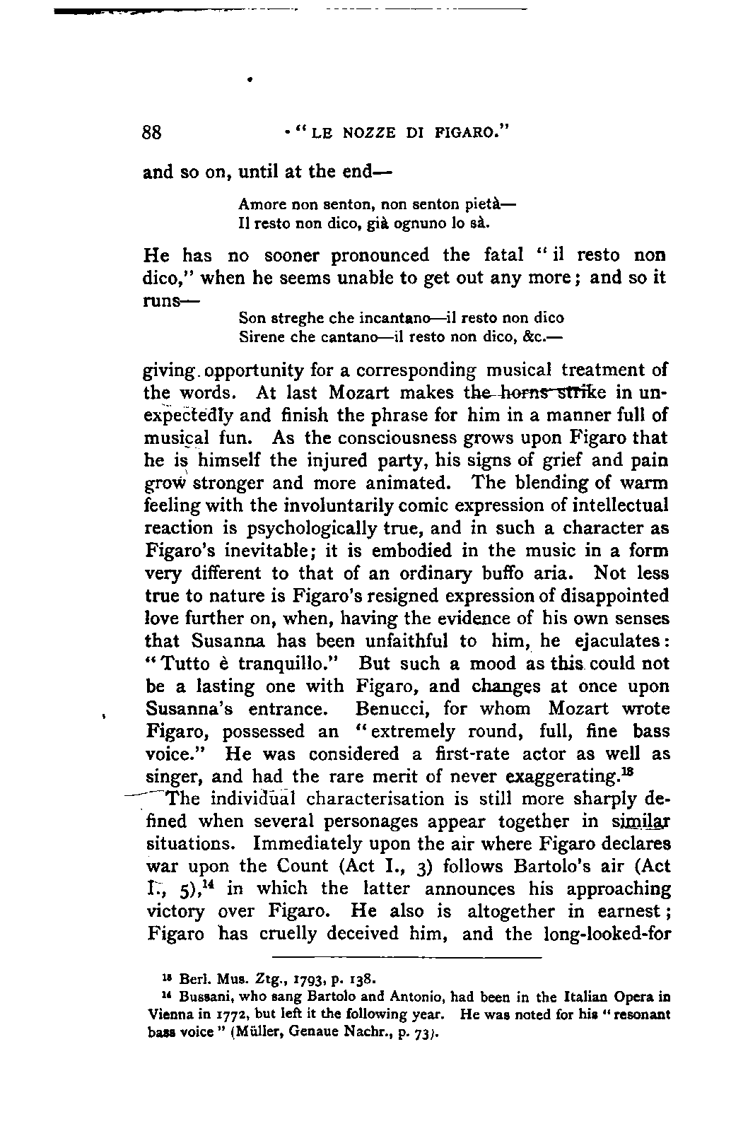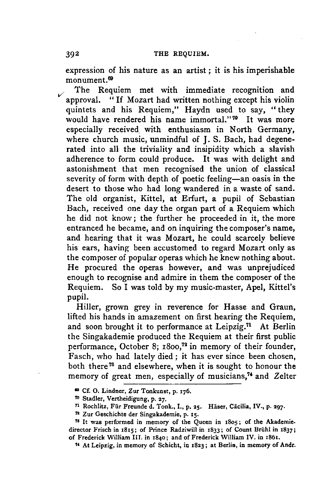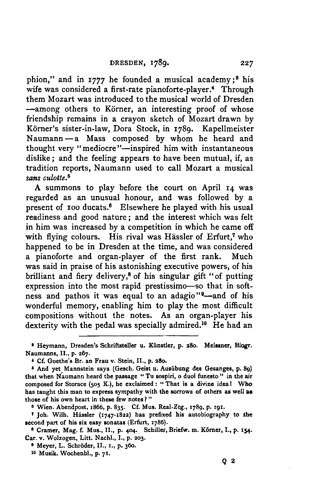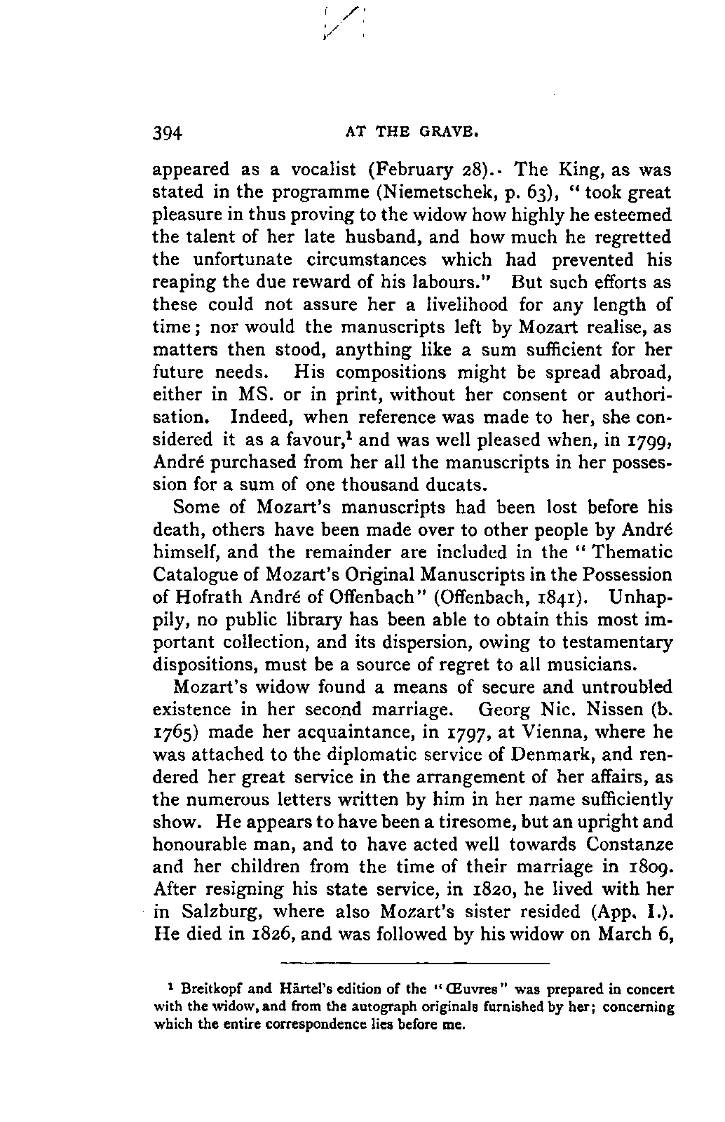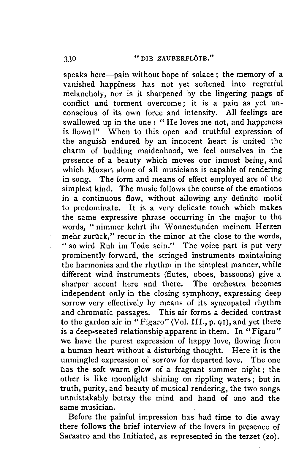 Any difference of opinion as to this work at the present day can only exist with regard to minor details, and it will scarcely now be asserted by any one that "a piece may be recognised as Mozart's by its rapid succession of daring transitions." 15 We are accustomed to take our standard from Beethoven, and it seems to us almost incredible that a contemporary of Mozart's, the Stuttgart Hofmusicus, Schaul (who acknowledged, it is true, that he belonged to a time when nothing was heard but Italian operas and musicians), should exclaim: 16 —