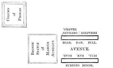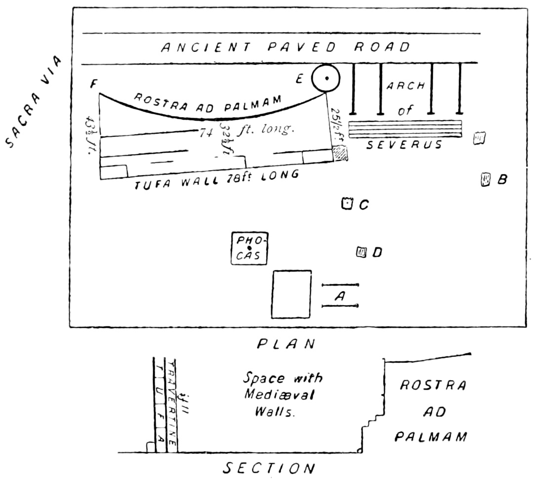 Page 45. Plan.—A is the Shrine of Janus. B, Inscription to Constantinus II., 357 A.D. C, Pedestal to Statue of Constantine (Eusebius, E. H., ix. 9, "Life of Constantine I.," 40 and 48). D, Inscription to Arcadius, Honorius, and Theodosius.