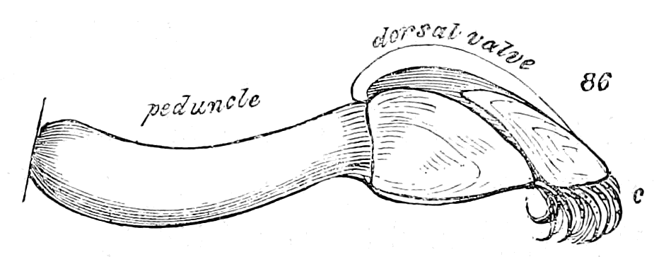 The same may be said respecting the bivalves; for besides the principal portions or valves of which the shell is composed, there are in many species, one or two smaller separate portions, named "accessary plates" by some authors. They are fixed by means of cartilages, on the back of the hinge.—The engraving, fig. 7, represents the accessary valves of a species of Pholas, which was on this account arranged by Linnæus with the Multivalves. Nearly allied to the Pholades is a set of shells to which De Blainville has given the name "Tubicolæ," or inhabitants of tubes. In this case, the bivalve shell is connected with a testaceous tube or pipe, to which it is attached either by one or by both valves, or in which it lies attached only by the cartilages of the animal. In the genus Aspergillum, the two small valves are soldered into the sides of the tube in such a manner as to constitute a part of it. One of these shells, called the Water-spout, might be taken up by a person not aware of its real nature, and regarded as a pipe or tube prettily fringed, and nothing more; but upon a closer examination, he would find the two valves, the points of which are visible from the outside of the tube.