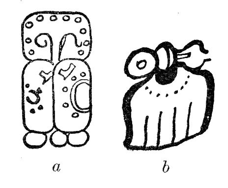 [226] This Secondary-series number is doubly irregular. In the first place, the kin and uinal coefficients are reversed, the latter standing to the left of its sign instead of above, and in the second place, the uinal coefficient, although it is 14, has an ornamental dot between the two middle dots.