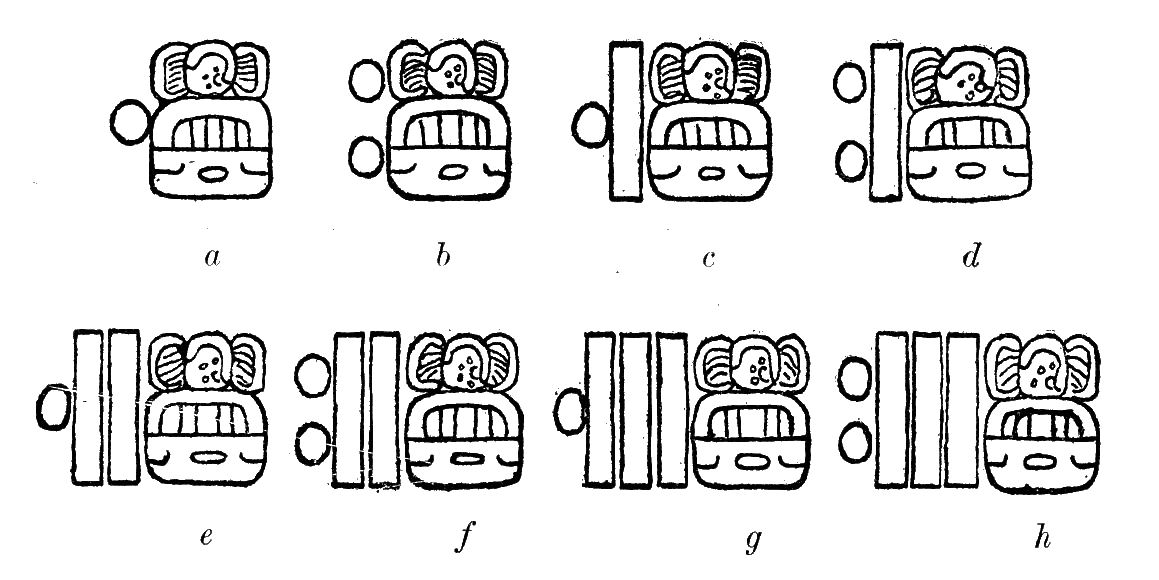 [221] The student will note that the lower periods (the tun, uinal, and kin signs) are omitted and consequently are to be considered as having the coefficient 0.