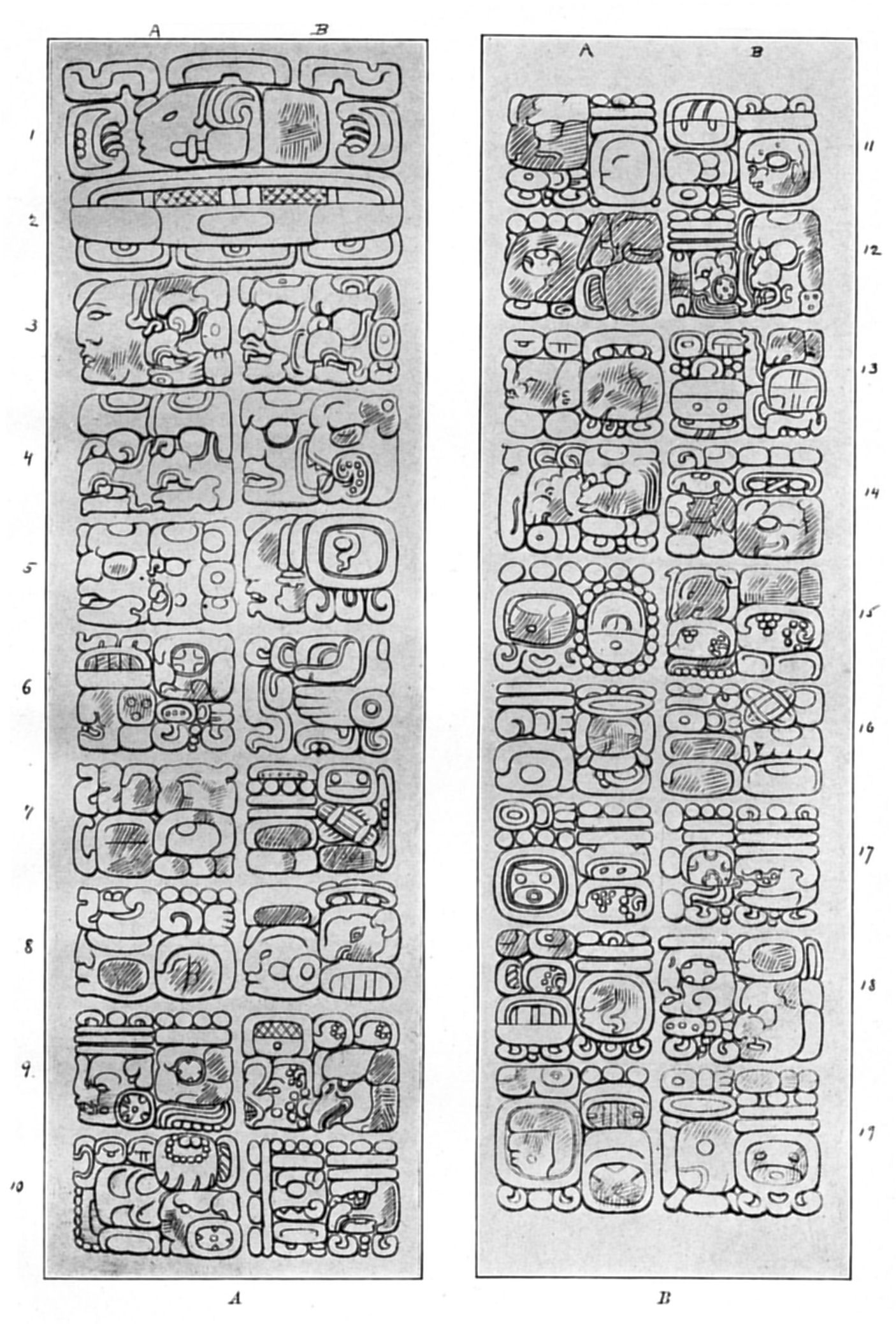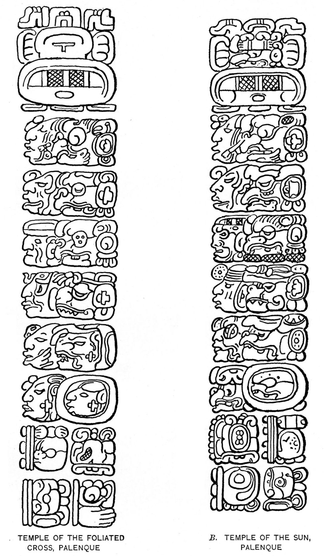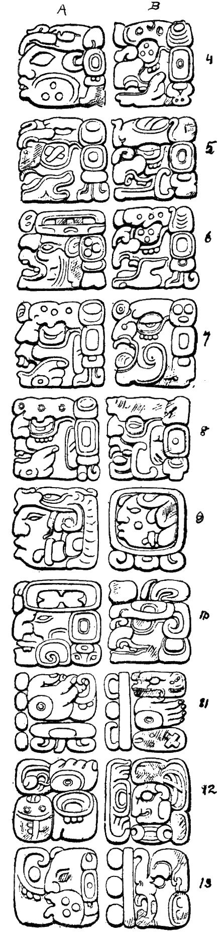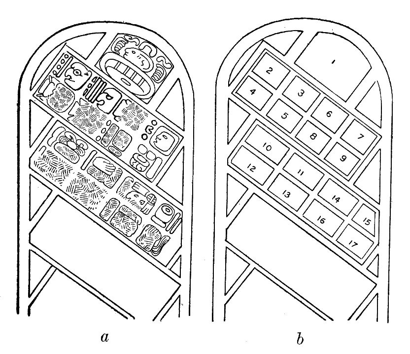 [198] For the full text of this inscription see Maudslay, 1889-1902: II, pls. 37, 39, 40. For convenience in figuring, the lower parts of columns A and B are shown in B instead of below the upper part. The numeration of the glyph-blocks, however, follows the arrangement in the original.