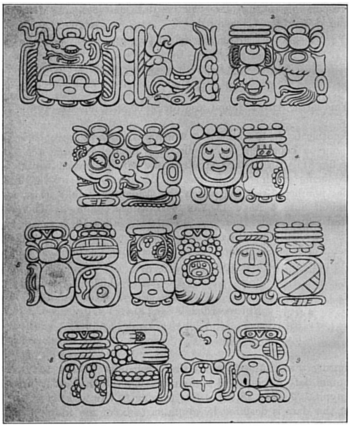It must be admitted that very little progress has been made in deciphering the Maya glyphs except those relating to the calendar and chronology; that is, the signs for the various time periods (days and months), the numerals, and a few name-glyphs; however, as these known signs comprise possibly two-fifths of all the glyphs, it is clear that the general tenor of the Maya inscriptions is no longer concealed from us. The remaining three-fifths probably tell the nature of the events which occurred on the corresponding dates, and it is to these we must turn for the subject matter of Maya history. The deciphering of this textual residuum is enormously complicated by the character of the Maya glyphs, which for the greater part are ideographic rather than phonetic; that is, the various symbols represent ideas rather than sounds.