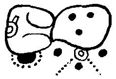 Of these 9, 13 and 17-20 are wholly effaced and 14 for the most part. The very first group refers to human sacrifice, for 1 is a head with an axe affixed to it, 2 contains the hand (i) which so often appears as the sign of grasping, especially in representations of the chase; here it has the same superfix as on page 22a, which on pages 4a-10a and 11a, b, appears as prefix. 3 is the {57}head of god H, perhaps given here as a symbol of wounding (serpent god?). I am unable to explain the meaning of the dot between two crosses in front of this head; perhaps the sign denotes the day Kan, which is here arrived at by calculation. We find the same hieroglyph on page 3. Sign 4 signifies the death-god A = Cimi, who appears again in 12.