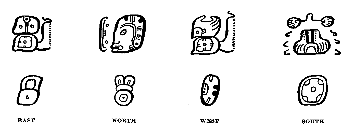 Besides the picture, this page contains only 15 hieroglyphs in three horizontal rows. Only about six of these signs are decipherable. The second, third and fourth of the lower line are three different heads; the middle is the familiar head of god B, the one on the left has the Akbal eye and the abbreviated sign for the south, which is repeated in the affix; the head on the right has the sign for the west as a prefix. Very little more is to be said of the other hieroglyphs than that the second and third of the second line have the sign for the east; the first of the {266}second line, however, was the one which we found on pages 71-73 as the constant companion of the Bacabs and which suggested the wind. The last sign of the second line must have contained that for north, so that the four cardinal points all came together here.