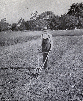 The actual planting of the garden is a simple matter, provided a definite plan has previously been made, so that no time is lost in deciding which vegetable to plant first, where to plant it, or how much to plant. In the home garden, only a small amount of seed of each kind is planted, so that a seed drill cannot be used to advantage, and the planting is therefore almost invariably done by hand. For the small vegetables, sown in drills, the planting involves four distinct operations: (1) making the drills, (2) dropping the seed, (3) covering, and (4) firming. The most rapid way of making the drills in a garden to be planted in long rows is to use a marker that makes three or four drills each time it is drawn across the area to be planted. With a medium weight marker, and the soil in proper condition for planting, the marks will be of the proper depth for planting seeds of any of the smaller vegetables usually [13]sown in drills. For peas or beans a deeper drill may be made with the plow attachment of a wheel hoe. After the seed is dropped, it is covered with a rake, or in the case of deep planting, with a hoe, or a wheel hoe. The soil is firmed over the seed by the use of the feet, the back of a hoe, or a garden roller. Whatever the means employed, the firming must be thorough, especially in light soil or dry weather; for unless the soil is brought in close contact with the seeds, they will not germinate.—(U. Ill. B. 154.)