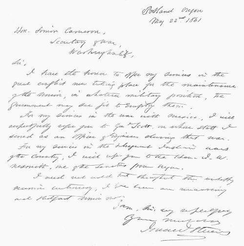 [15] Governor Alexander S. Abernethy writes the following anecdote of Governor Stevens. Meeting him just before starting East, the governor said that he had told the Southern gentlemen, with whom he had been associated in the Democratic Executive Committee and in the convention, that, if a war should result from the action they had taken, he would be found supporting the government against them. “And,” said he, “I am going to Washington at once, and shall offer the President my sword and my services as long as this war shall last.”