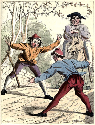 Now the miller got on the donkey in front of his son, to whom he whispered not to weigh too heavily on the poor beast’s back, and they got on for some distance in peace. But it was not to last long, for when the donkey happened to stumble, from kicking against a stone, there was a general outcry: “They want to kill the poor beast. Is there no one to interfere? But it’s one comfort that cruelty to animals can be punished. Who’ll inform against these two big brutes? Why either of them is strong enough to carry the poor little thing, instead of breaking its back, as they are doing with their weight.”