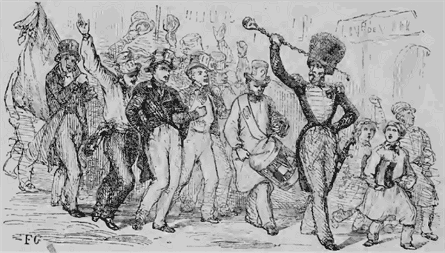 Après le tirage, les jeunes gens ont en général l'habitude de placer sur le devant de leur chapeau le numéro qui leur est échu au sort, et de l'attacher avec des rubans de diverses couleurs, le plus souvent tricolores. Puis ceux de la même commune se réunissent et retournent ensemble chez eux, bras dessus bras dessous, chantant, criant, marchant au pas, tambour en tête. Tout le long de la route ils font de fréquentes stations, arrosées de libations nombreuses, ceux-ci en l'honneur de la chance qui les a favorisés, ceux-là pour s'étourdir et noyer dans le vin le chagrin d'avoir attrapé un mauvais numéro. Les uns et les autres, partis fièrement au pas du chef-lieu de canton, ne rentrent guère dans la commune que d'un pas plus que chancelant: ce qui a fait plaisamment donner à ces sortes de détachements d'apprentis militaires le nom trop bien mérité de compagnies des litres.