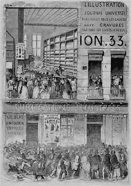 Mais peut-il y avoir un spectacle plus piquant que celui dont nous donnons ici même la représentation fidèle? Quoi de plus agréable que l'aspect de cette foule pressée, compacte, impatiente, haletante, qui assiège les bureaux d'abonnement de l'Illustration? Quoi de plus richement varié que cette collection de visages où chacun de vous, lecteurs aimables, a le droit de chercher le sien?...