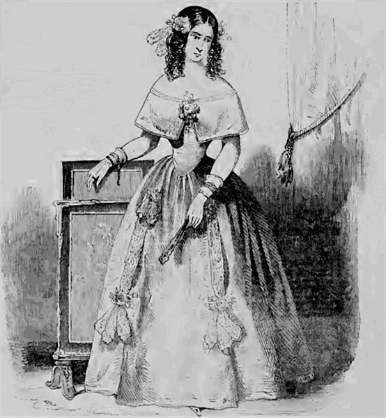 Les robes de soie, telles que damas, pékins satinés ou brochés, sont plus diverses de couleurs et de formes, quoique la dentelle en soit toujours le principal ornement. Ainsi, au bal du Château, les robes couvertes de deux volants de dentelle étaient en majorité; d'autres avaient des barbes de dentelle arrangées comme on peut le voir sur le modèle qu'en donne l'Illustration.