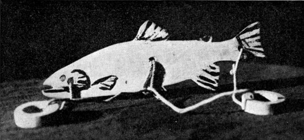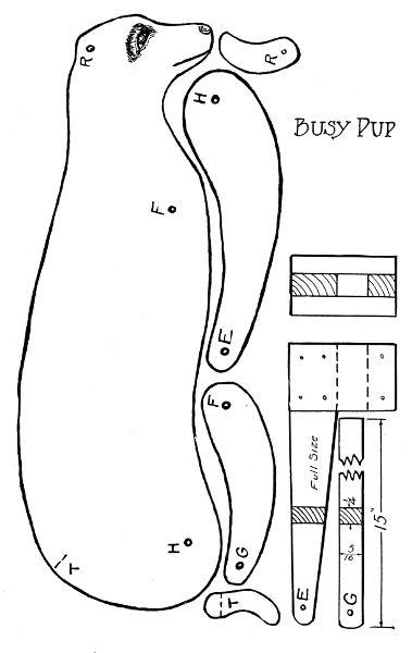 The body is composed of three thicknesses. The two on the outside are 1/4" thick, the one in between is 3/8" thick, and reaches only to the dotted line (Fig. 18), to allow room for the head which is 3/8" thick and moves between the two outside pieces with 1-1/4" nail as pivot. This is a loose joint.