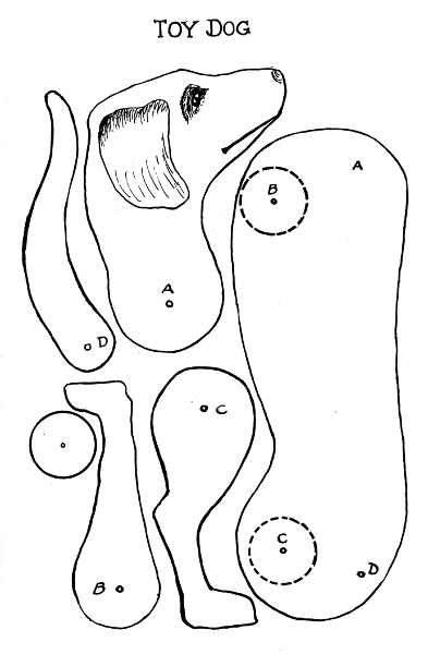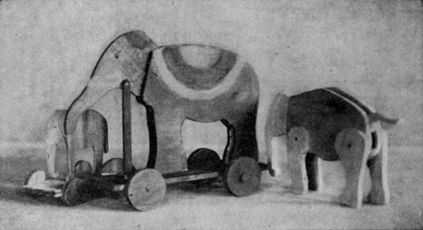Color the elephant gray, the blanket red and yellow, the platform and connecting rod red, and the wheels yellow. Fasten the platform to the[Pg 98] elephant by driving nails thru it into the feet. Press the wheels onto the axles and fasten the axles under the platform so they move freely. Fit head and rod in places so all connections are strong and move without friction. Attach a string to the front end of the platform, and when pulled on the floor, the elephant will swing his trunk up and down in a vicious manner.