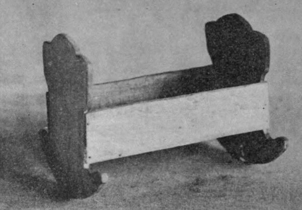 Two fore and two hind legs are required. The upper end of each leg is tapered off on the side that fits against the body so that the feet will be far enough apart to be fastened on the inside of the rockers (see end view B). Each pair of legs should be fastened to the body with a nail thru the three thicknesses at the place marked. Saw out two rockers and finish to true and smooth curves. With fine brad fasten the feet on the inside of the rocker at the places marked, but take care that the wood does not split. Saw out three rails 2" long and 3/8" wide to be fastened onto the top of the rockers with two fine brads, one at each end of the rocker and one in the middle, as indicated on the drawing by the letter R. The upper ends of the legs may now be secured to the body by two or three brads.