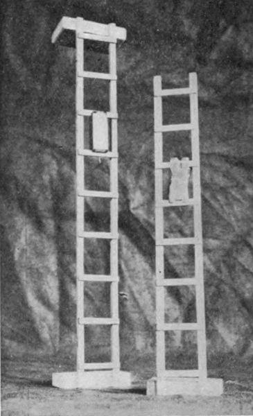 The body swings on a pivot between two uprights which we will call the wings. These wings are held apart by a piece between the feet, which is slightly thicker than the body to give the body freedom of motion.