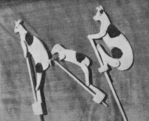 Saw out of 3/8" stock the bodies of the mule and rider (Fig. 19). All legs and arms are of 3/16" stock. Two circles to be placed between the man's arms and shoulders are of 1/4" wood. The connecting rod, marked Z, Z (Fig. 20), shown full size and of 3/8" stock, is to connect the fore legs of the mule and the crank on the axle. Fasten the legs to the mule and arms and legs to the rider with loose joints. Then take rod Z, Z, and make the fork-like cut in the wide end and drill a small hole thru it at right angles to that cut. This is for the nail that holds the crank in place. Fasten the rod securely between the fore legs of the mule at the position indicated. The tail is then fastened with two 1/2" brads. Paint the mule and rider in contrasting colors.