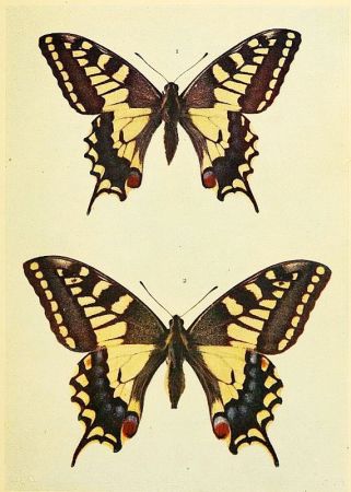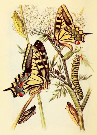 Butterfly eggs are of various forms, and whilst in some kinds the egg-shell (chorion) is elaborately ribbed or fluted, others are simply pitted or covered with a kind of network or reticulation; others, again, are almost or quite smooth. If the top of an egg, such as that of the Purple Emperor (Plate 28), is examined under a good lens a depression will be noted, and in this will be seen a neat and starlike kind of ornamentation. In the middle of this "rosette" are, present in all eggs, minute apertures known as micropyles (little doors), and it is through these that the spermatozoa of the male finds entry to the interior of the egg and fertilization is effected. The changes that occur in the egg after it is laid are of a very complex nature, and readers [Pg 2]who may desire information on this subject are referred to Sharp's "Insects," Part I., in the "Cambridge Natural History," where also will be found much interesting and instructive matter connected with the caterpillar and chrysalis, to which stages only brief reference can here be made.