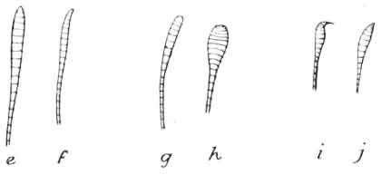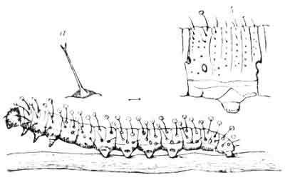 Turning again to the "feet" of the caterpillar, it will be seen [Pg 4]from the figure that the true legs (a) differ from the false legs (b) in structure. The former are horny, jointed, and have terminal claws; the latter are fleshy, with sliding joints, and the foot is furnished with a series of minute hooks which enable the caterpillar to obtain a secure hold when feeding, etc. The false legs are also the chief means of locomotion, as the true legs are of little service for this purpose. The true legs, however, appear to be of use when the caterpillar is feeding, as the leaf is held between them so as to keep it steady whilst the jaws are doing their work.