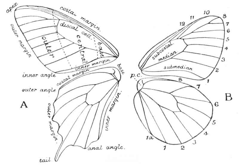 Butterflies belong to the great Order of insects called Lepidoptera (Greek lepis, a scale, and pteron, a wing), that is, insects whose wings are covered with minute structures termed scales. Moths (Heterocera) also belong to the same order, and the first point to deal with is how may butterflies be distinguished from moths? In a broad kind of way they may be recognized by their horns (antennæ), which are slender as regards the shaft, but are gradually or abruptly clubbed at the extremity. For this reason they were designated Rhopalocera, or "club horned," the Heterocera being supposed to have horns of various kinds other than clubbed. As a matter of fact this method of separating moths and butterflies does not hold good in dealing with the Lepidoptera of the world, and it is from a study of these, as a whole, that systematists have arrived at the conclusion that there is no actual line of division between moths and butterflies. In modern classification, then, butterflies are reduced from the rank of a sub-order, which they formerly held, and are now dovetailed into the various newer systems of arrangement between certain families of moths.